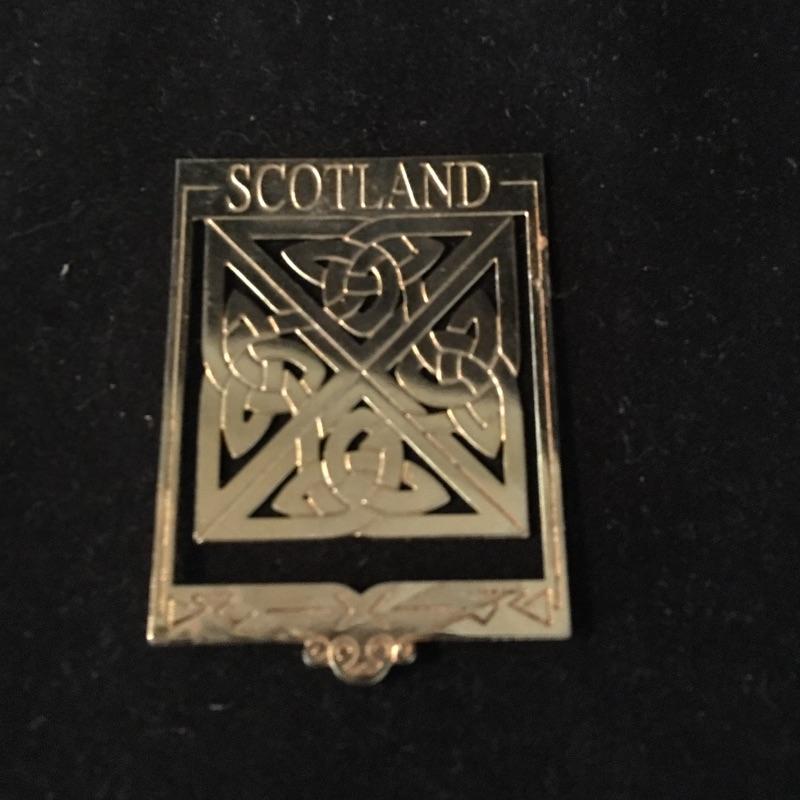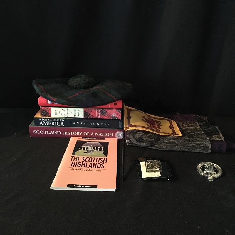 This Scottish array includes a Calzeat scarf, Scottish thistle pin and bookmark, Endure Fort pin, mini Scottish flag and five books on Scotland. Scarf measures 15” x 64”.