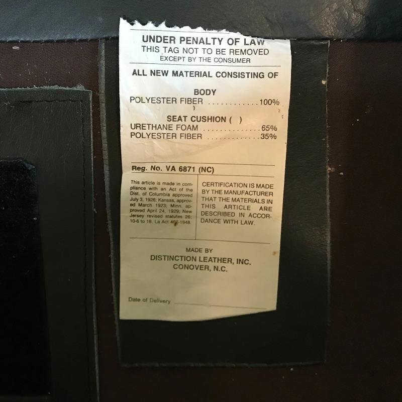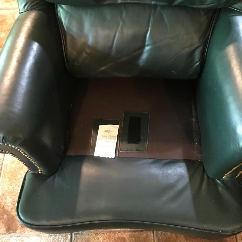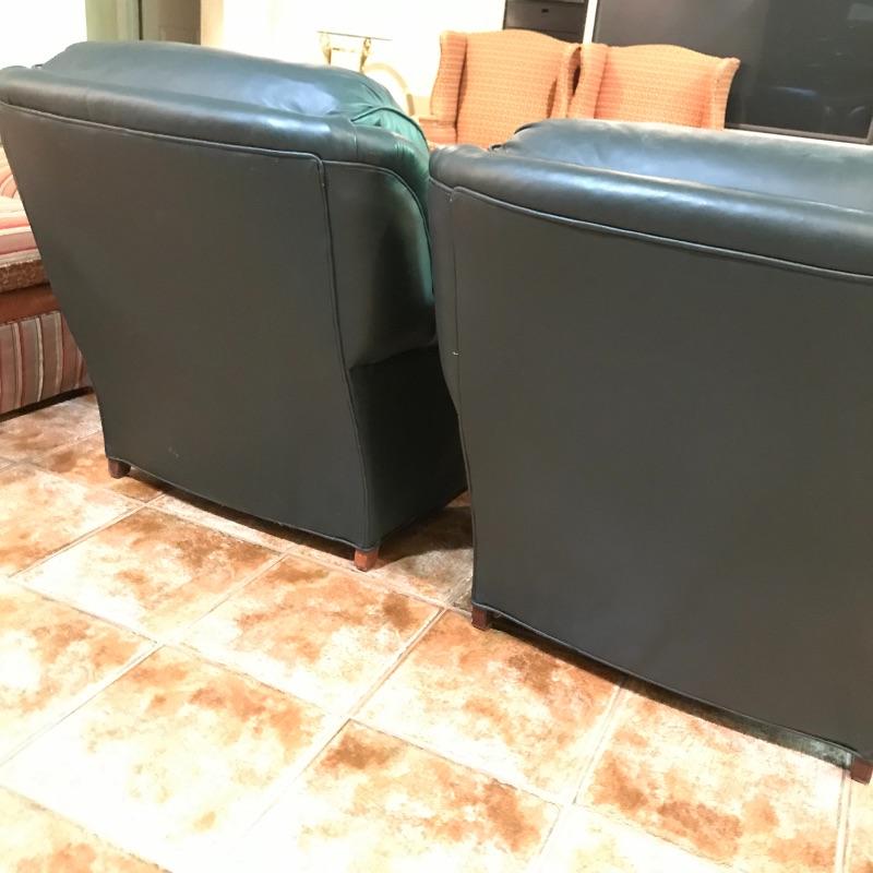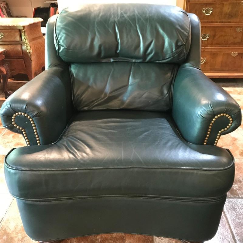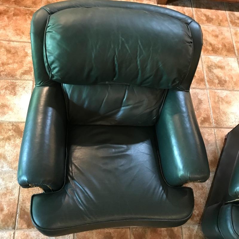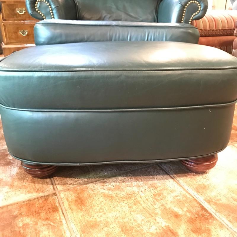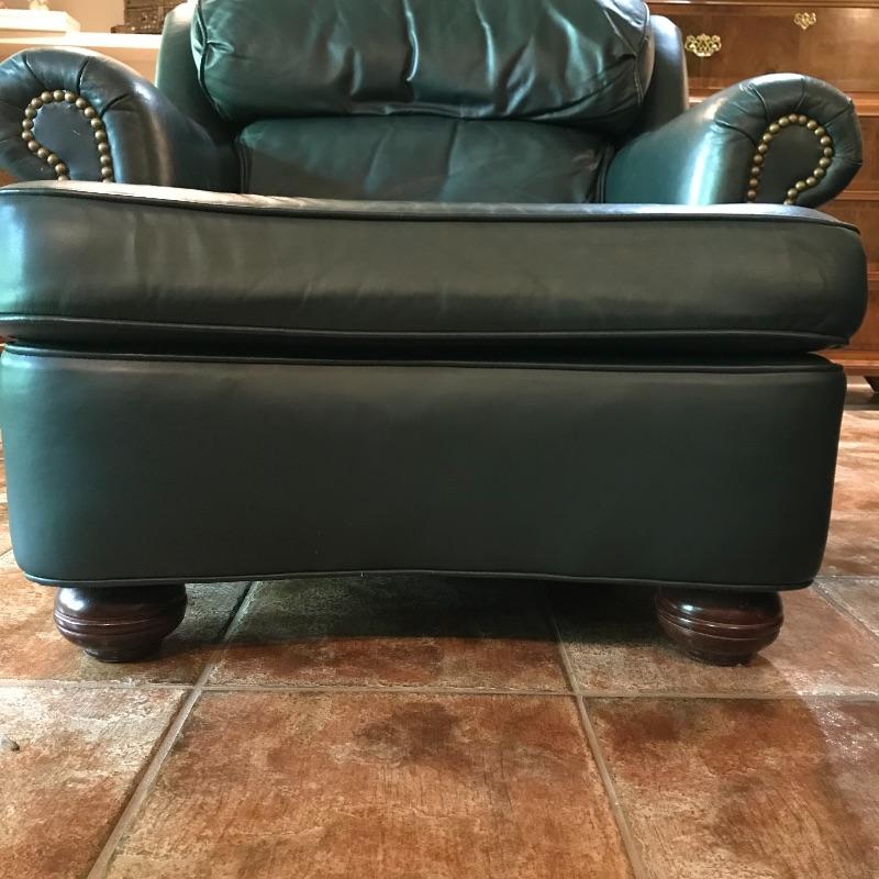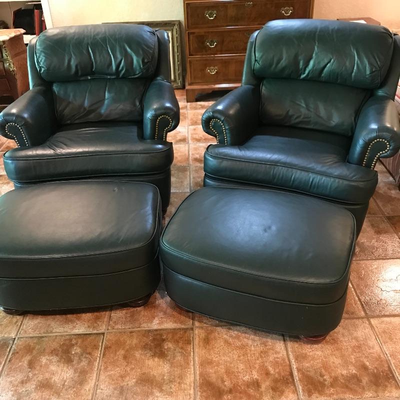 Two leather forest green club chairs with brass upholstery pins and sturdy wooden feet. They have the look and feel of leather, but we can not confirm. Manufacturer’s (Distinction Leather, Inc.) tag states polyester fiber. Chairs are comfortable and clean, measuring 31.5” x 33” x 34” with a seat height at 17”. The ottomans measure 28” x 21.5” x 14”. No shipping.