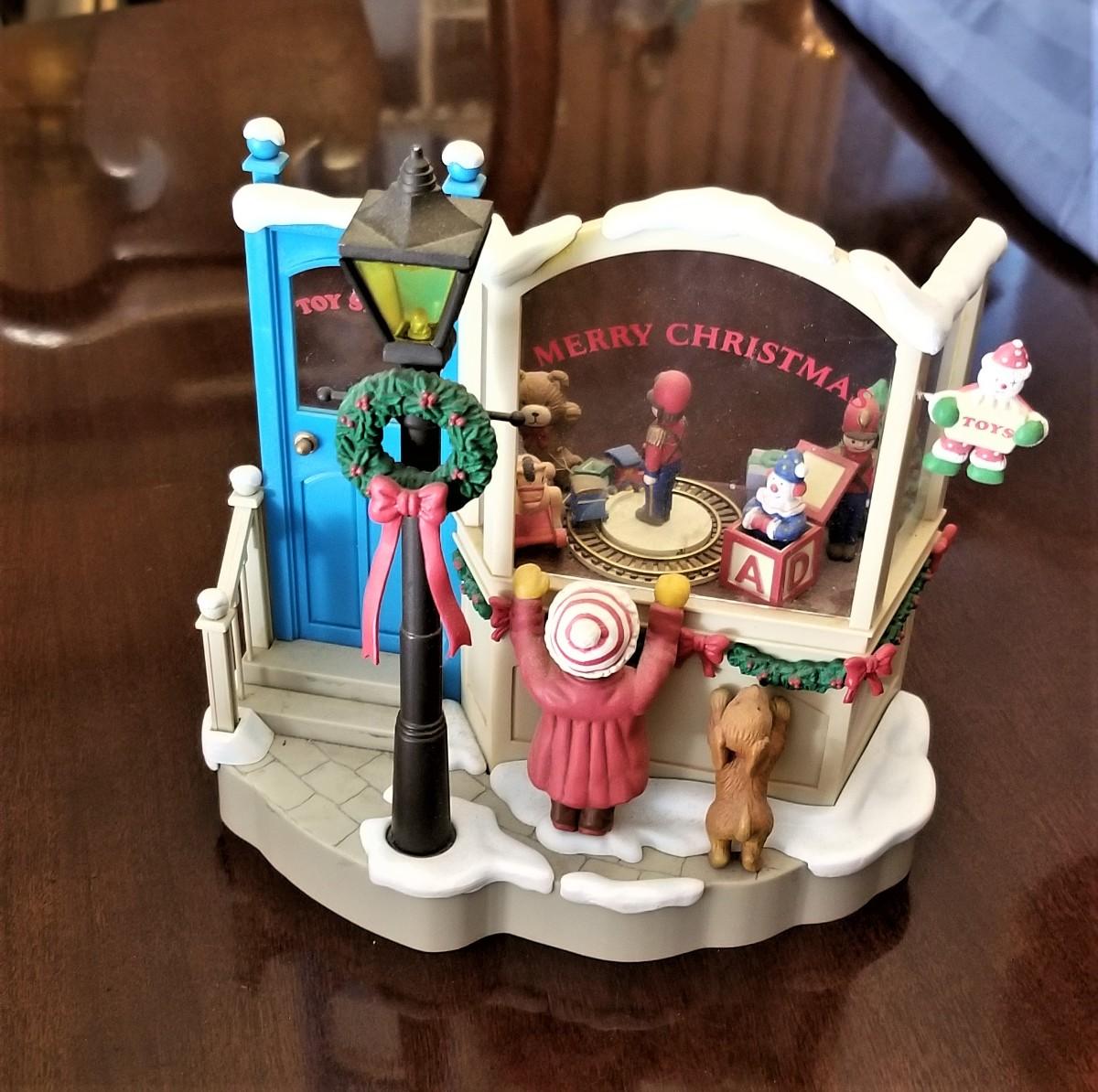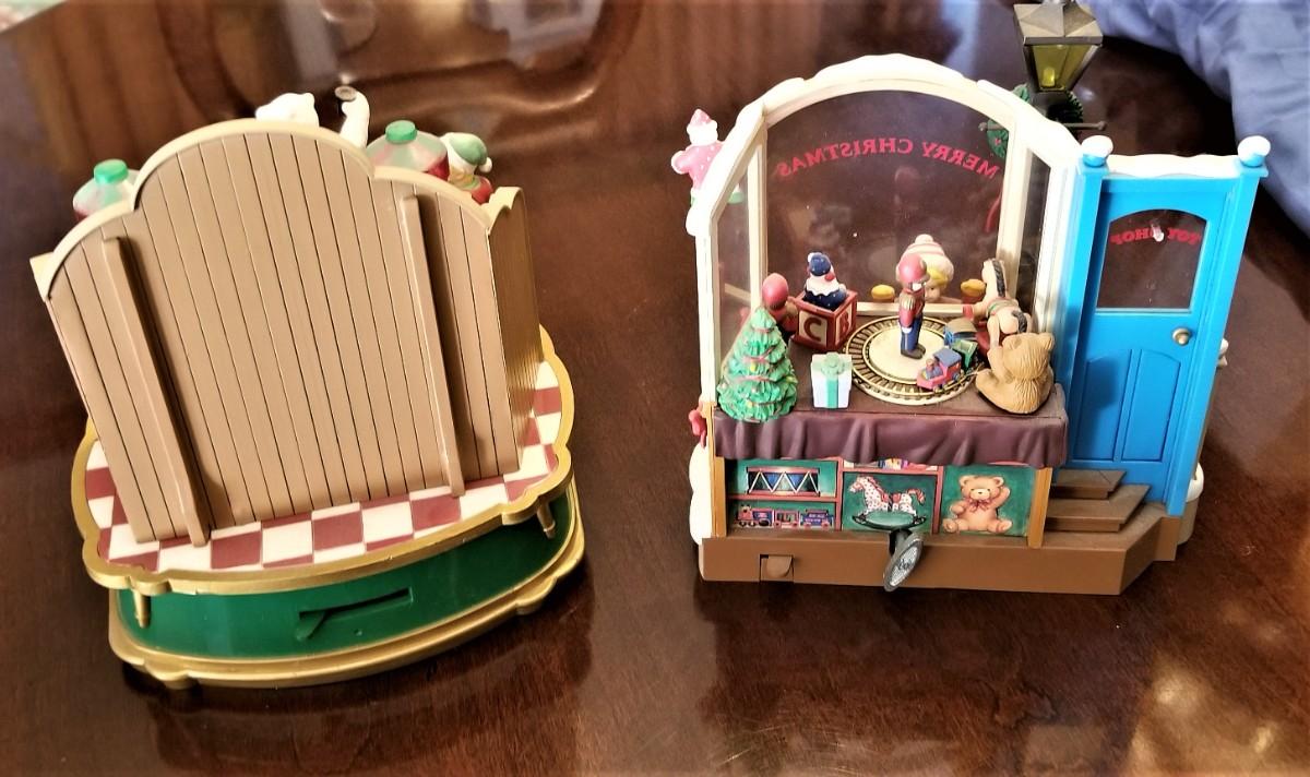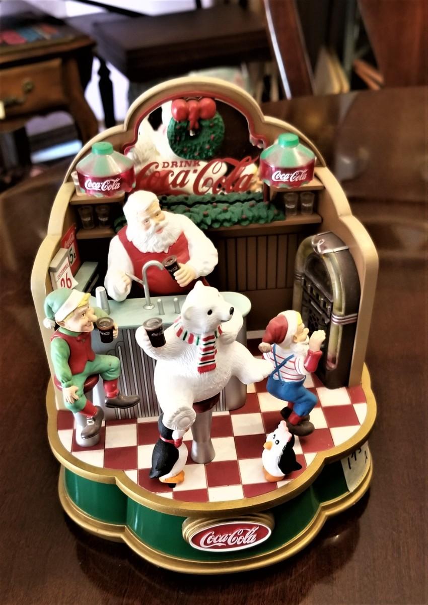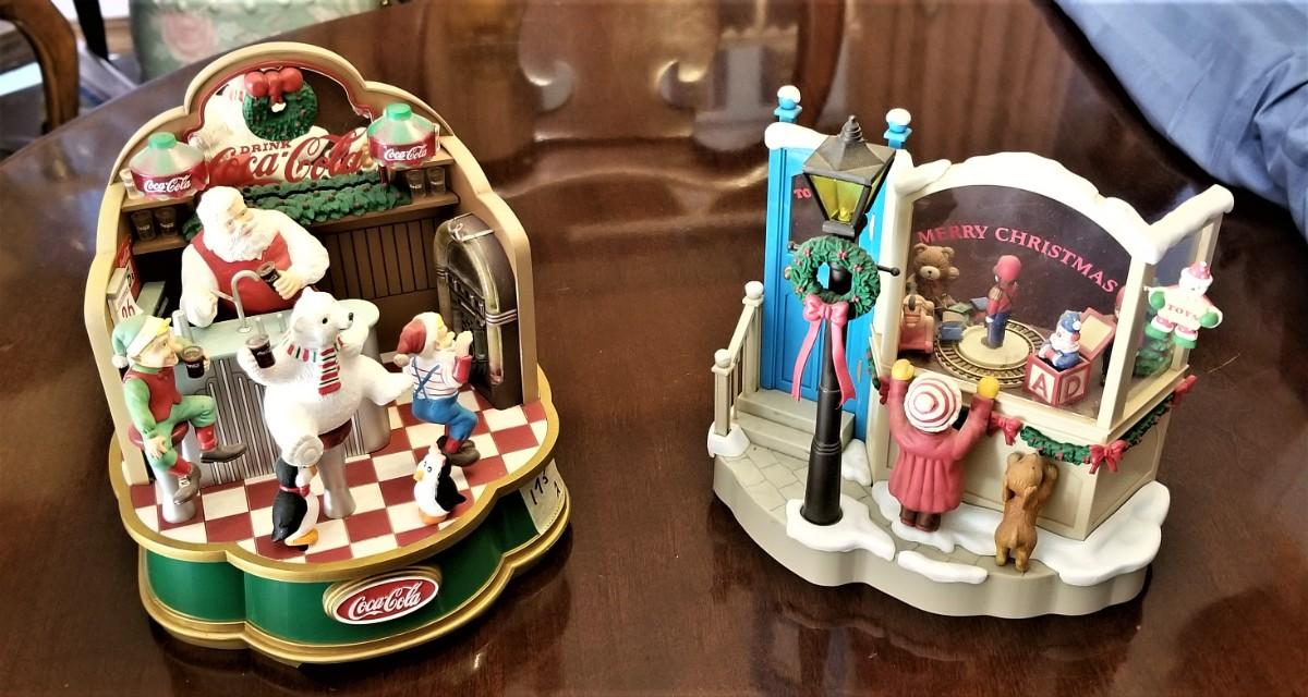 Two collectible Coca-Cola music boxes - Soda Fountain (6.5" tall), plays "I'd like to teach the world to sing" - elf dances - and a Toyland Scene (train moves) - 7" tall. No boxes. Neither has batteries, so we could not test the lights, but musix works.