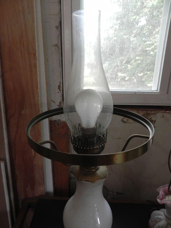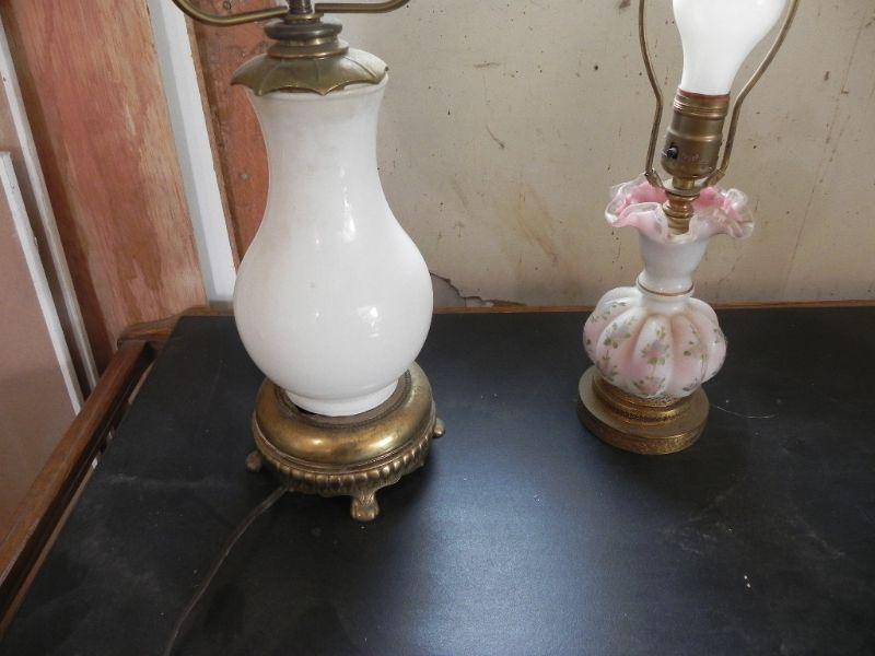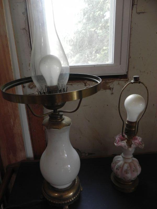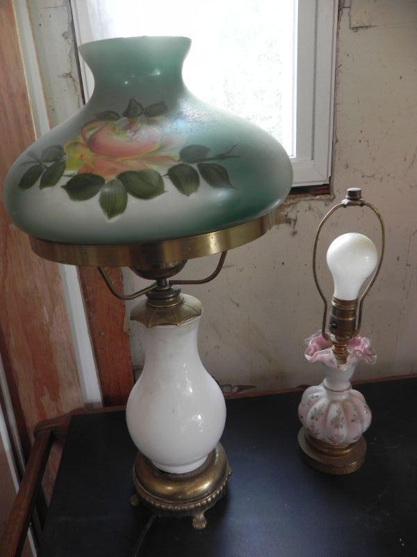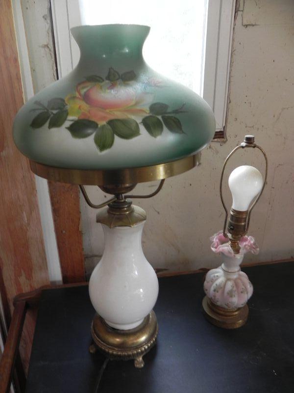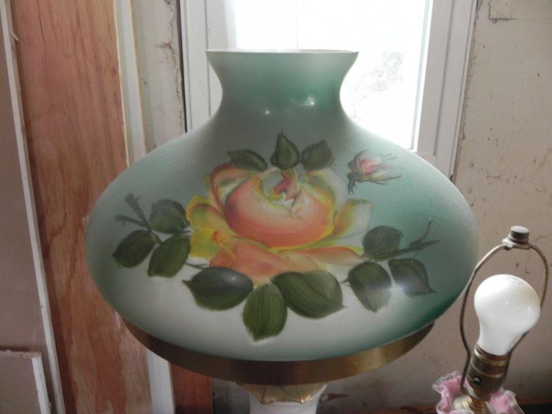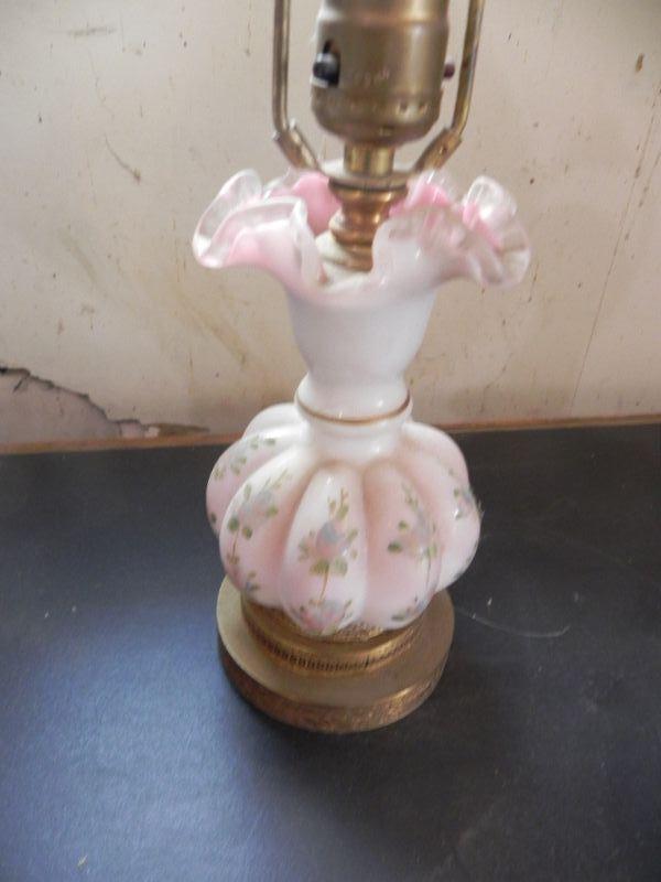 GLASS GLOBE/HURRICANE LIGHT WITH PAINTED FLOWERS ON SHADE AND PINK GLASS LAMP WITH PAINTED FLOWERS NO SHADE