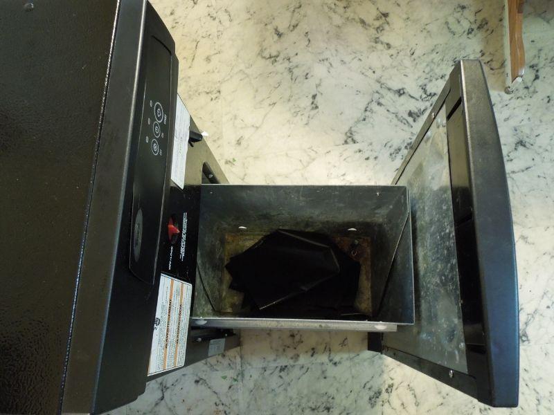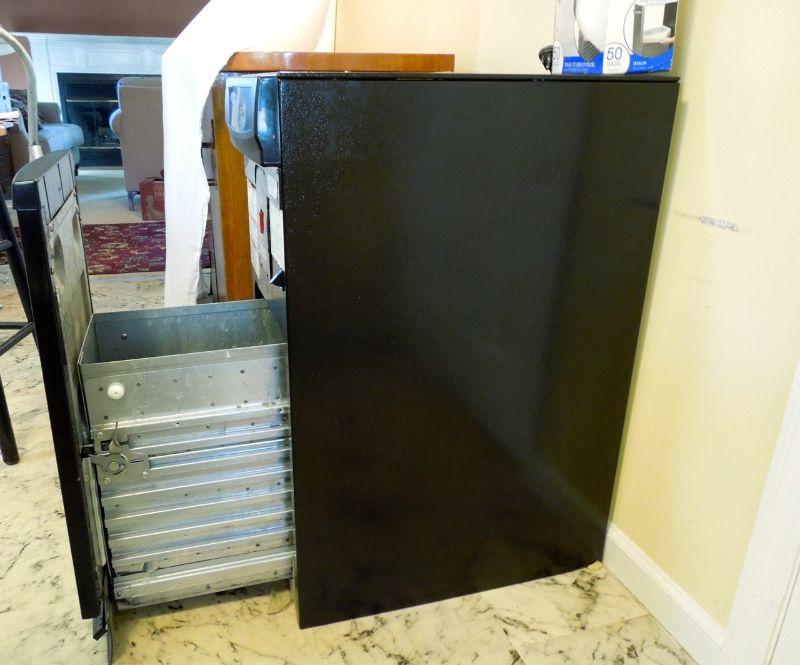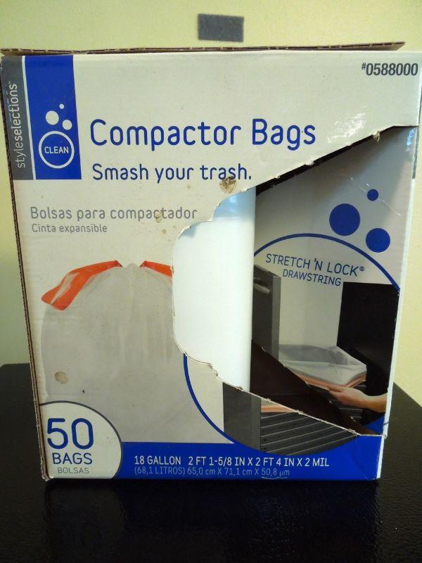 34" h x 15" w x 24" d working trash compactor with half box of bags.