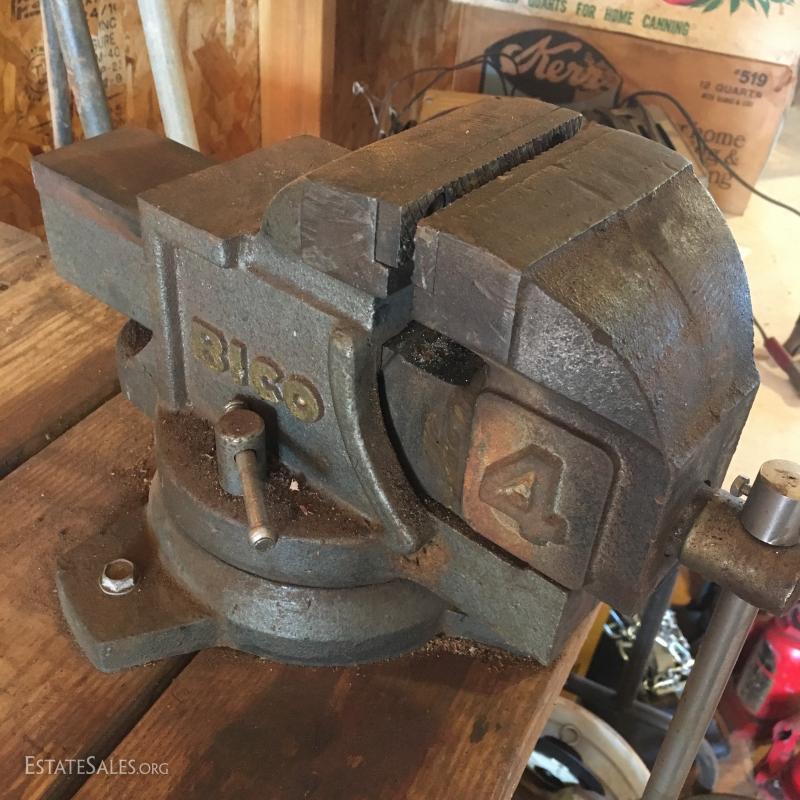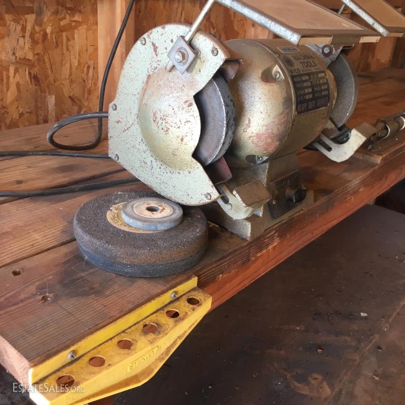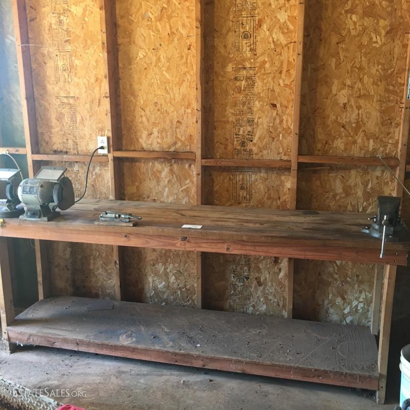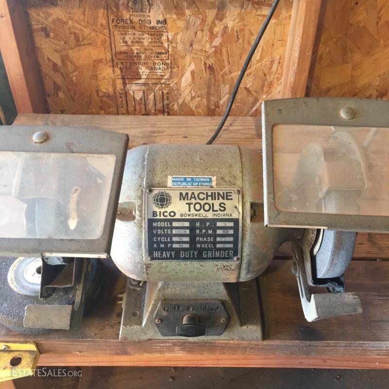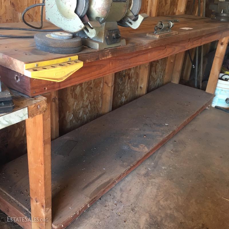 Workbench with Bico 4 bench vice, Bico Machine Tools Heavy Duty Grinder and small press mounted on top. Table measures 97”lx22.5”wx36”h has a lower shelf. Item available for local pick up only in Columbus, NC.