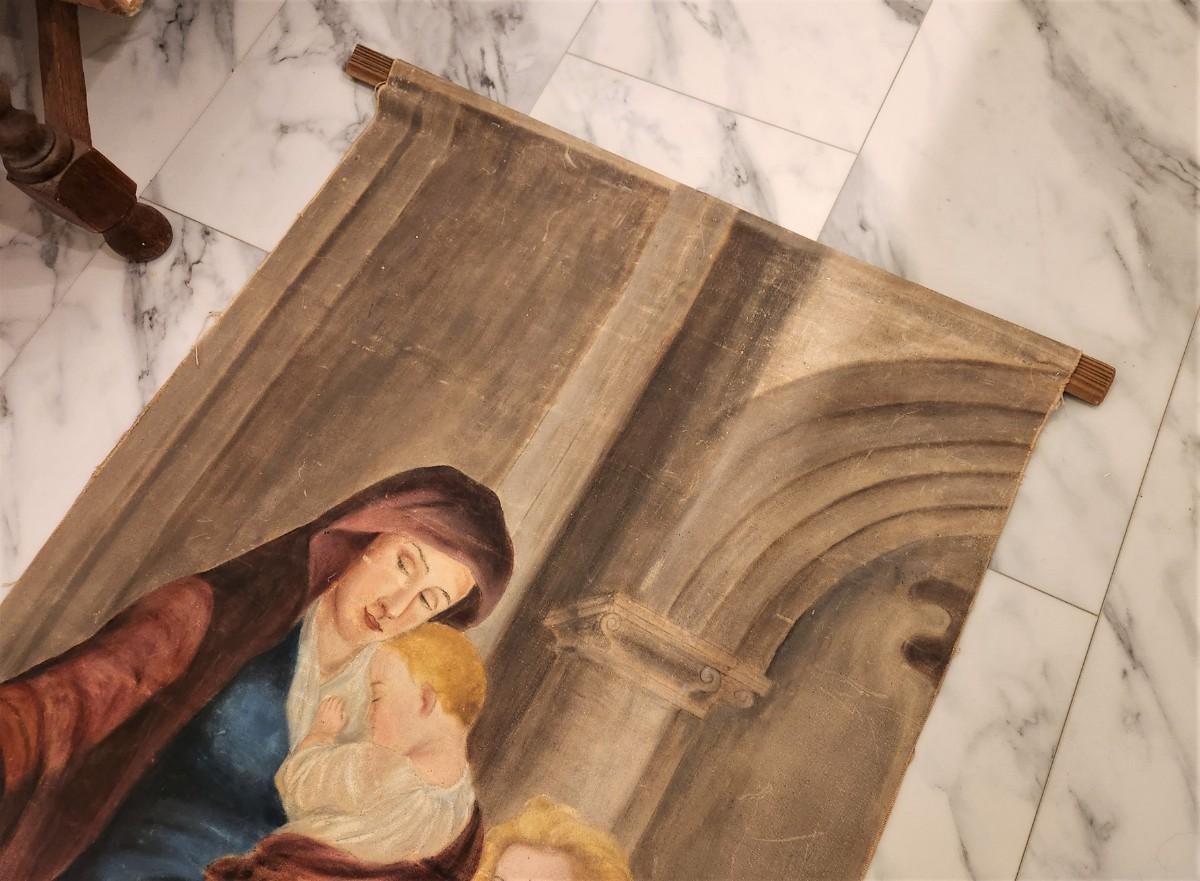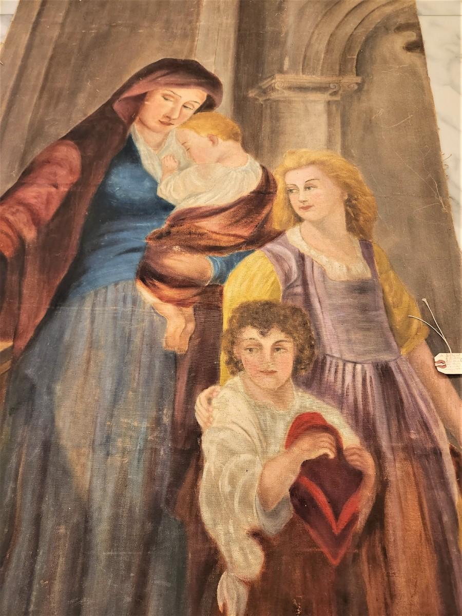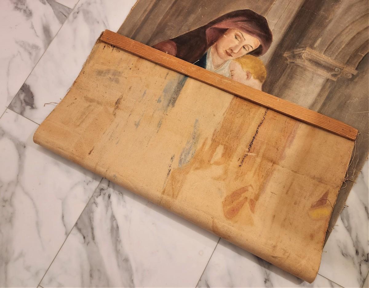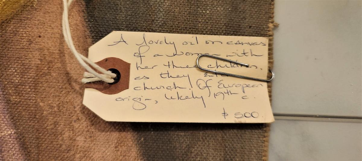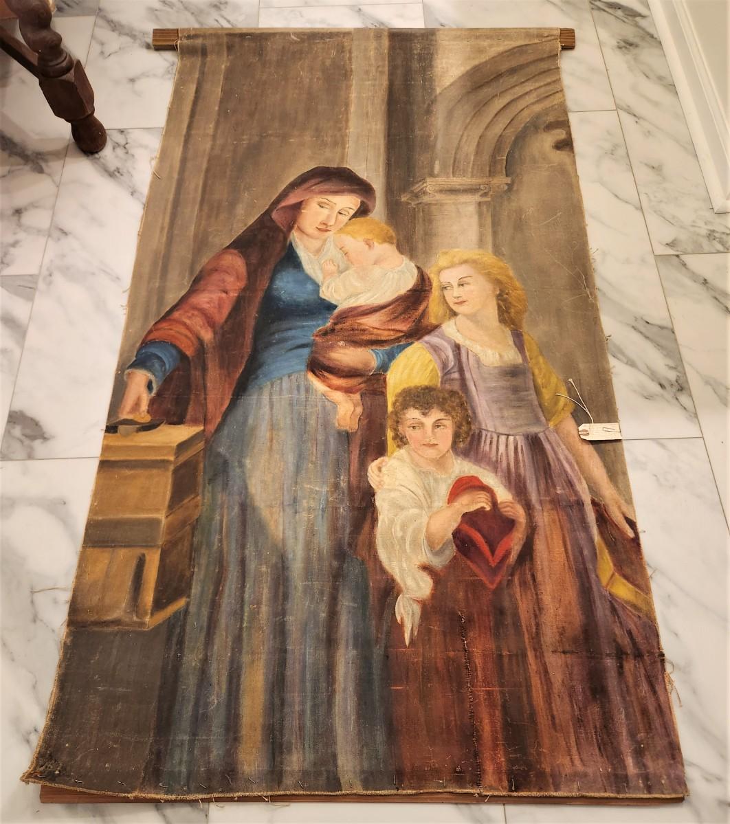 The tag on this piece reads: "A lovely oil on canvas of a woman with her children as they enter church. Of European origin, likely 19th century - $500.00". In this scene, the mother is putting her offering into the Poor Box before she enters the church. Tear in the canvas (at the bottom - with an old repair). Currently attached to two wooden stretchers and rolled. An interesting find. Anyone want?