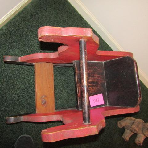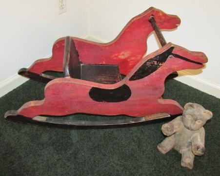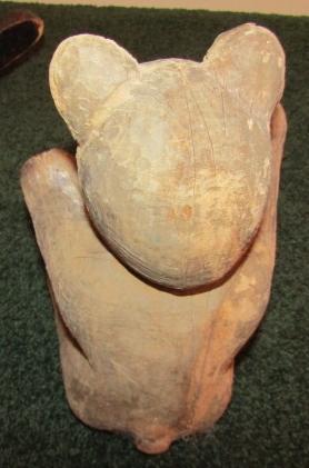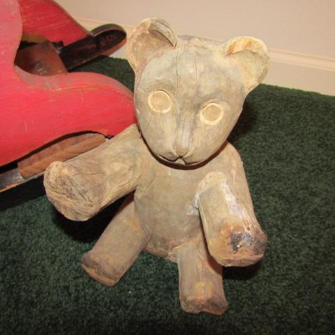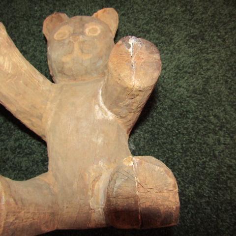 THE WOODEN TEDDY BEAR IS HAND CARVED AND STARTING TO SPLIT ON 1 SIDE (SEE PIC)