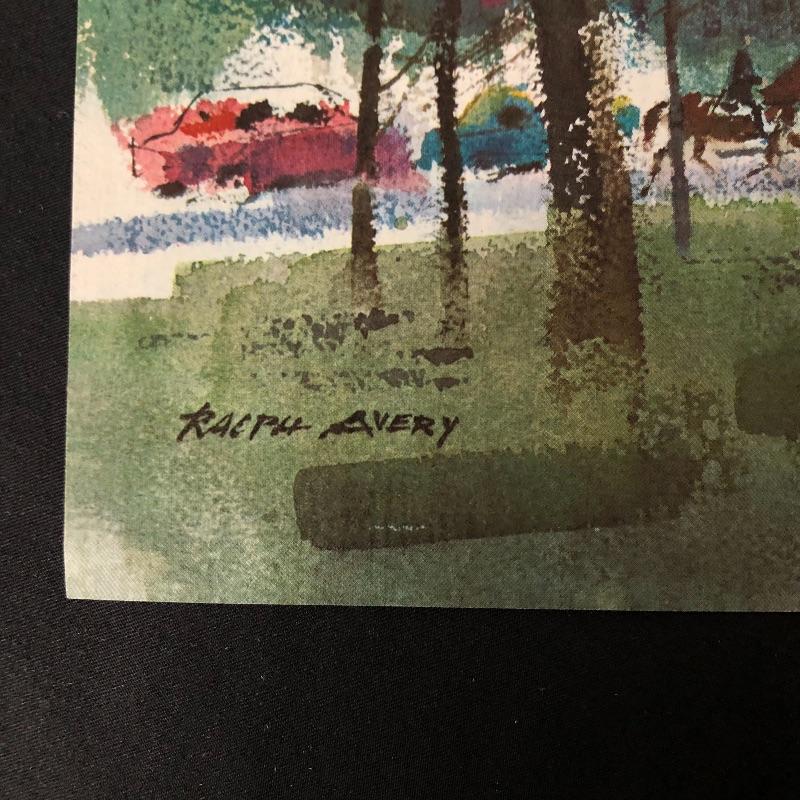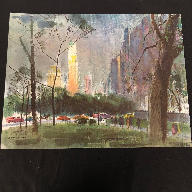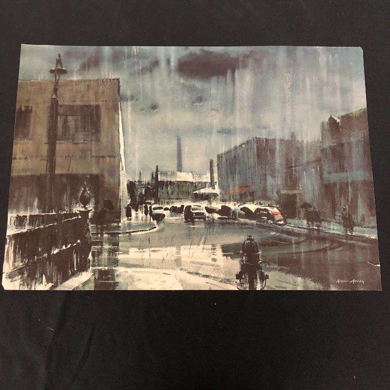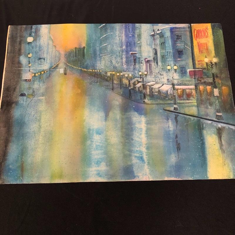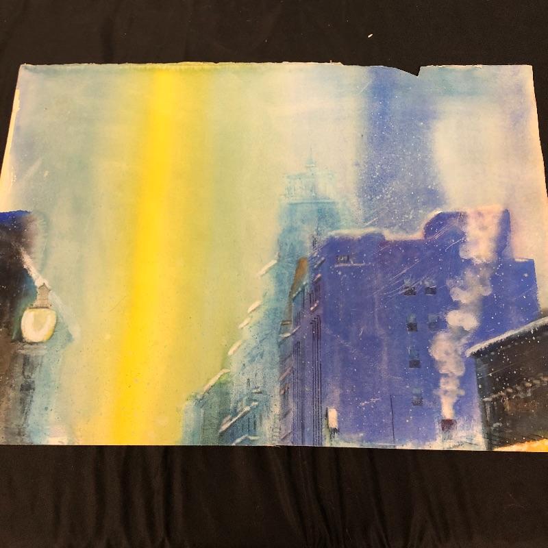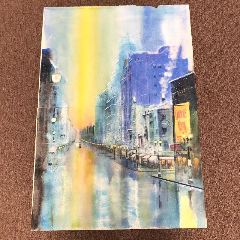 The first piece in this lot (26” x 33”) depicts a snowy city, and appears to be pastels, and is a 2-piece artwork. It is literally two pieces of paper that are the same size that when put together, it finishes the city scape. The second (14” x 11”) depicts a city on a river with a large bridge. The third (16” x 12.5”) depicts a rainy day at the park. The fourth 17.5” x 12”) also depicts a rainy street. The fifth (11” x 14”) shows a bright European street. Two of these have stickers on back that say Ralph Avery is the artist.