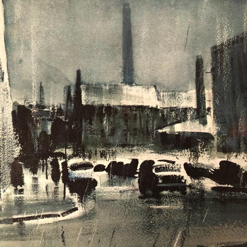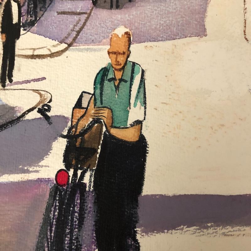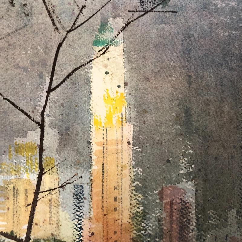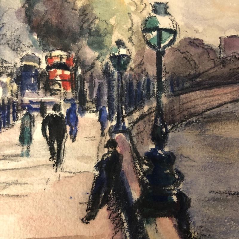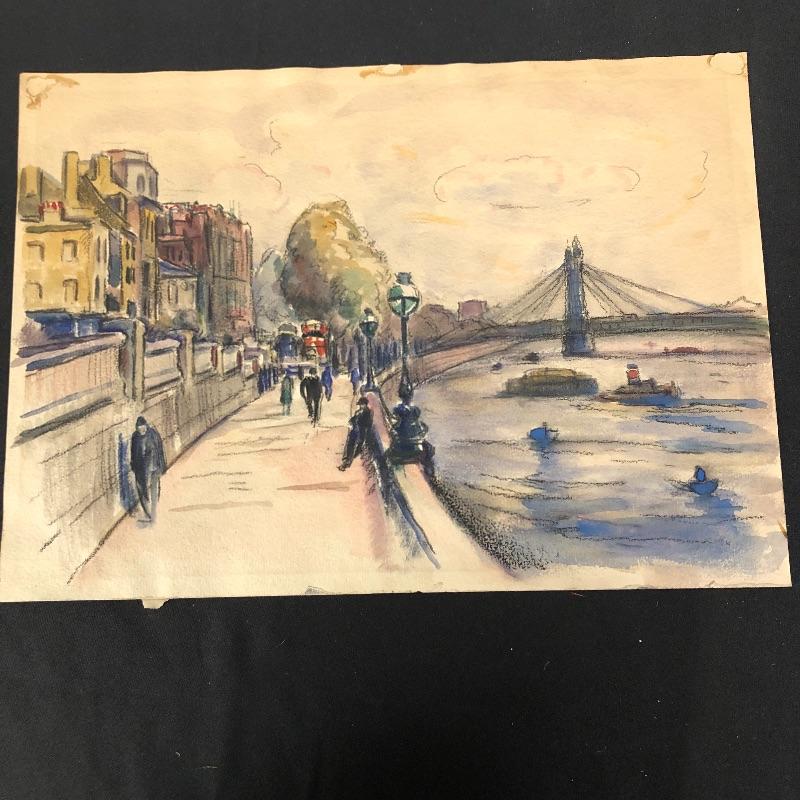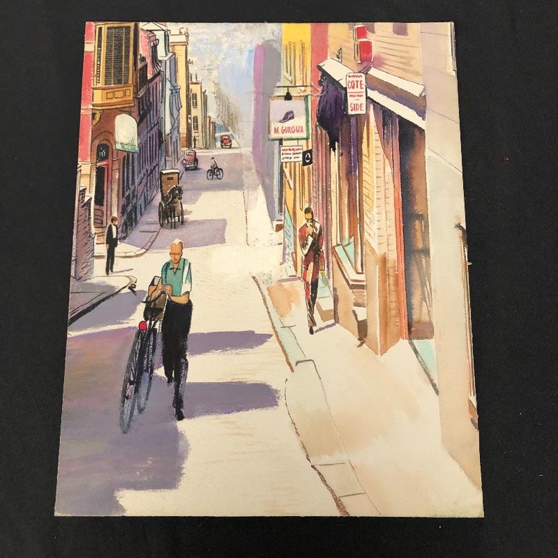 The first piece in this lot (26” x 33”) depicts a snowy city, and appears to be pastels, and is a 2-piece artwork. It is literally two pieces of paper that are the same size that when put together, it finishes the city scape. The second (14” x 11”) depicts a city on a river with a large bridge. The third (16” x 12.5”) depicts a rainy day at the park. The fourth 17.5” x 12”) also depicts a rainy street. The fifth (11” x 14”) shows a bright European street. Two of these have stickers on back that say Ralph Avery is the artist.
