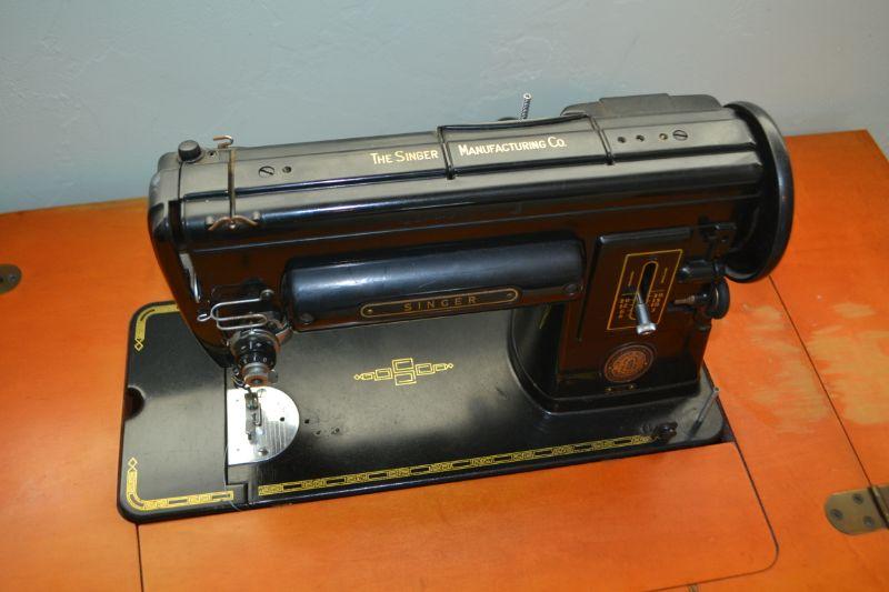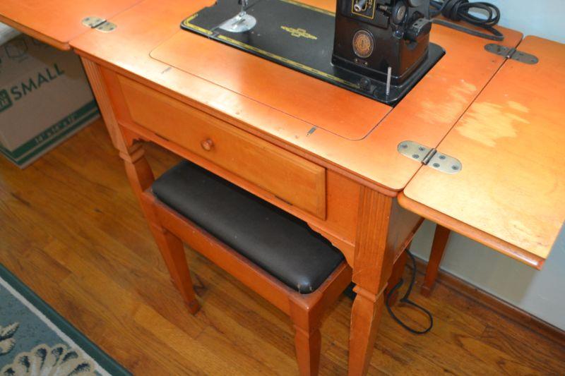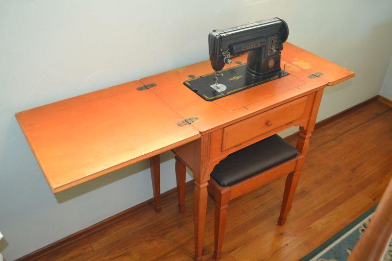 LOT 176 VINTAGE SINGER SEWING MACHINE MODEL 301, CABINET AND BENCH