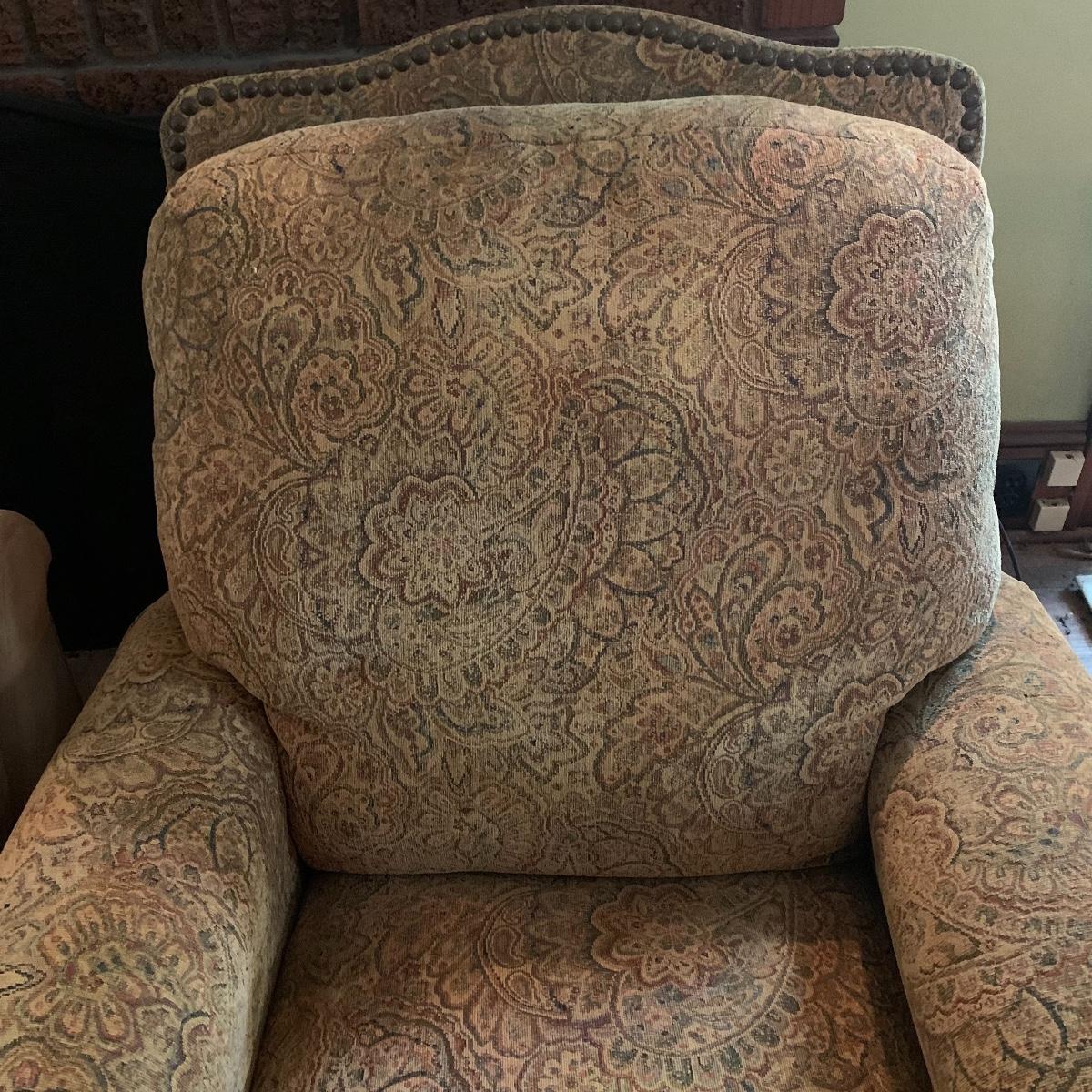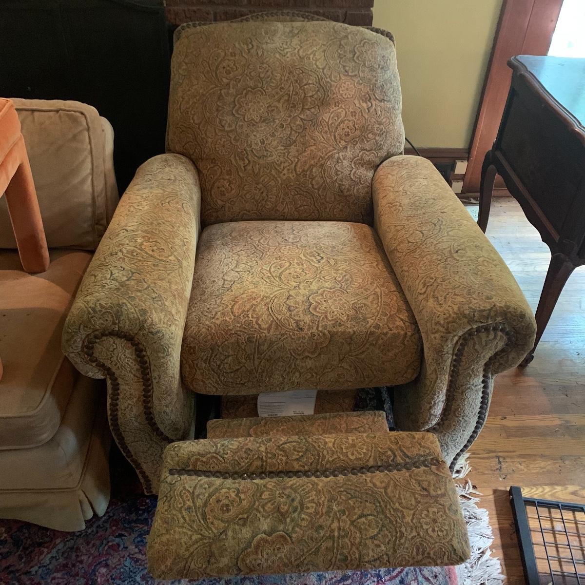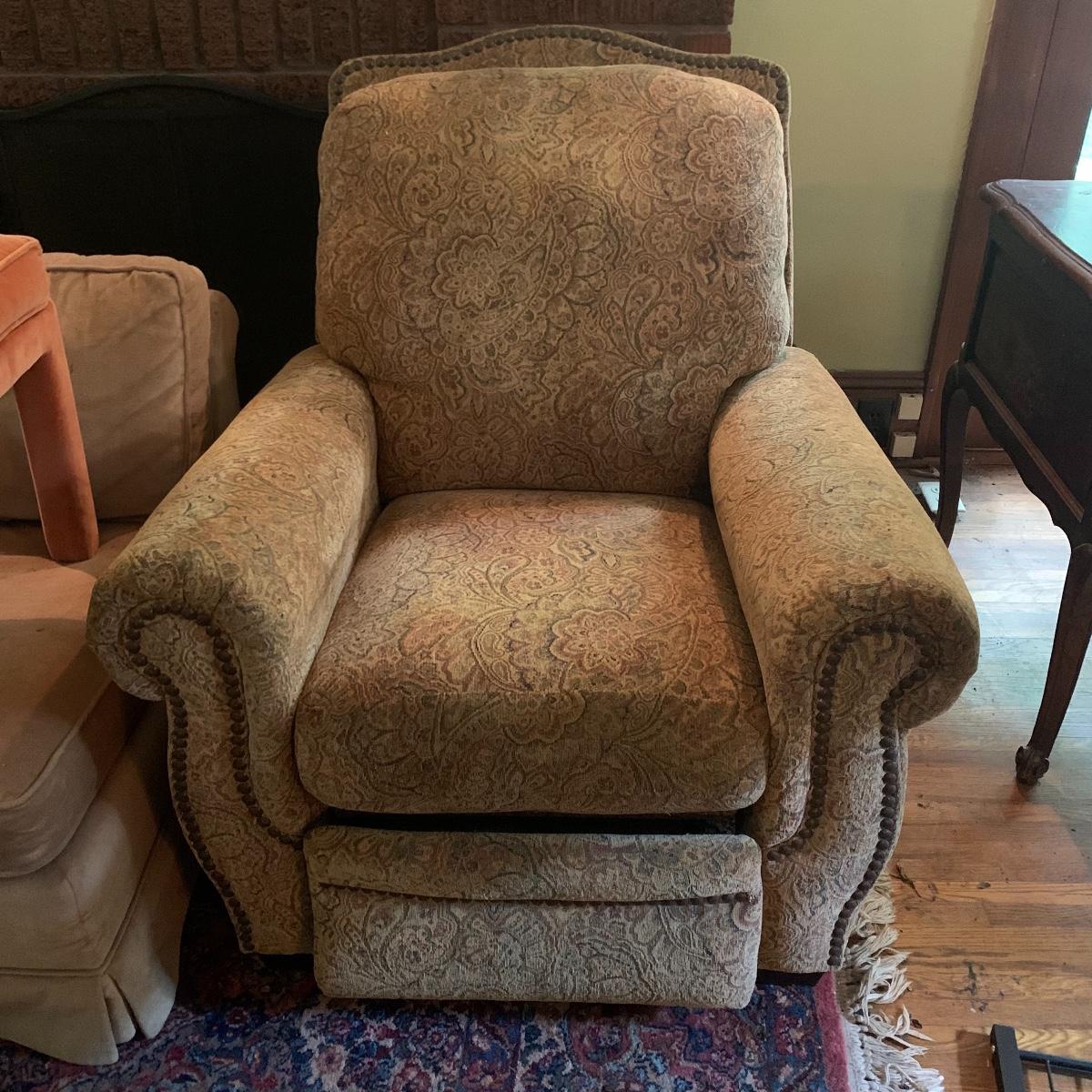 Relax in this comfy chair and watch your favorite show. This lot is dedicated to this classic recliner that features a soft cloth exterior with a tan and red paisley design. The chair measures 36” deep X 36” wide X 42” tall and is in good condition. Please bring help to receive this item. Local pickup only.