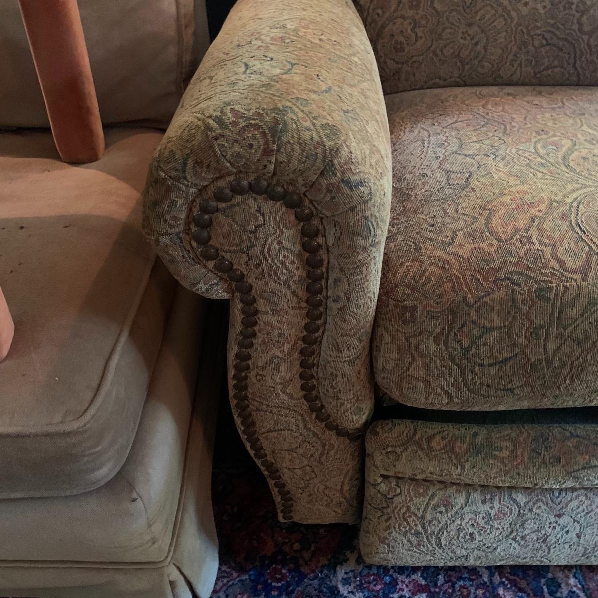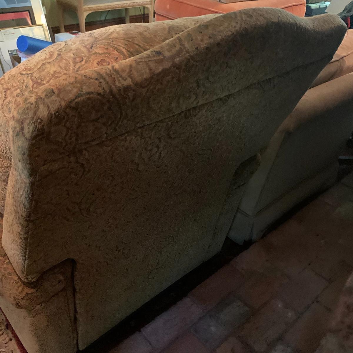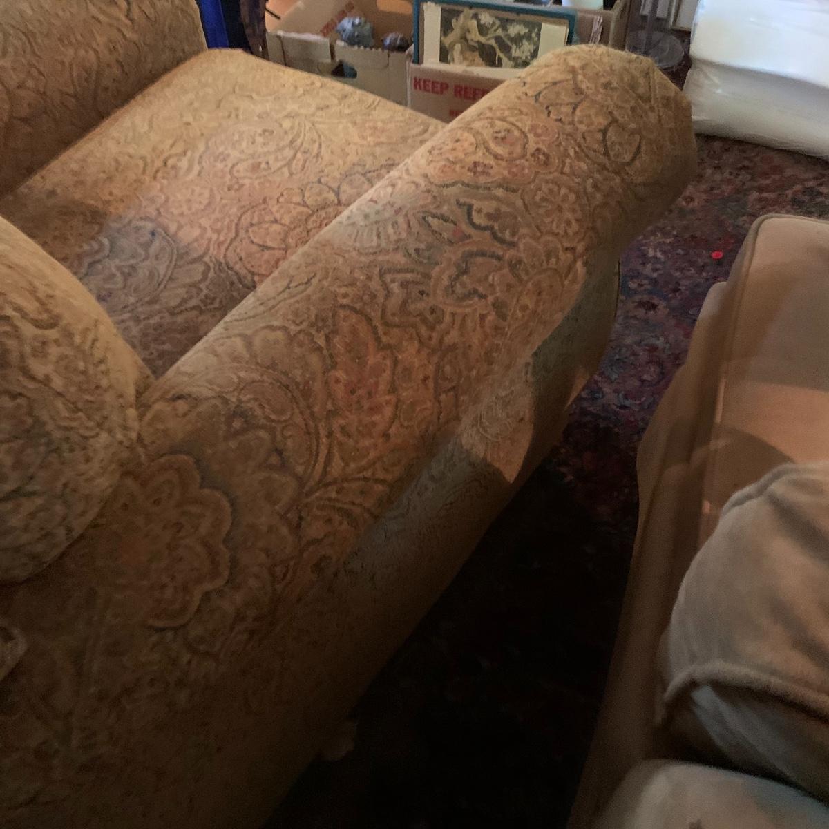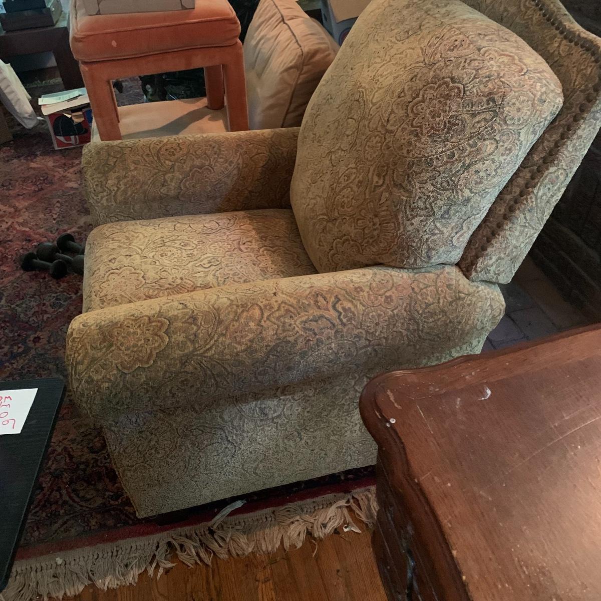 Relax in this comfy chair and watch your favorite show. This lot is dedicated to this classic recliner that features a soft cloth exterior with a tan and red paisley design. The chair measures 36” deep X 36” wide X 42” tall and is in good condition. Please bring help to receive this item. Local pickup only.