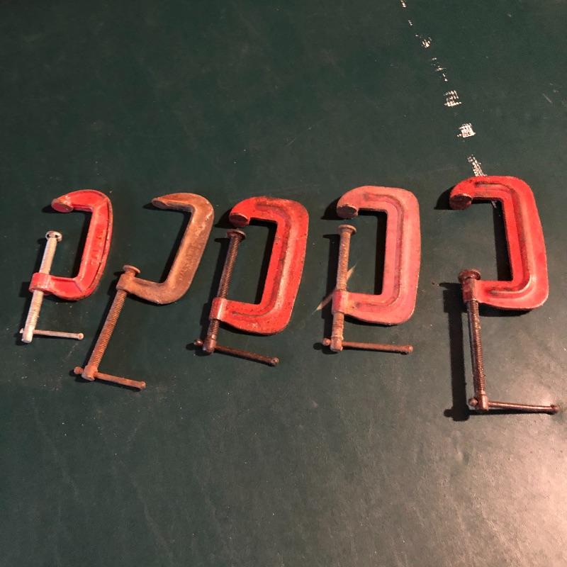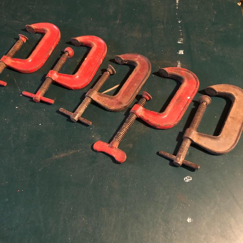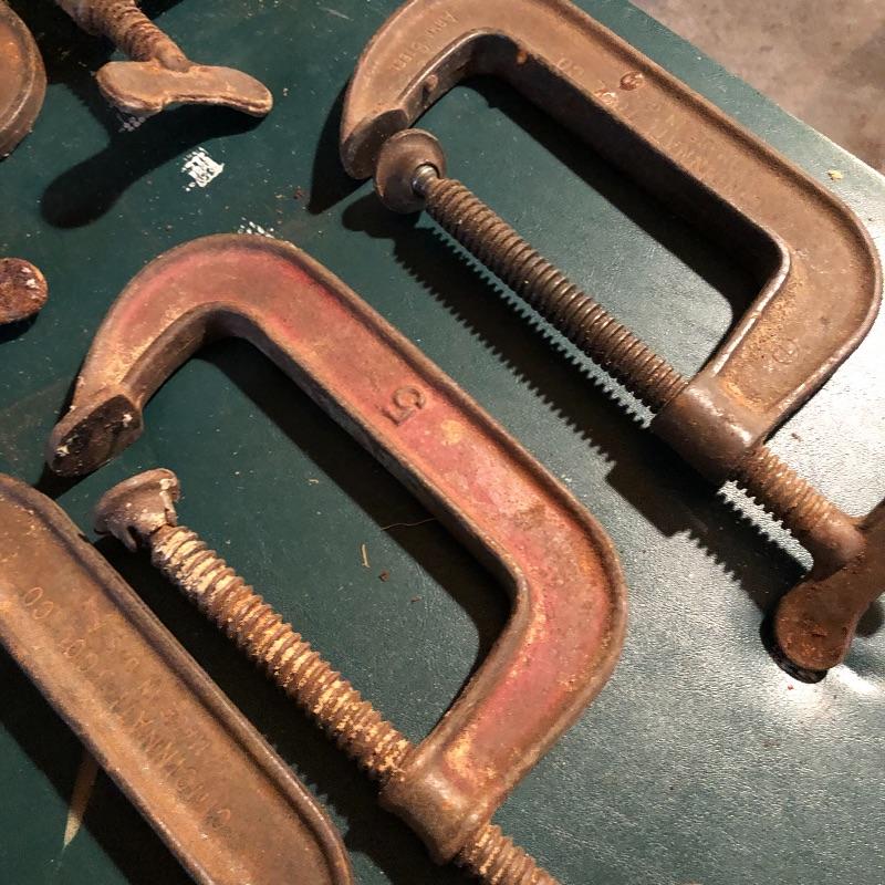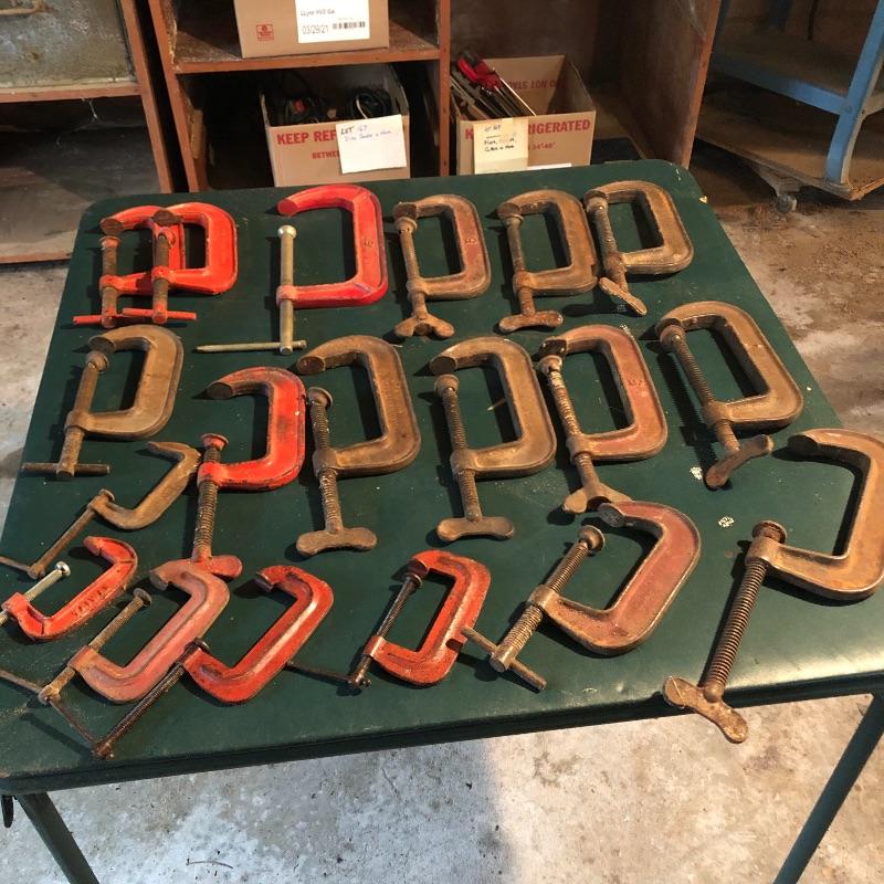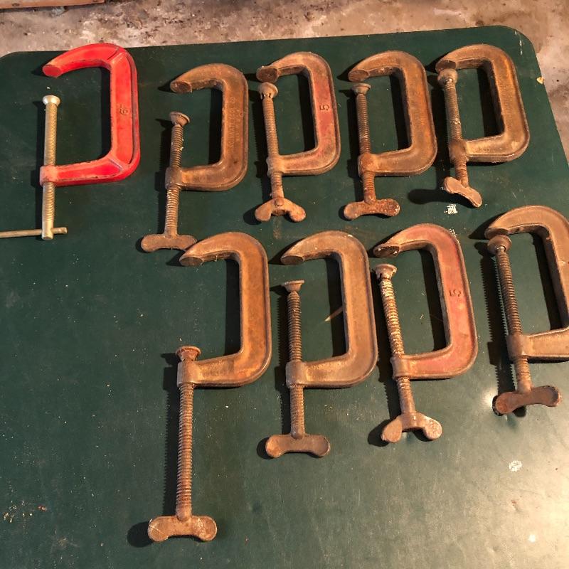 This lot has nineteen c clamps of varying sizes. There is one 6”clamp, eight 5” clamps, five 4” clamps and five smaller ones. A bit of rusting with a couple cranks stiff but a little sanding and some WD40 and they are ready to help with your project. Local pick up only.