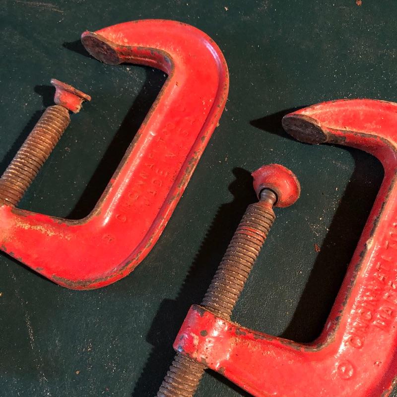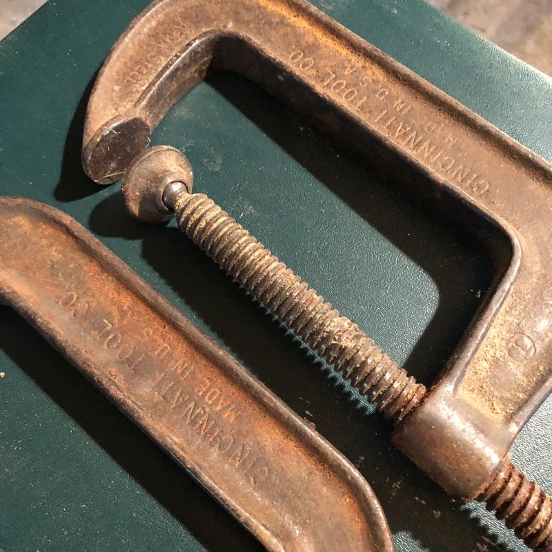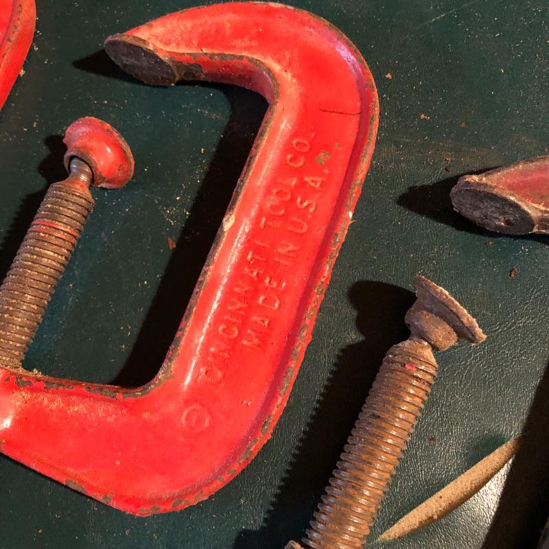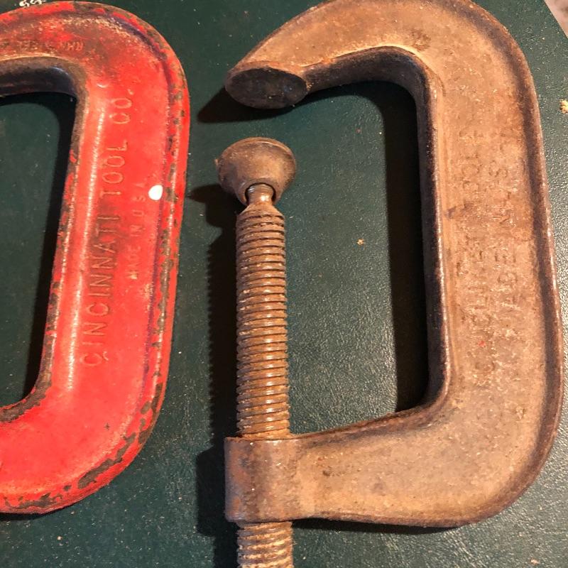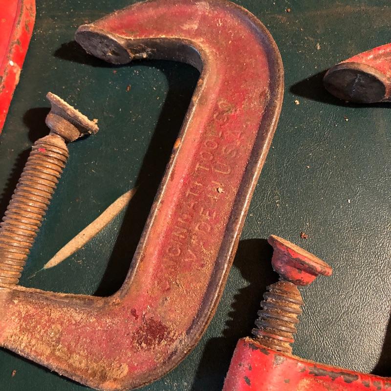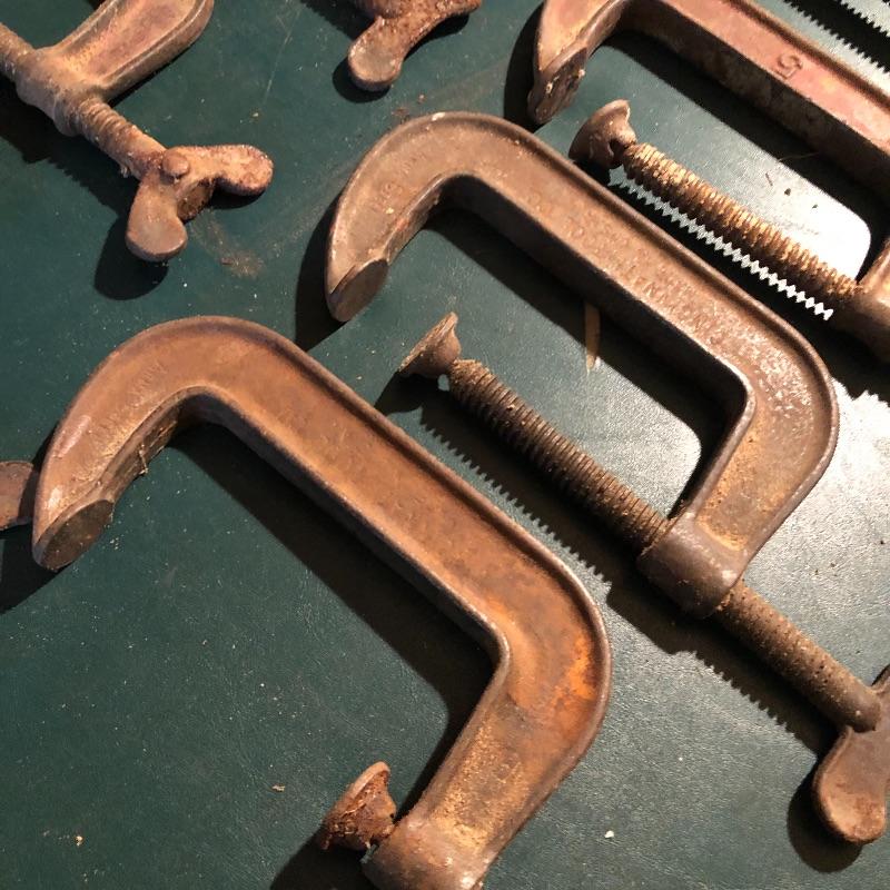 This lot has nineteen c clamps of varying sizes. There is one 6”clamp, eight 5” clamps, five 4” clamps and five smaller ones. A bit of rusting with a couple cranks stiff but a little sanding and some WD40 and they are ready to help with your project. Local pick up only.