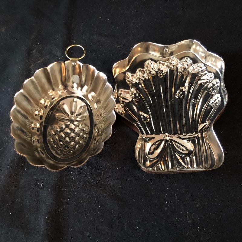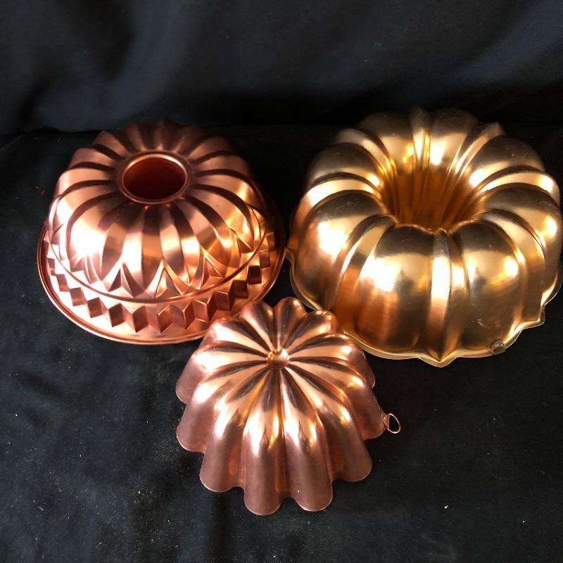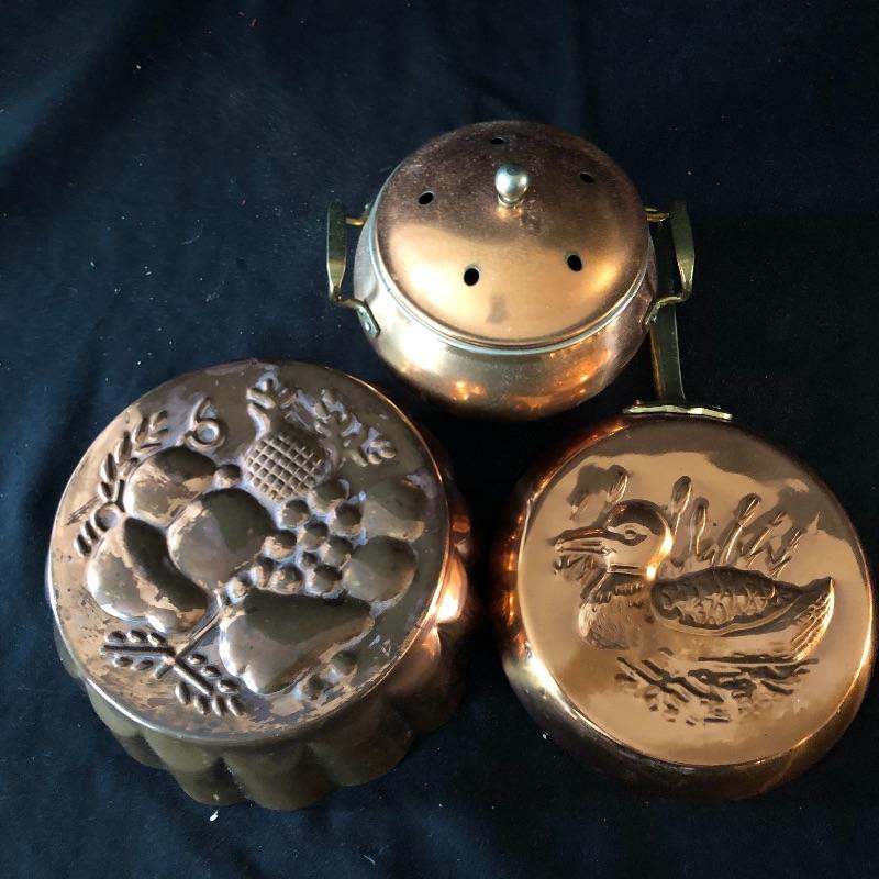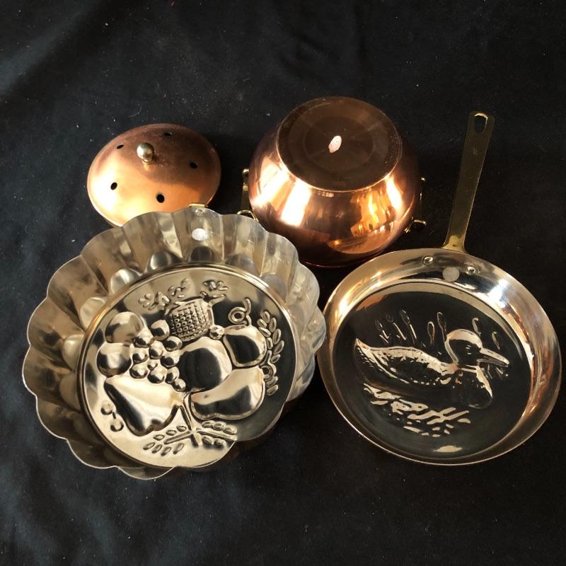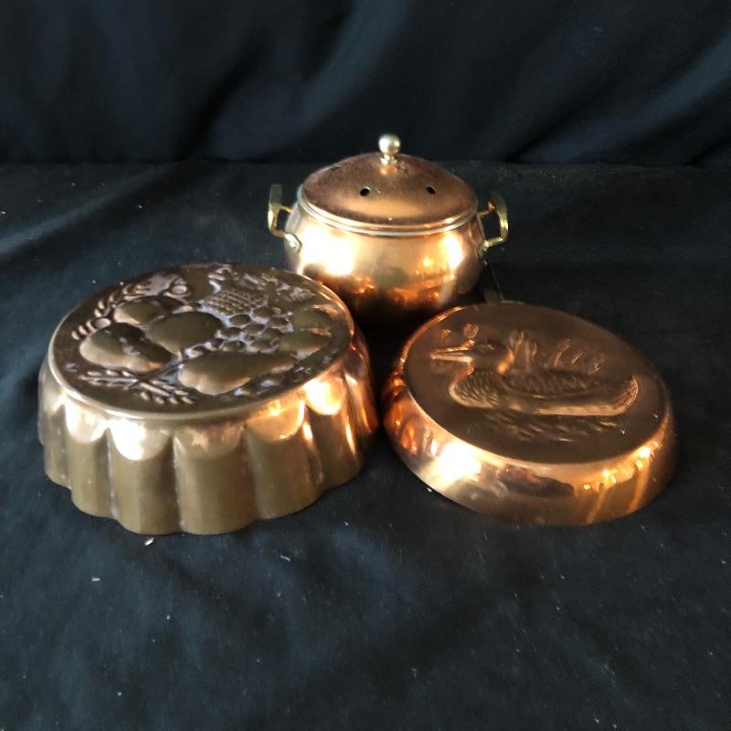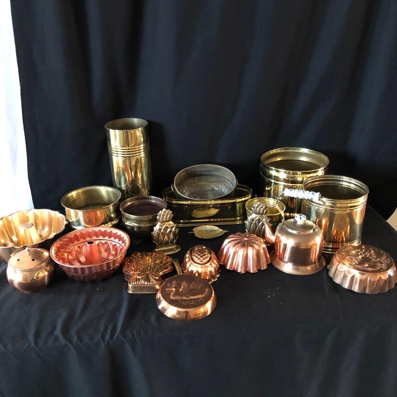 A great collection for your home or cabin. Lot includes copper teapot, molds, Bundt pans and brass paperweights, round and oblong containers and footed container.