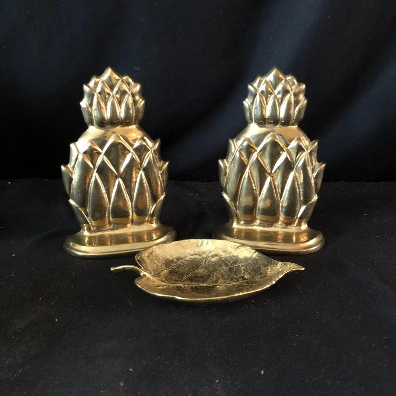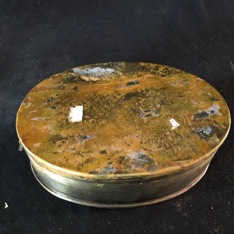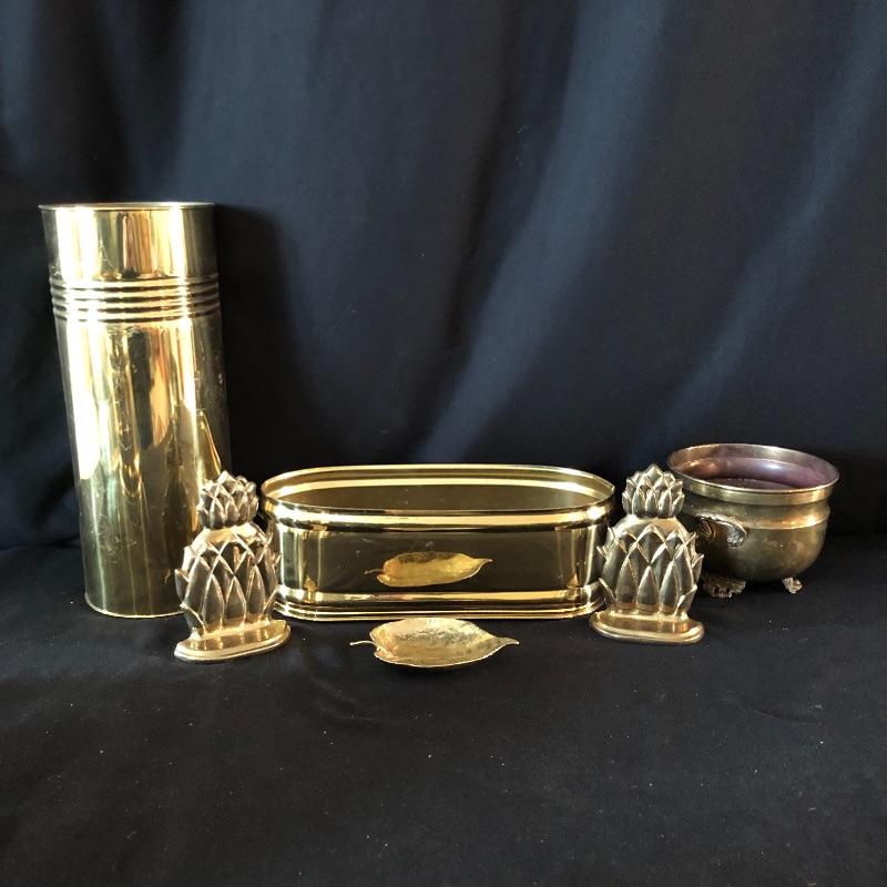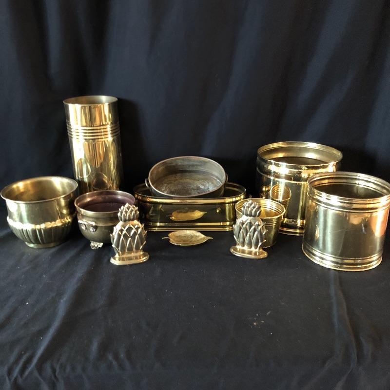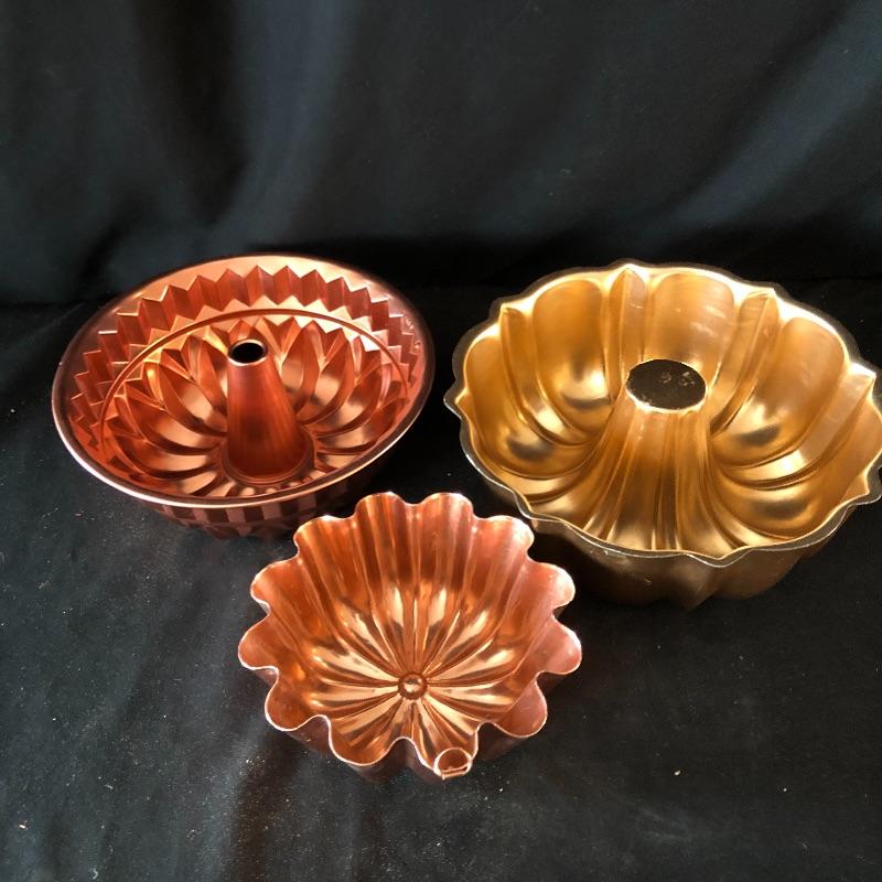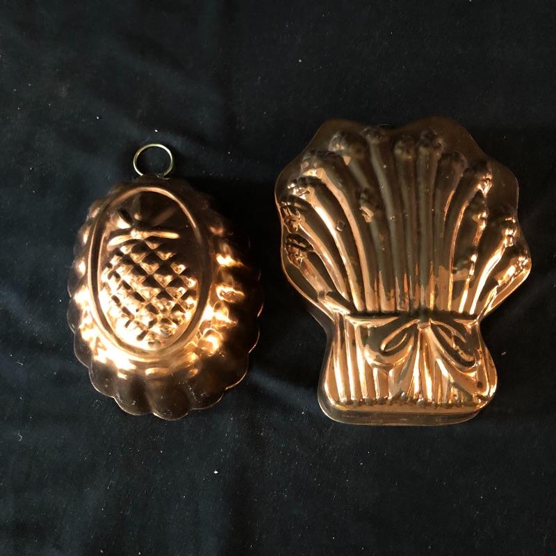 A great collection for your home or cabin. Lot includes copper teapot, molds, Bundt pans and brass paperweights, round and oblong containers and footed container.