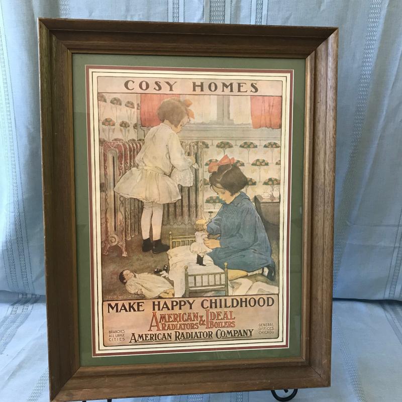 Framed Antique American Radiator Company print. “Cosy Homes Make Happy Childhood.” Approx. 27.5” x 21.5”. Shipping available or local pickup.