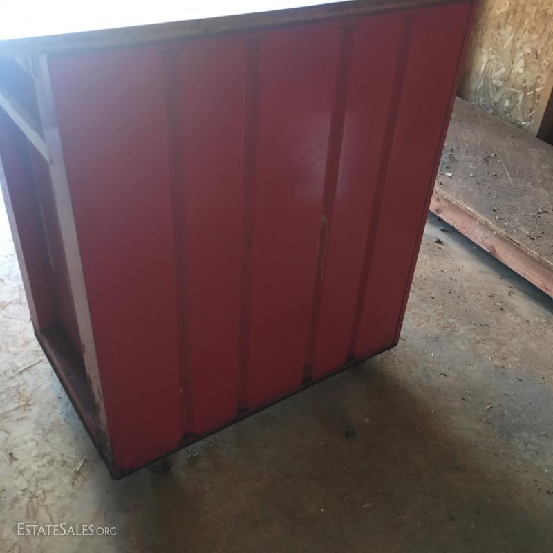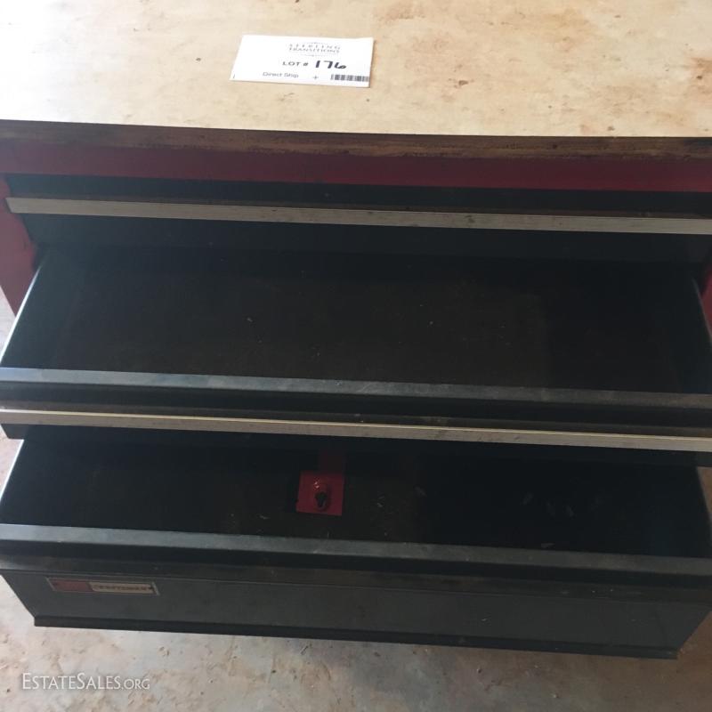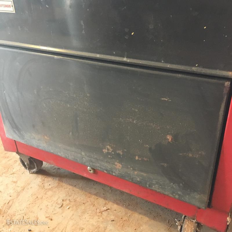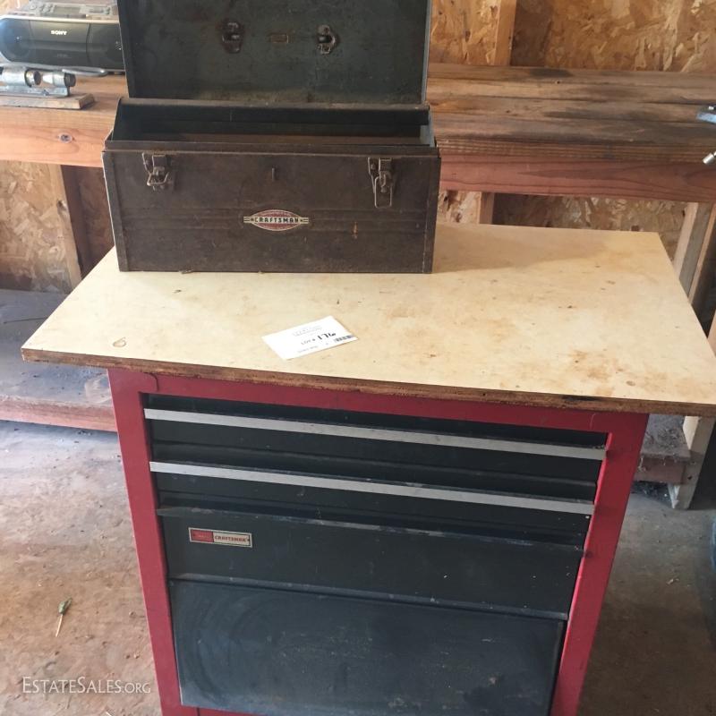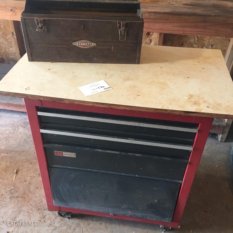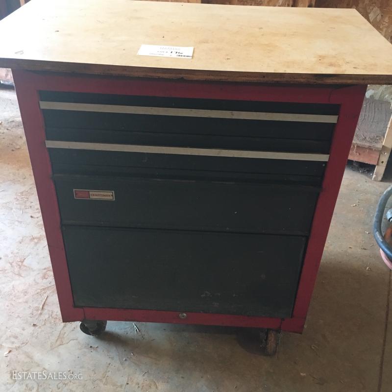 Rolling Craftsman Tool Box with 3 drawers and one cabinet on the bottom. Top drawer does not open and no key available. Mounted formica work table on top. Older carry craftsman tool box. A bit rusty but still quite usable.