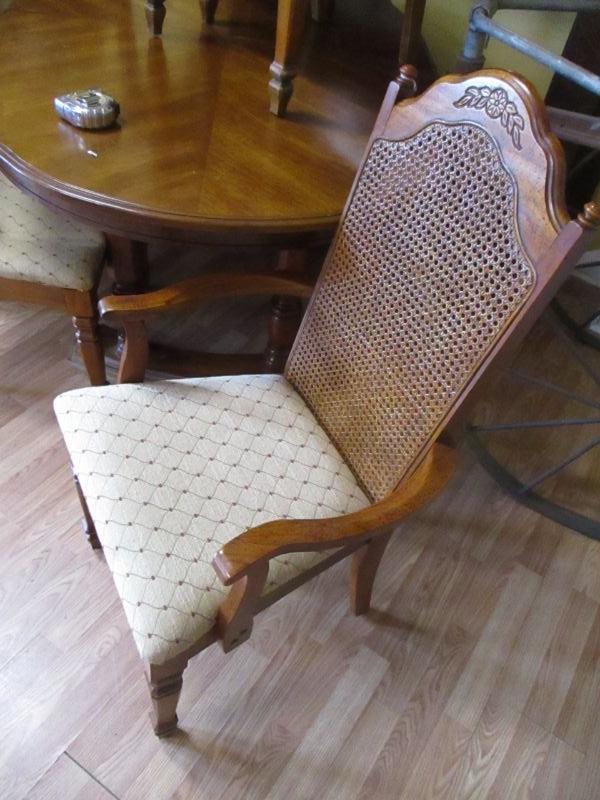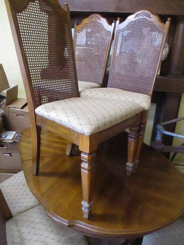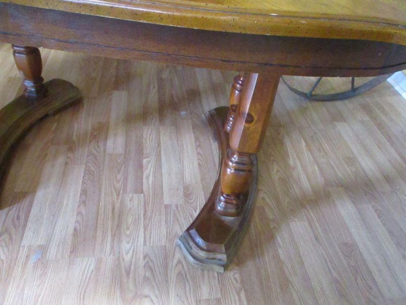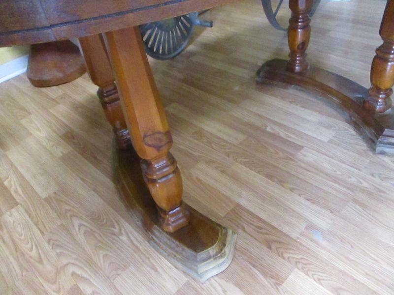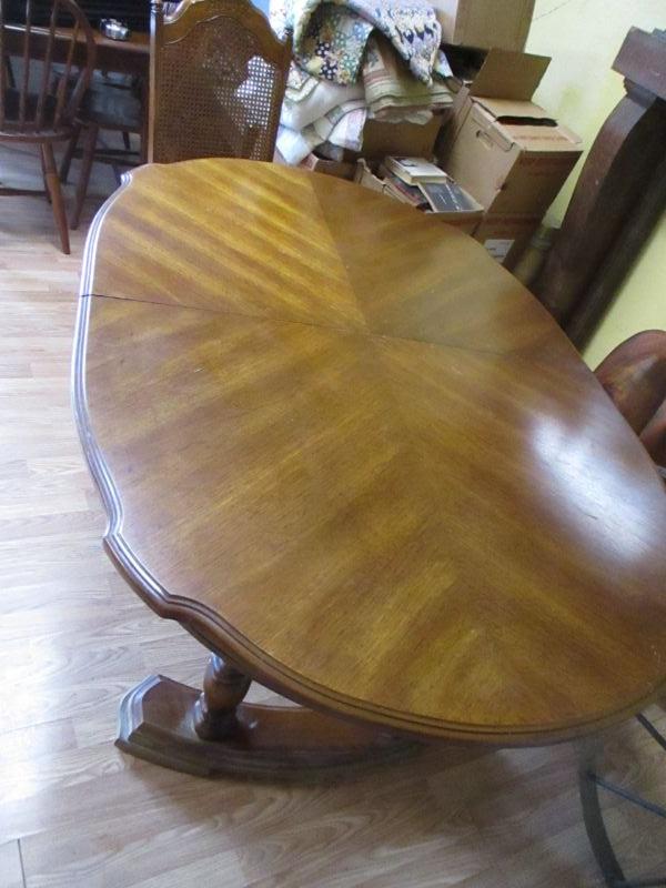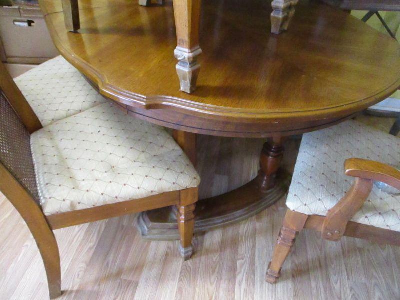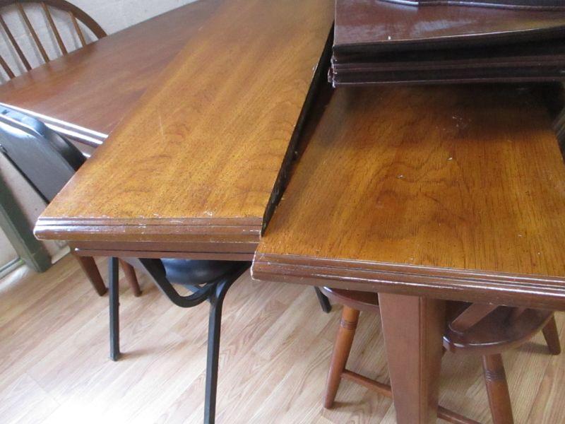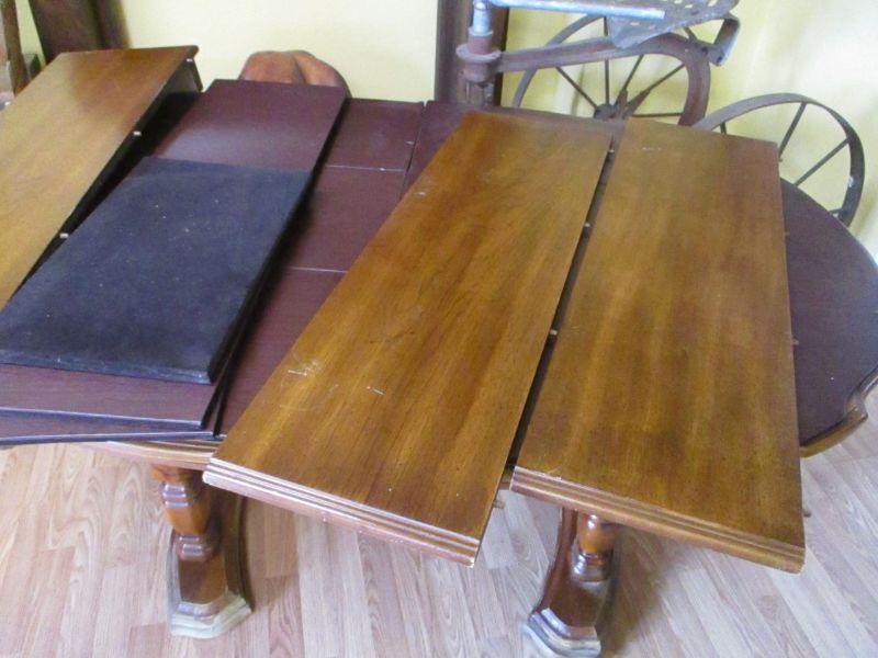 Table comes with pad & two leafs which are 12" wide each. Comes with 6 chairs