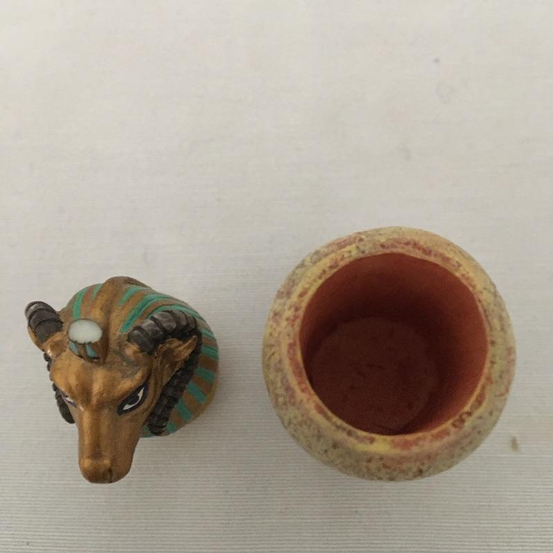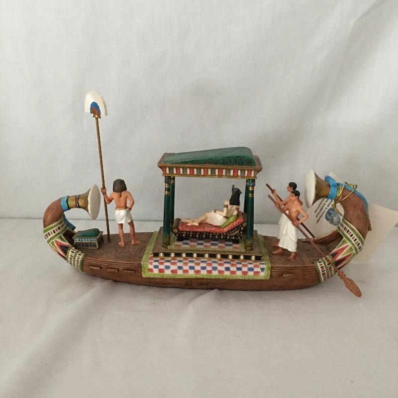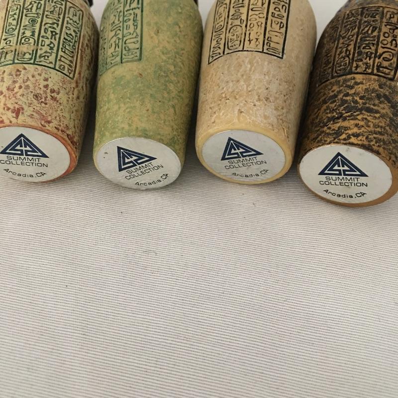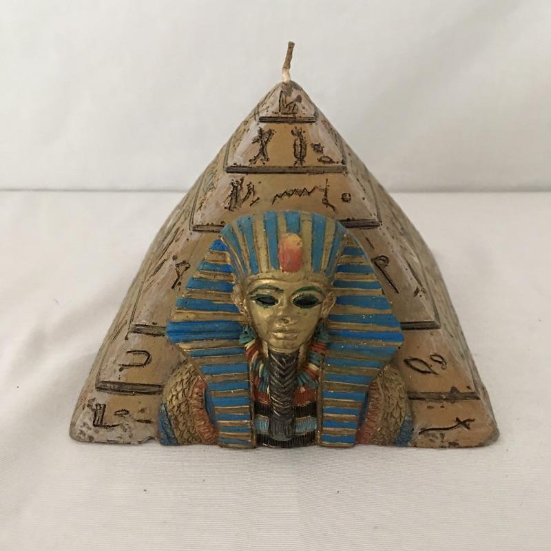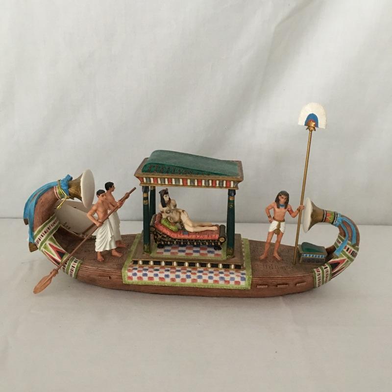Beautiful assortment of four Egyptian style stash capsules by Summit Collections, candle shaped as a pyramid and a resin boat depicting Cleopatra being chauffeured to her next destination. Boat measures 3.25” x 12” x 5”.