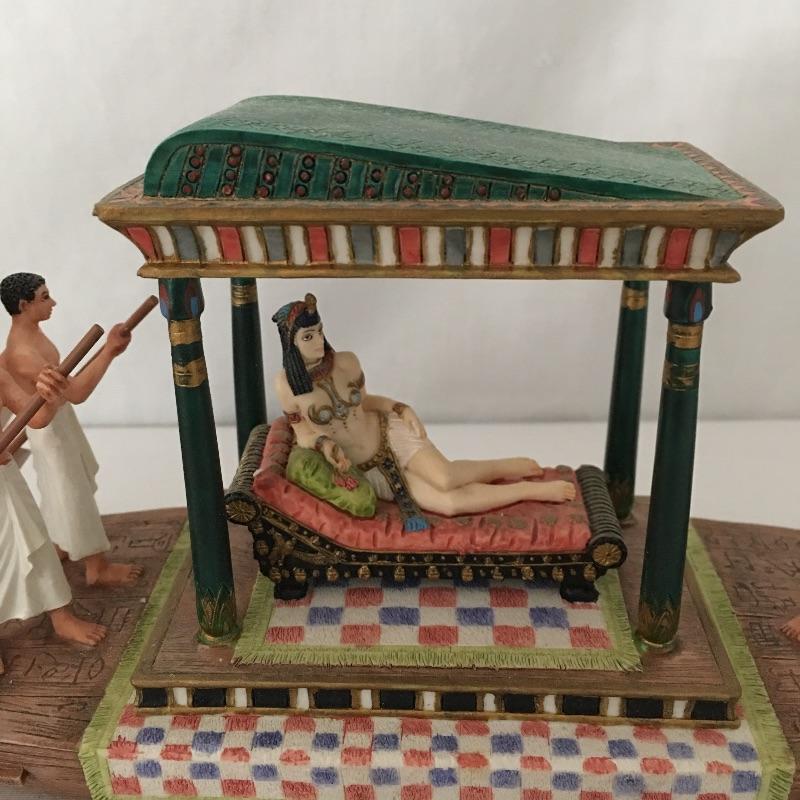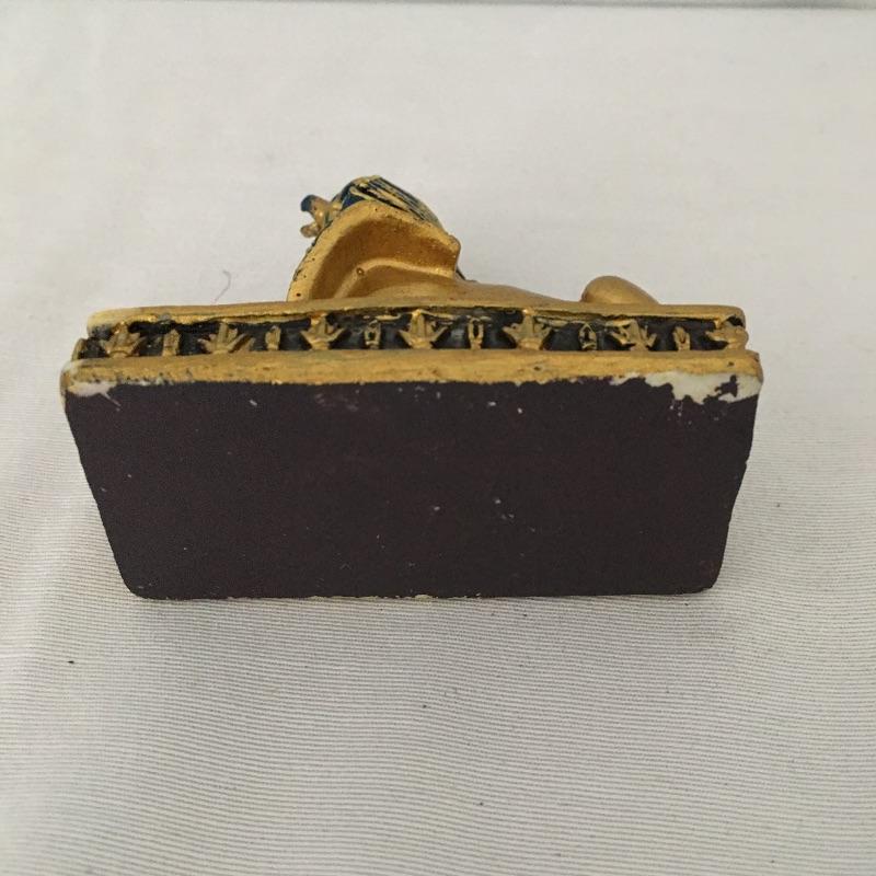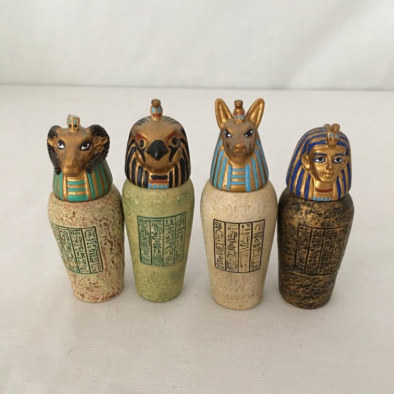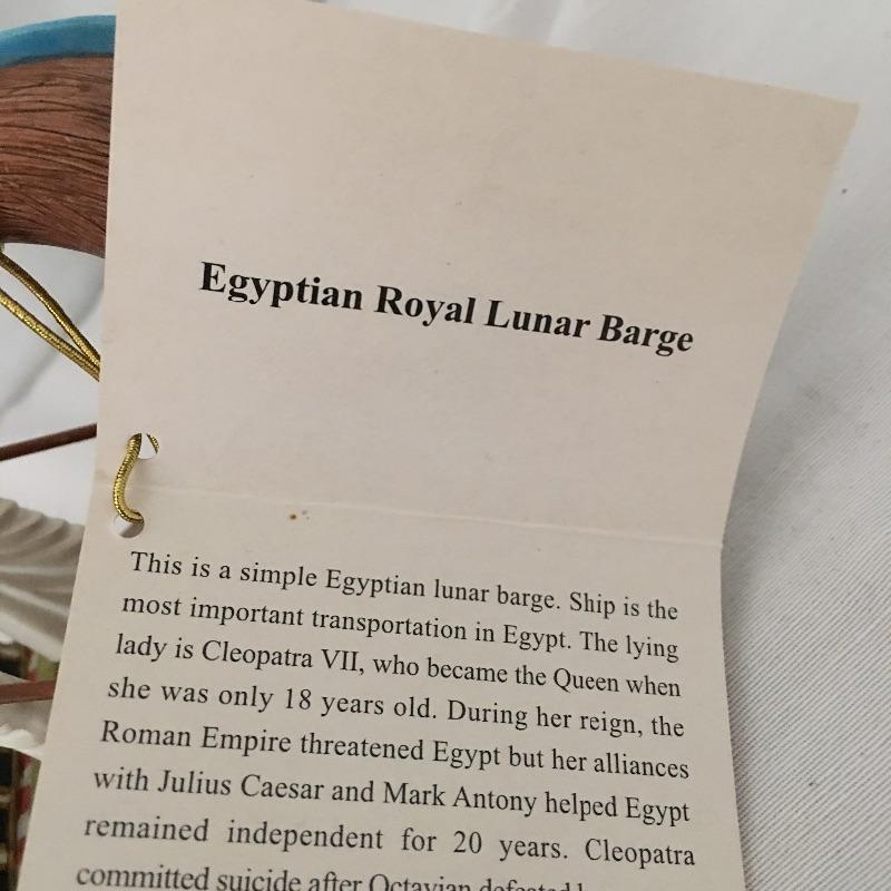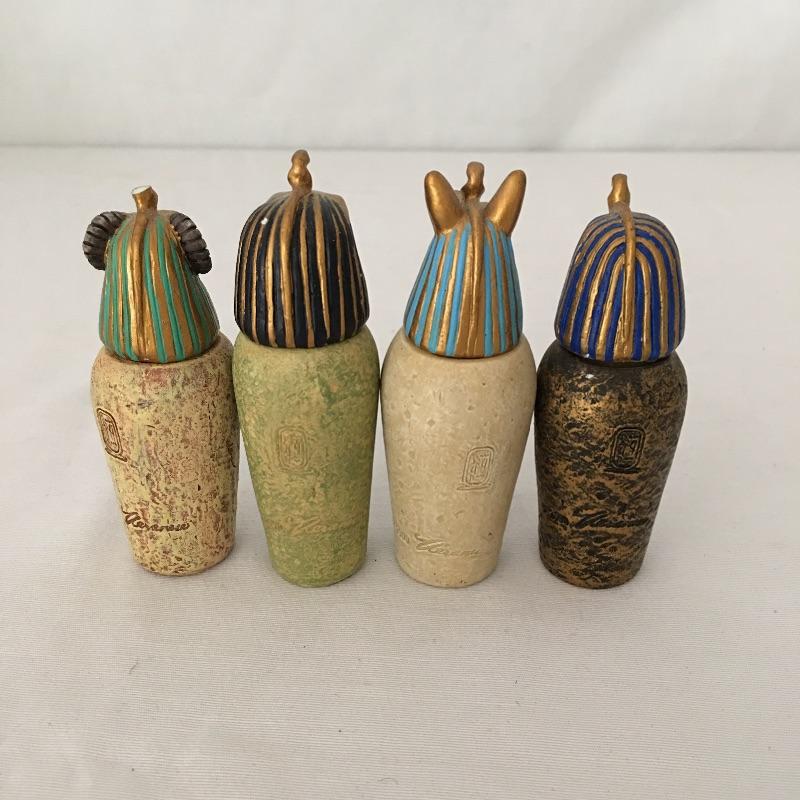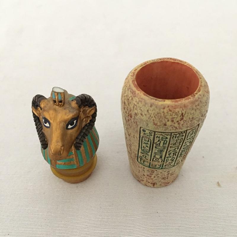 Beautiful assortment of four Egyptian style stash capsules by Summit Collections, candle shaped as a pyramid and a resin boat depicting Cleopatra being chauffeured to her next destination. Boat measures 3.25” x 12” x 5”.