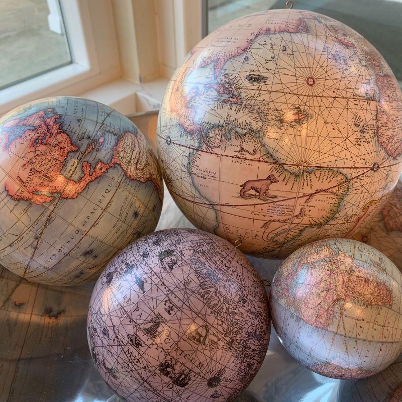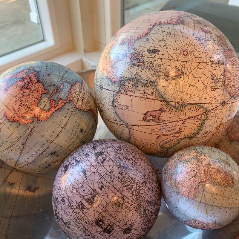 4 hanging globes printed with old style world maps. Smallest is about the size of a tennis ball. Largest is about the size of a kid's ball.