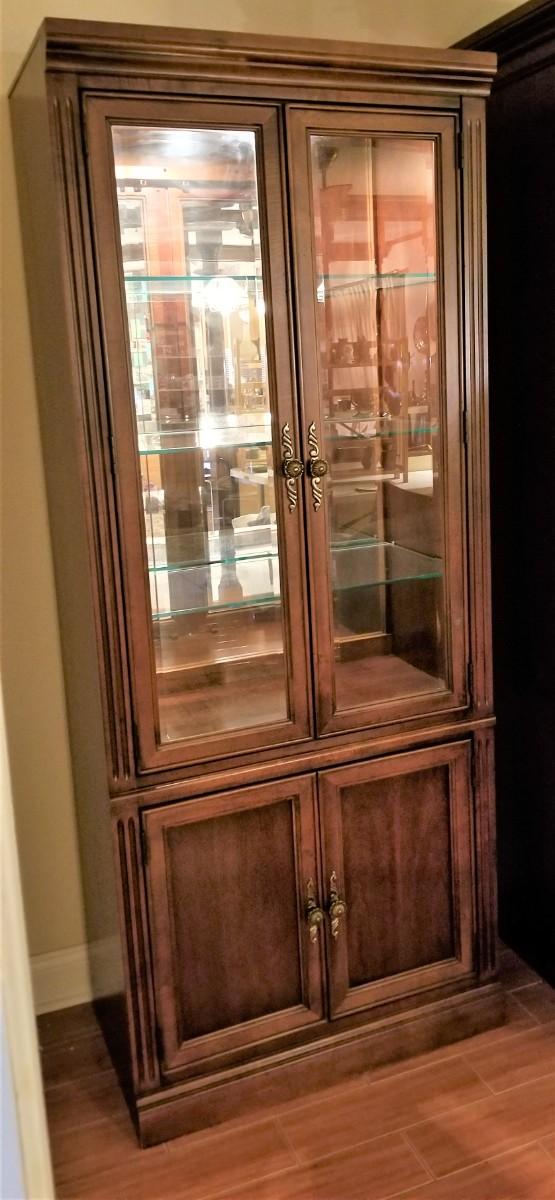 Nice lighted display cabinet by Stanley Furniture. 3 adjustable tempered glass shelves. 32" across, 20" deep, 79" tall. Good condition. Lots of storage underneath.