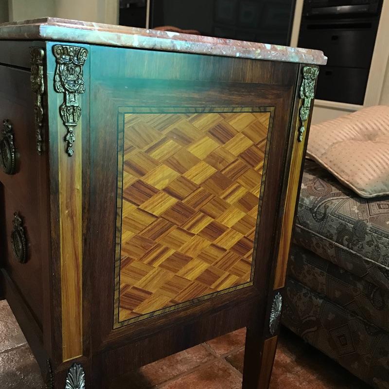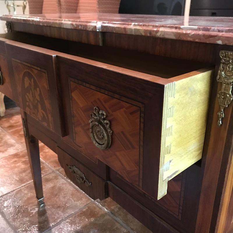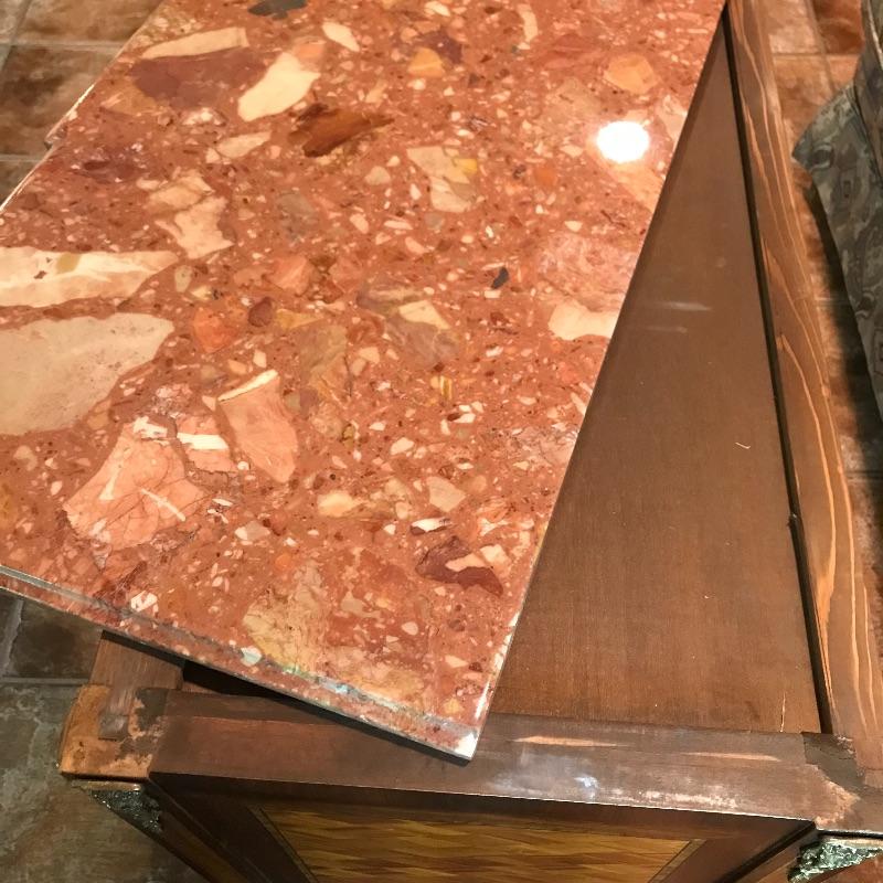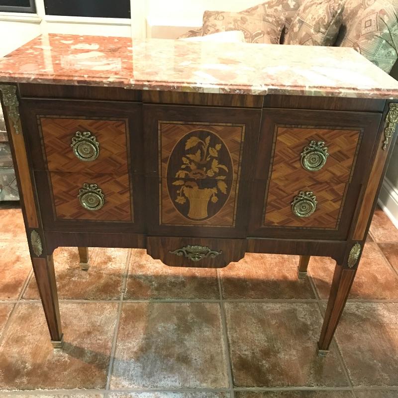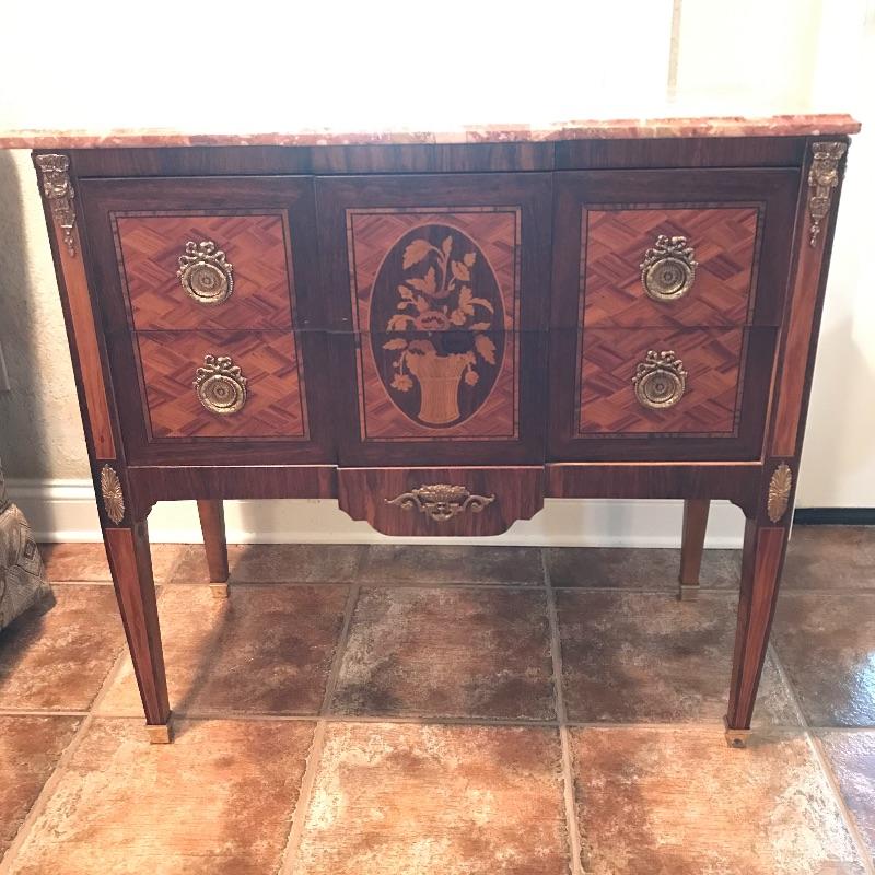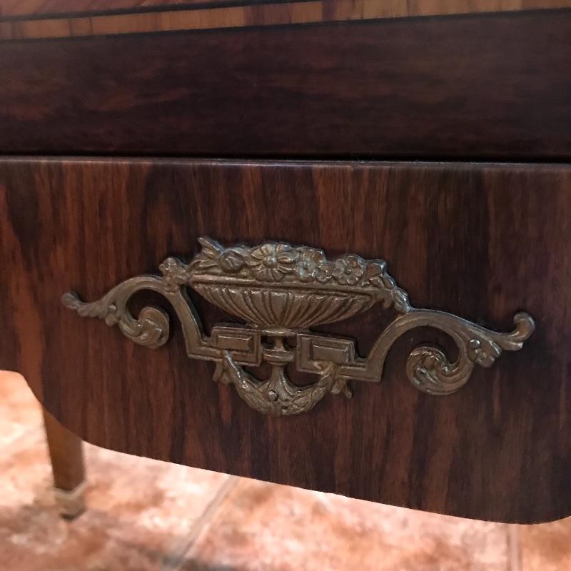 Wonderfully designed inlays with two drawer table with marble top. The piece has gold and brass accents throughout and looks great! It measures approximately 35” x 16.5” x 32.5”. No shipping.