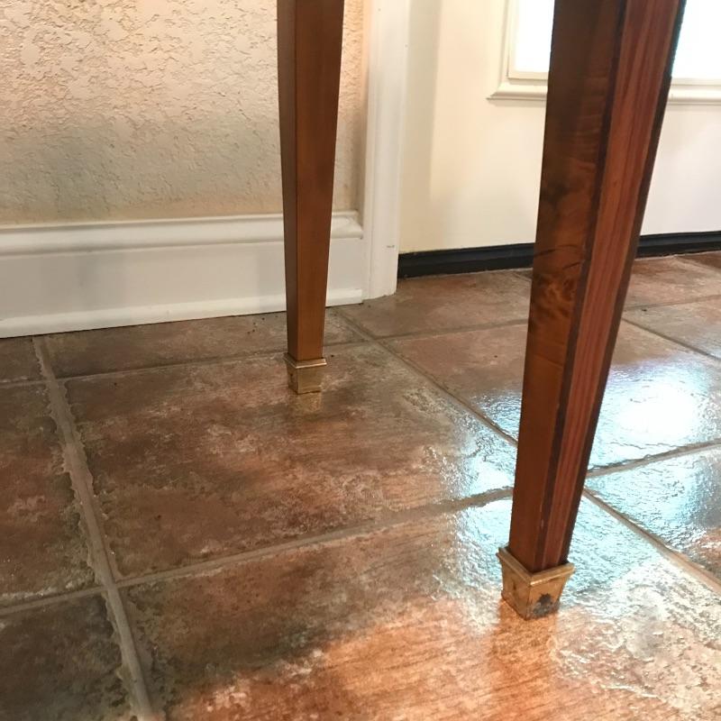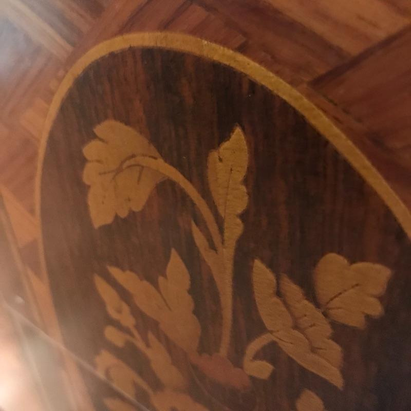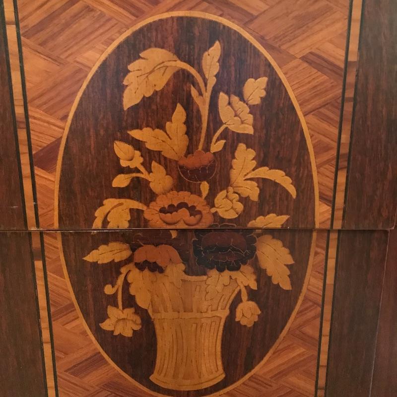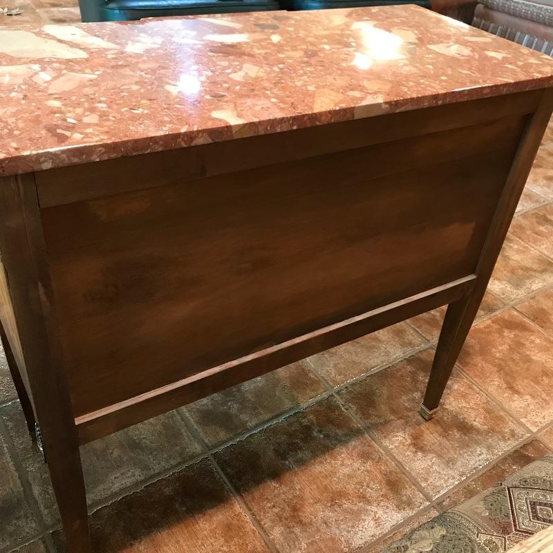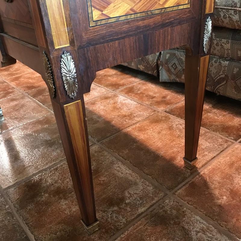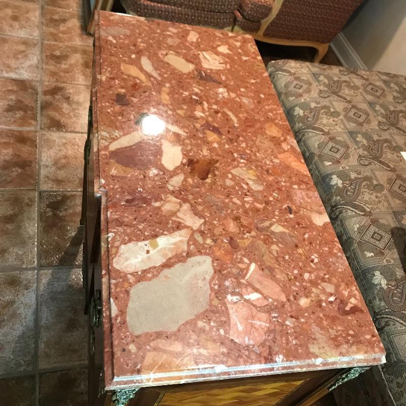 Wonderfully designed inlays with two drawer table with marble top. The piece has gold and brass accents throughout and looks great! It measures approximately 35” x 16.5” x 32.5”. No shipping.