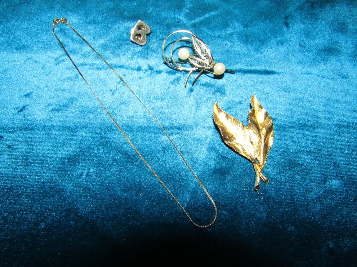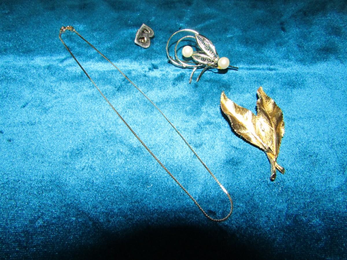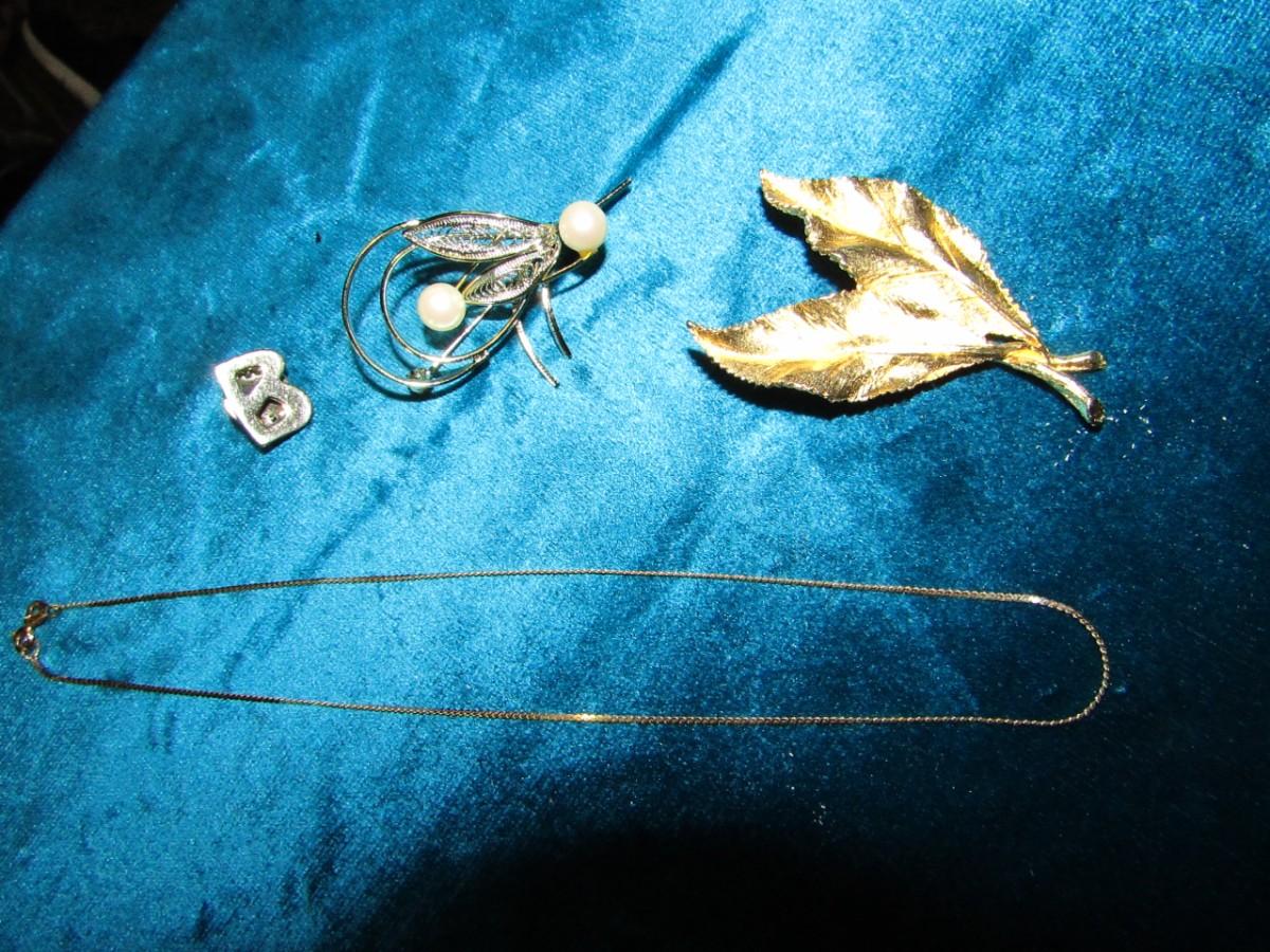 LOT 176 MARKED 14K CHAIN AND BROOCHES