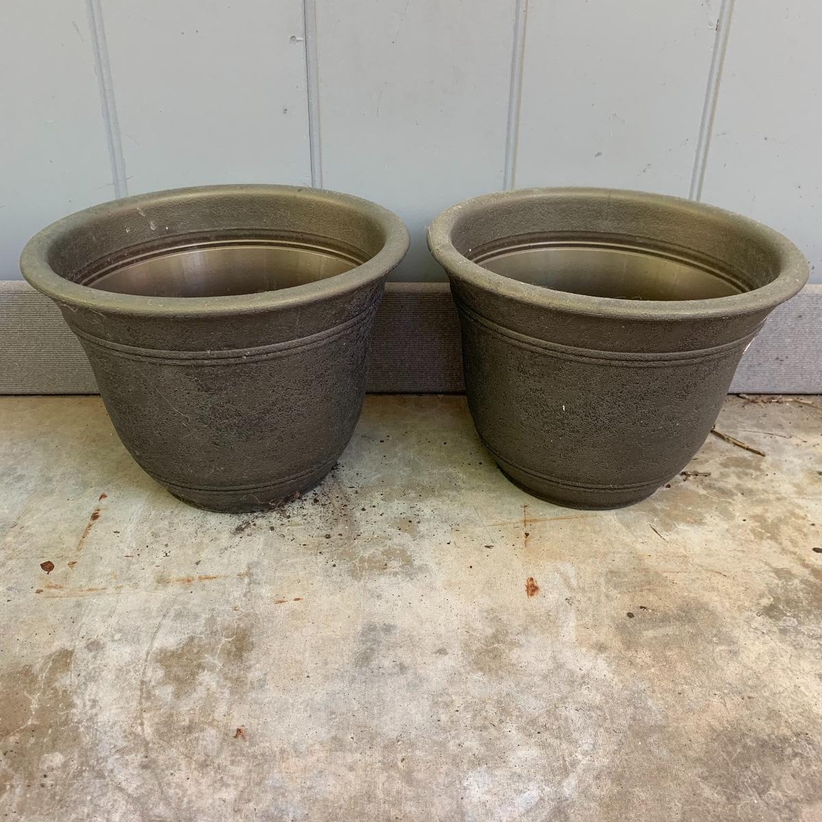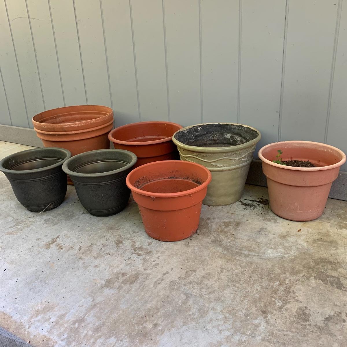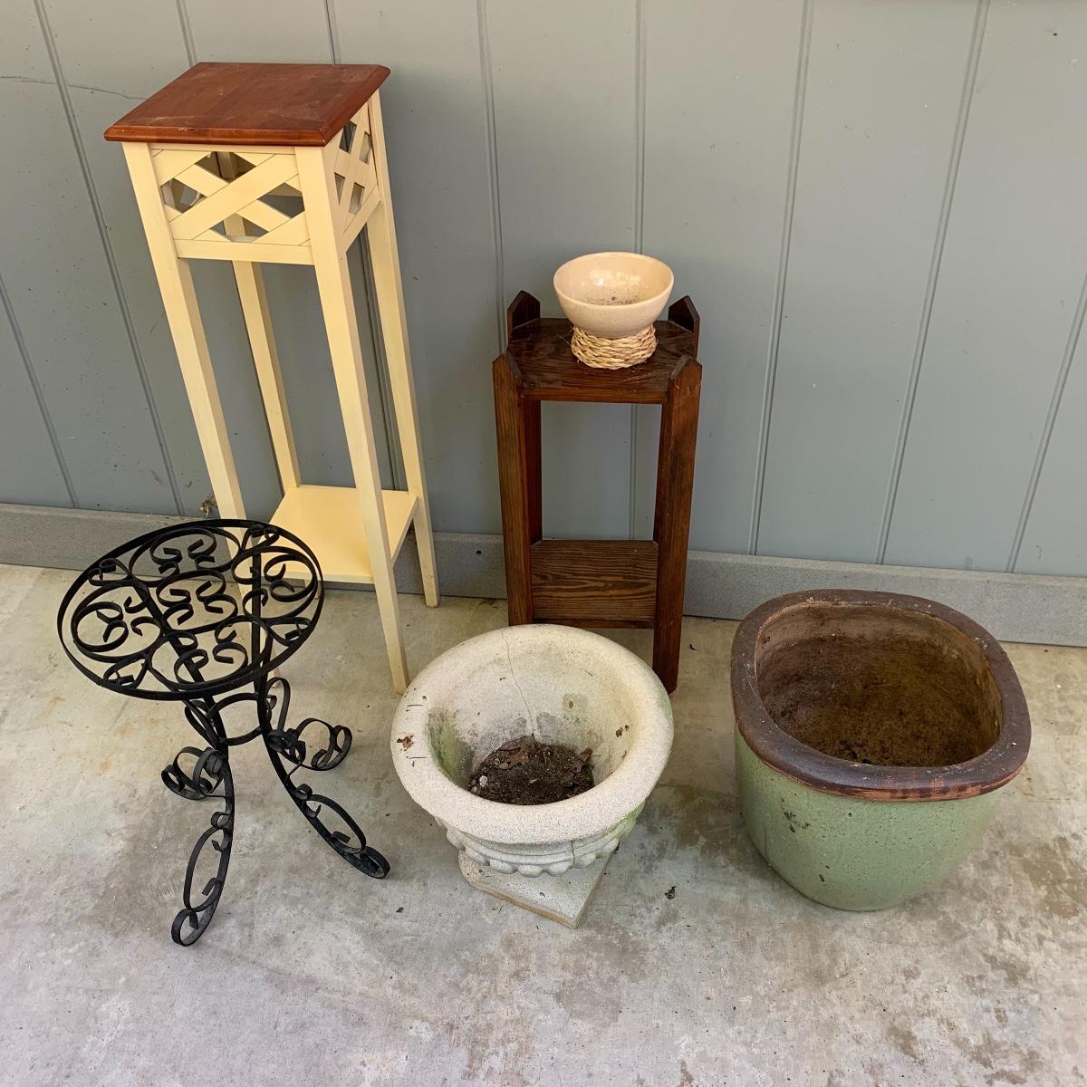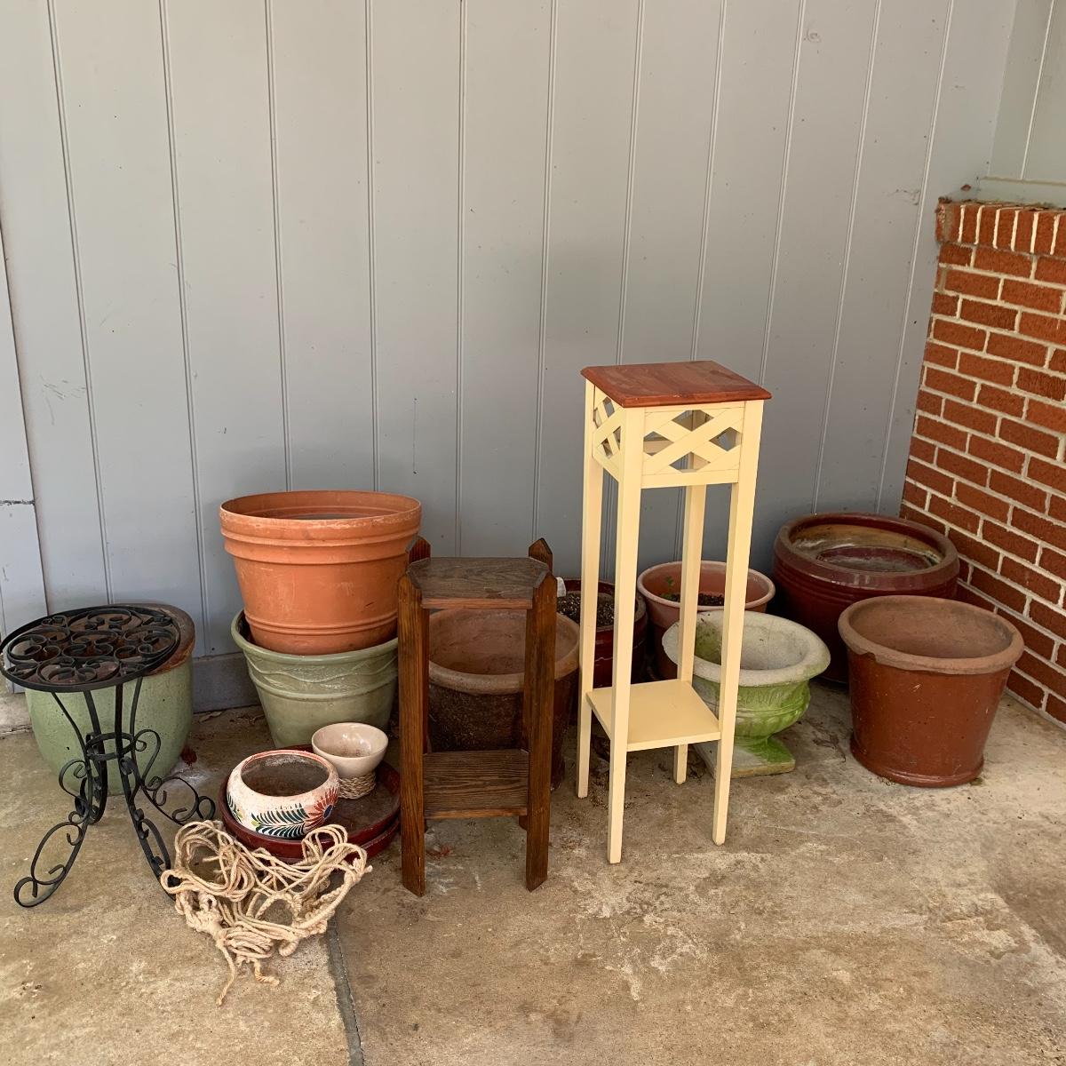 Imagine all the beautiful flowers, houseplants, herbs, and veggies you could plant in this large variety of planters! There are 15 pots in this lot, including a couple smaller decorative pots, and many larger pots. The majority are ceramic and in excellent condition (just dirty from being outside). A couple have chips or cracks, but still function just fine. In addition to the pots, there are a few plant saucers and some plant stand bricks. There are also three beautiful plant stands. Two are wooden and each have two shelves, and one is metal. The tallest stand is 36.5” tall. Also included is a macrame plant hanger (hanging hook in photos is not included). Local pickup only. Please note that some of these planters are quite heavy and the winning bidder will need to move them from the back patio of a house with stairs.