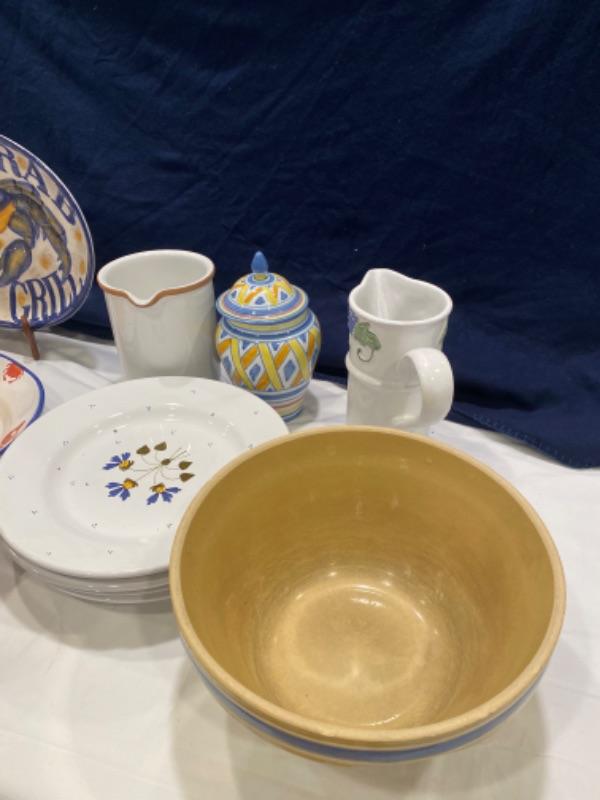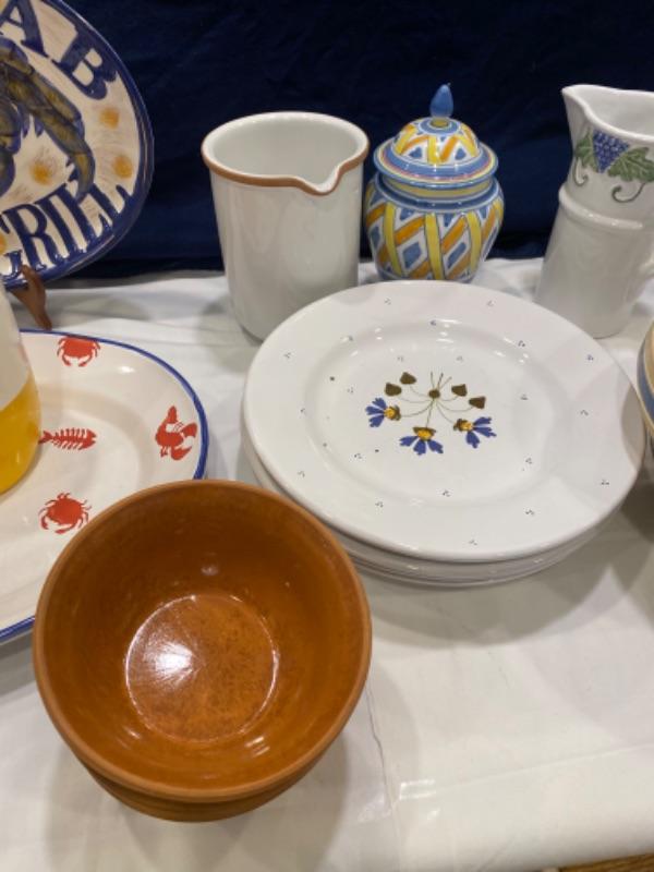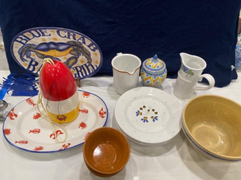 This lot has Blue Crab Serving pieces with vintage yellow ware bowl and terracotta plates and small pitchers