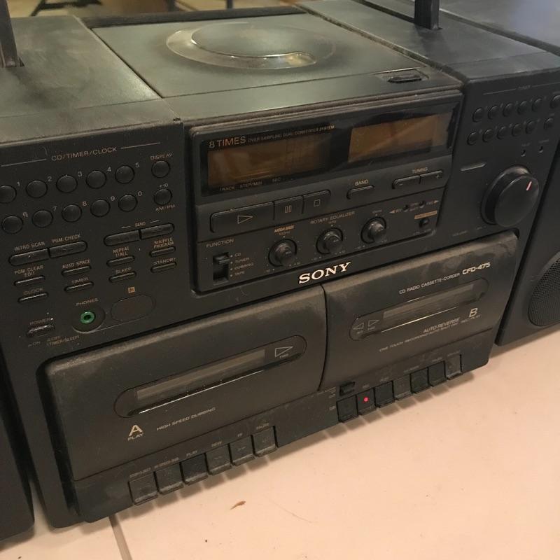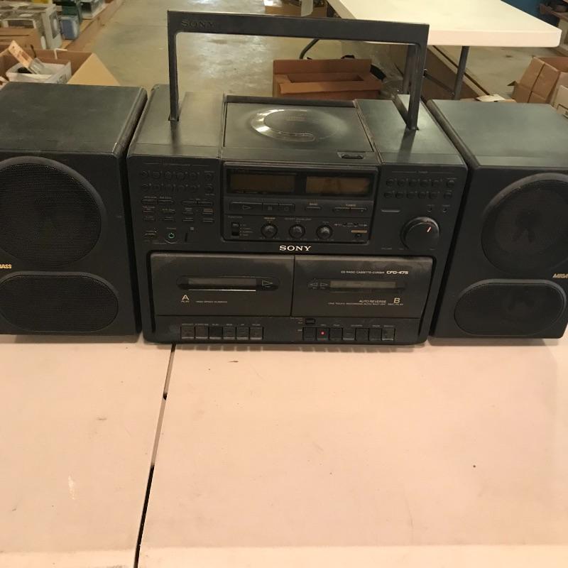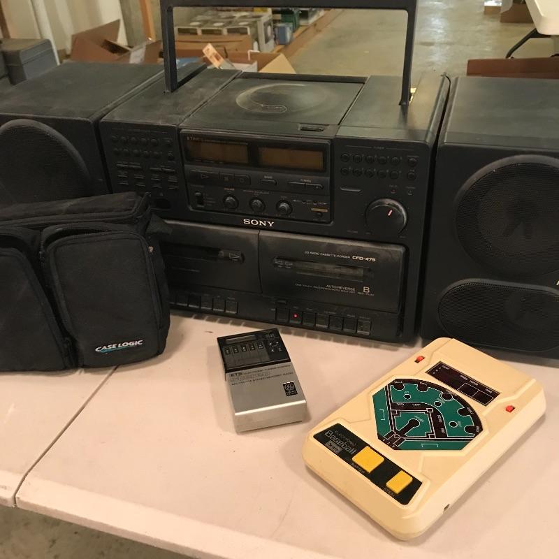 Lot includes Sony boom box with CD player, cassette deck, and mega bass speakers. Also included in lot are an Offense/Defense Electronic Baseball game, a GE electronic tuning system, and a Case Logic carrying case. Local pickup only.