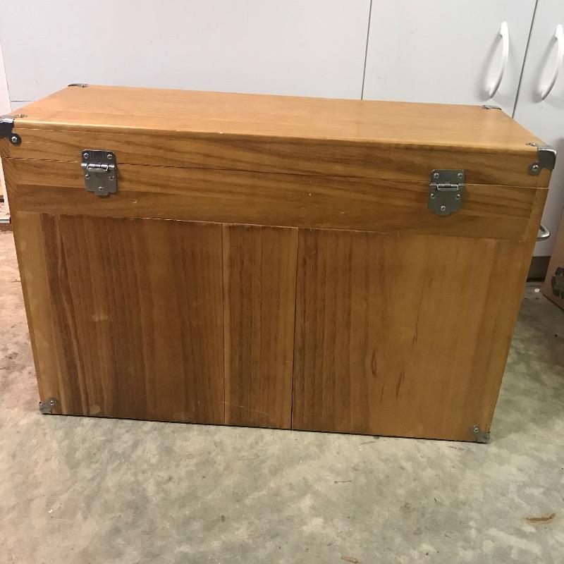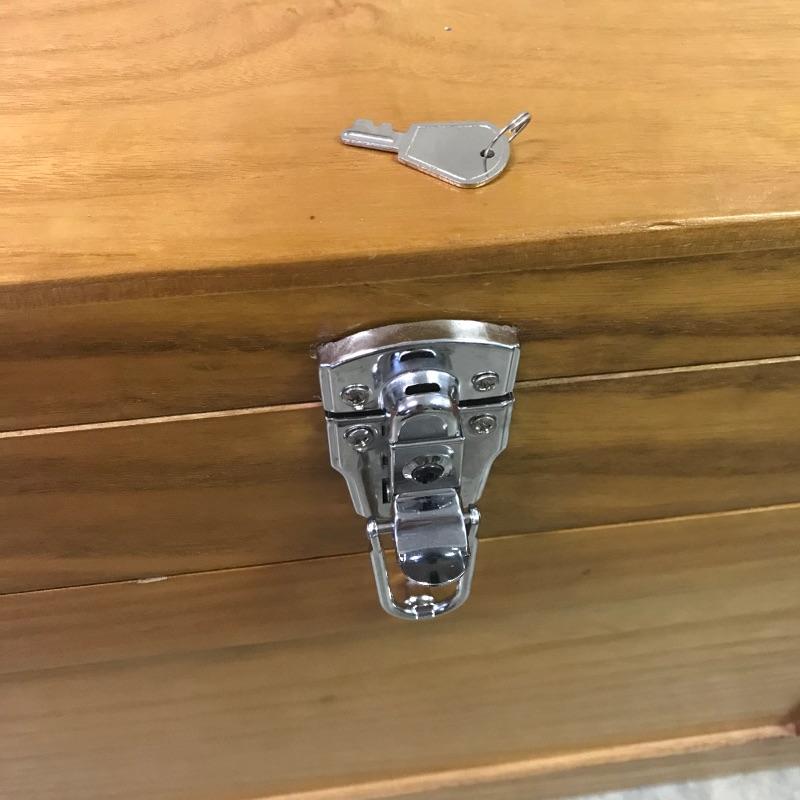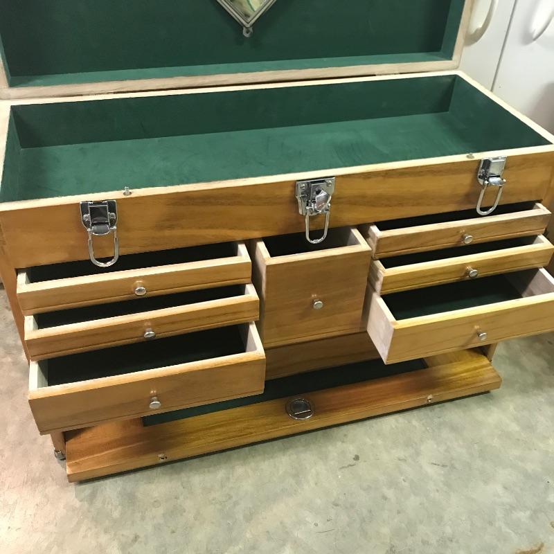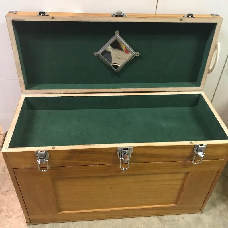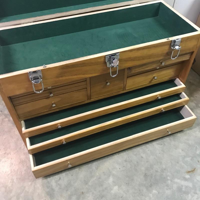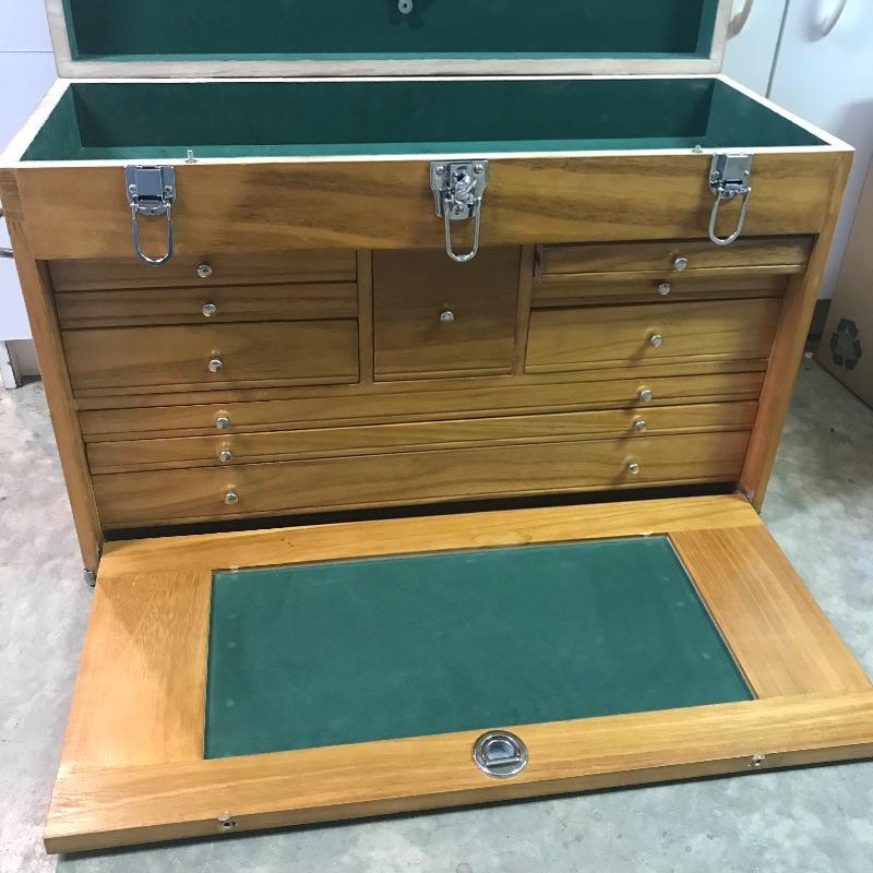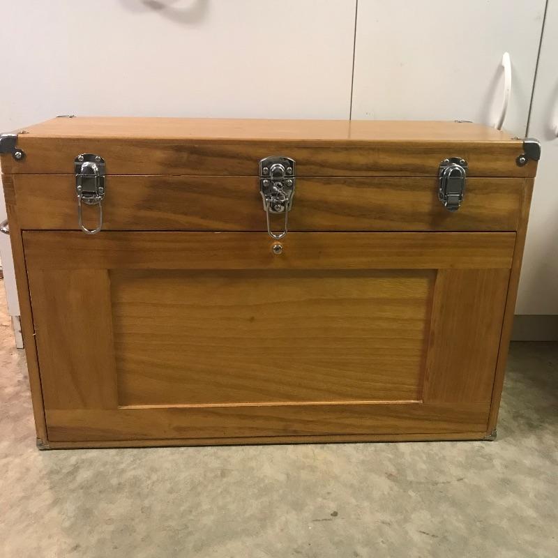 Ten drawer Windsor tool chest with felt lined drawers provides protected storage for your hand tools. The front panel folds down to reveal ten drawers, and the panel slides underneath the drawers which adds a layer of convenience. Pulls, lock with key, and side handles are a silver metal. Piece measures approximately 26” x 10.5” x 17”. See photos. Some blemishes are found, but piece is in overall great shape. No shipping.