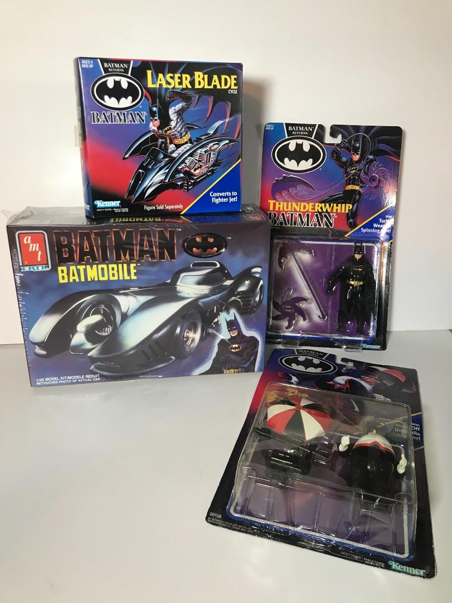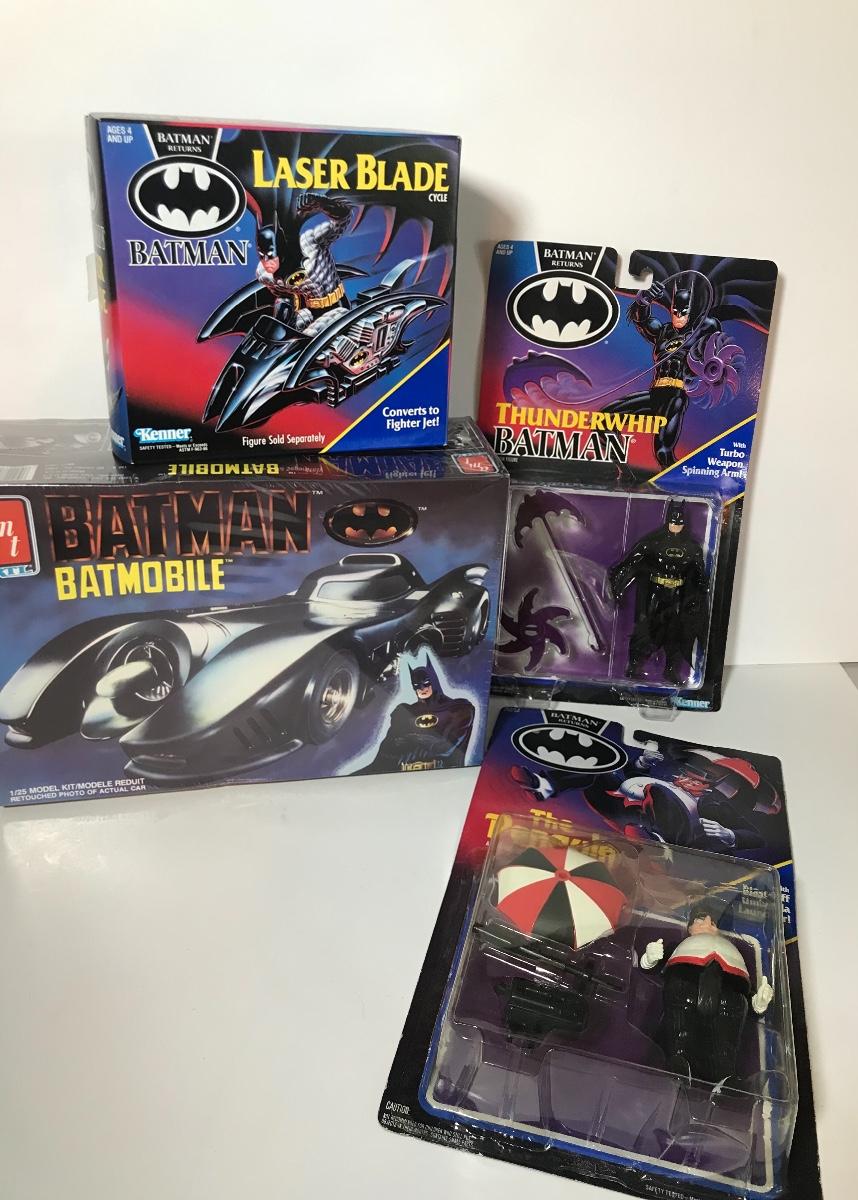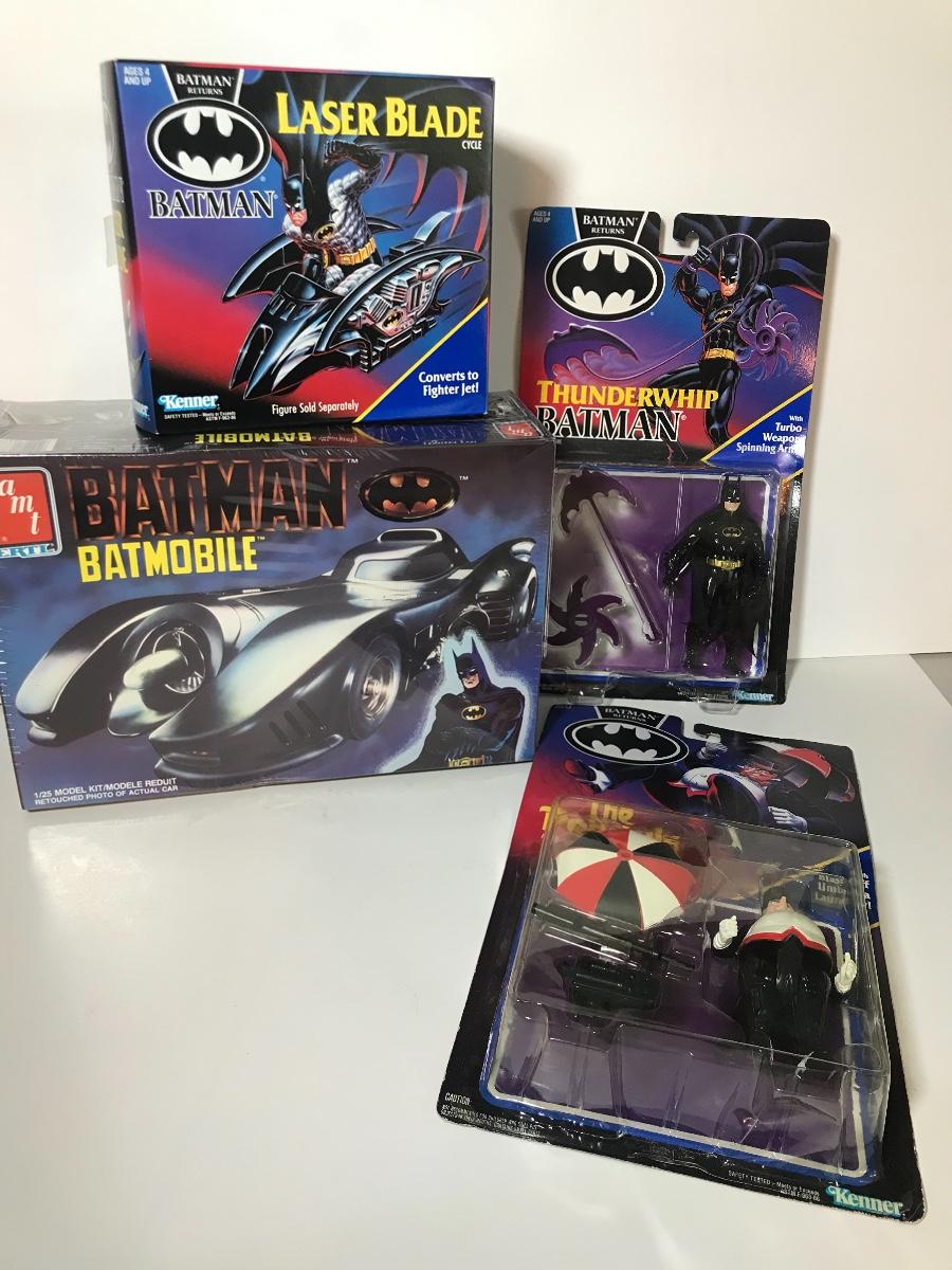 Batmobile model, Batman Thunderwhip, a Laserblade Cycle, and The Penguin with umbrella. All in original package. Please see all pictures as they are the best representation of the items. The pictures show condition, measurements if taken, and what is included in the lot. Due to the large amount that we photograph and the time frame, we are not always able to take measurements. All items unless noted, are pre-owned and have been used. If you purchased furniture, you must bring help. We do not allow one person to carry large furniture out on their own. Bring help, tools and a truck for the safety of our client’s homes, and your personal safety. Company policy. Thank you.