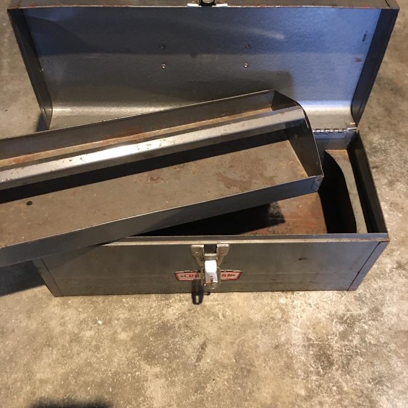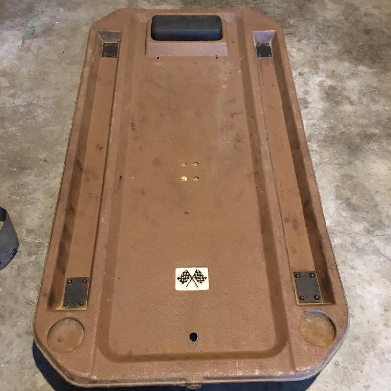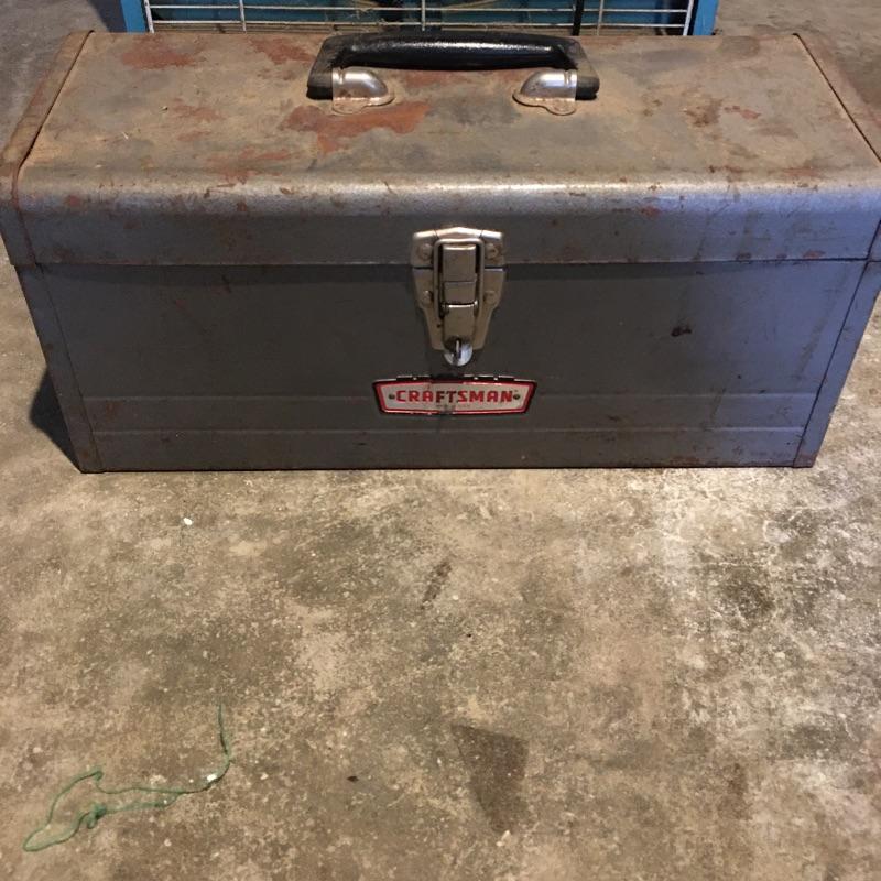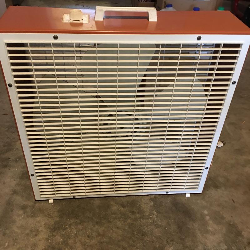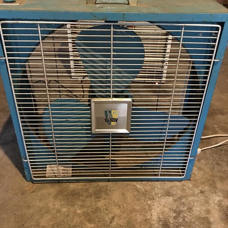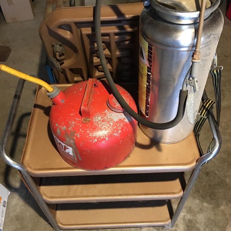 Vintage fans and more. Lot includes Emerson Electric box fan, unbranded box fan, Craftsman toolbox and creeper, metal gas can, TV Trolly and a Chapin stainless steel sprayer.