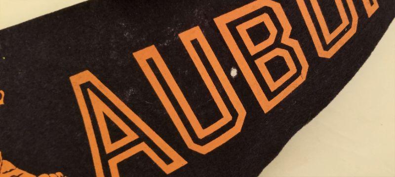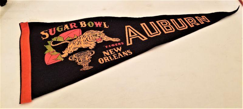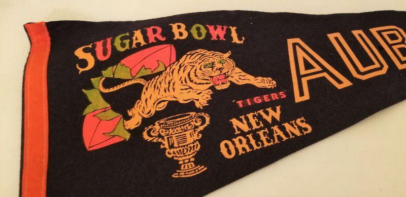 Vintage New Orleans Sugar Bowl Pennant - Tigers - Auburn. 29" long. NOTE: Note small moth hole in pennant - see photo.