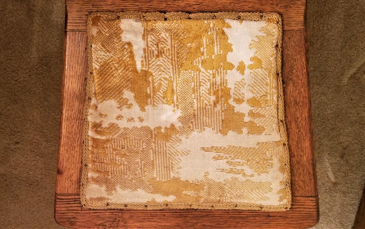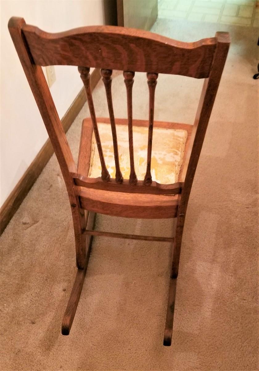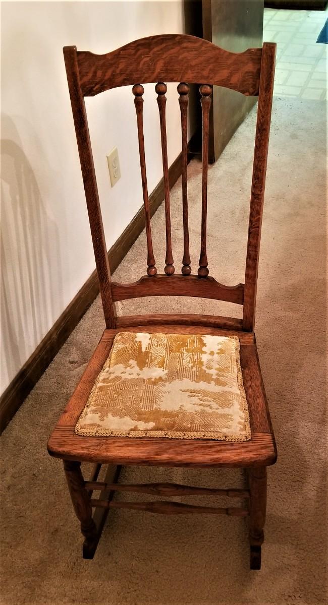 Cute little antique rocker - all original - solid oak. 36" tall, 15" across the back. Seat can be reupholstered - has original fabric.