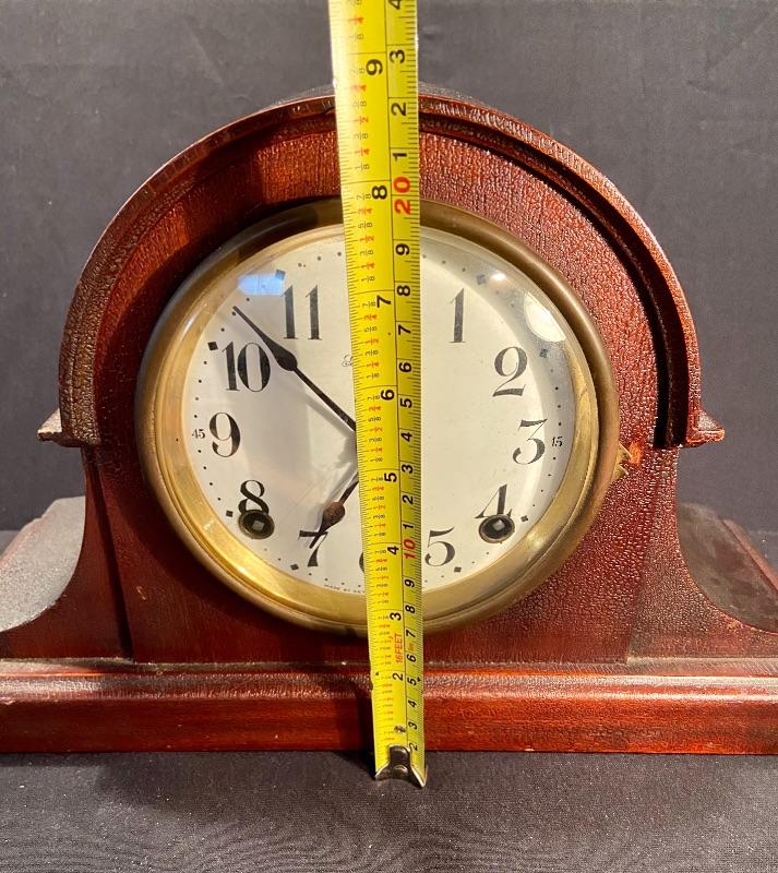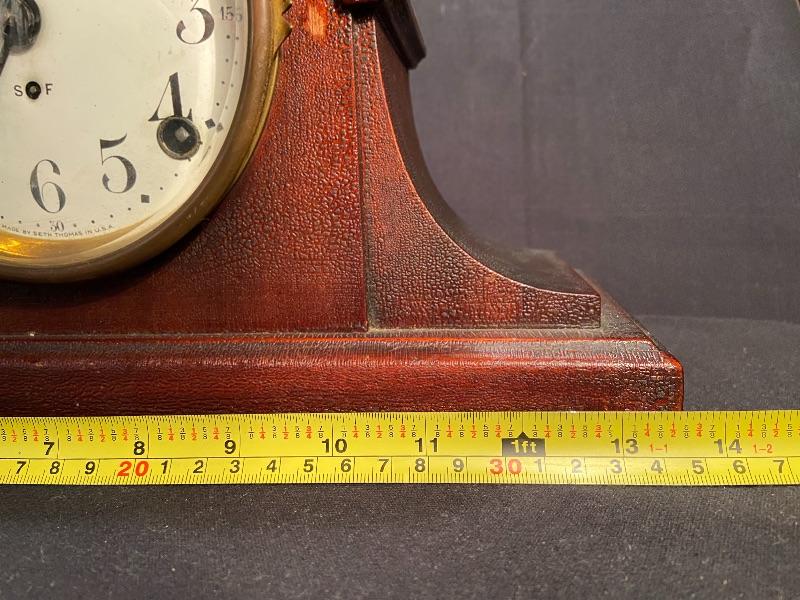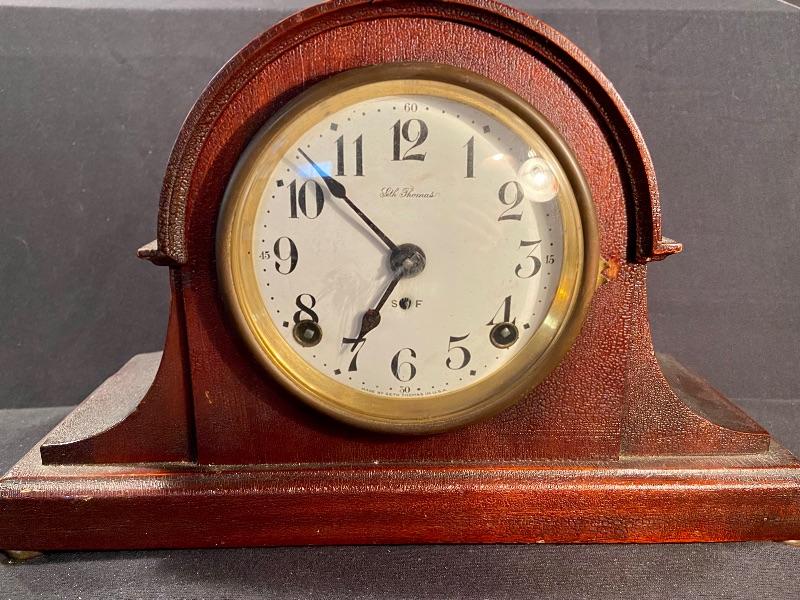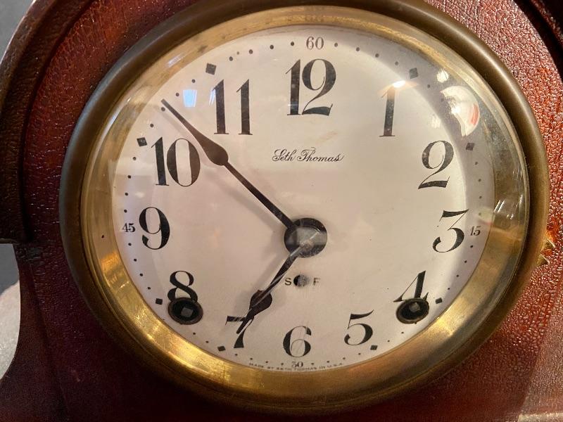 Vintage Seth Thomas clock with no key or pendulum and in working condition. Please see pictures for sizing. MHW Please see all pictures for content of the lot, condition of the lot, and measurements if taken. Pictures are the best representation of the items listed and items are untested unless indicated in description. Thank you for looking and have fun bidding!