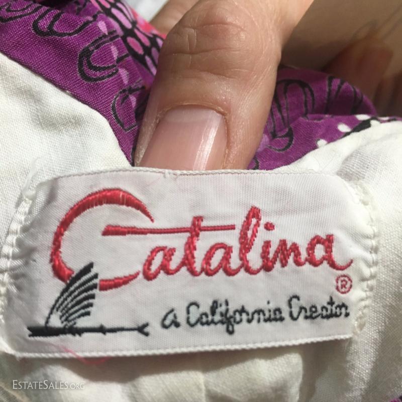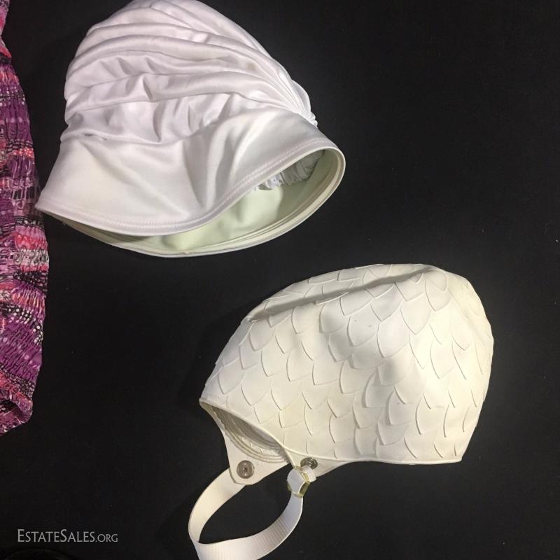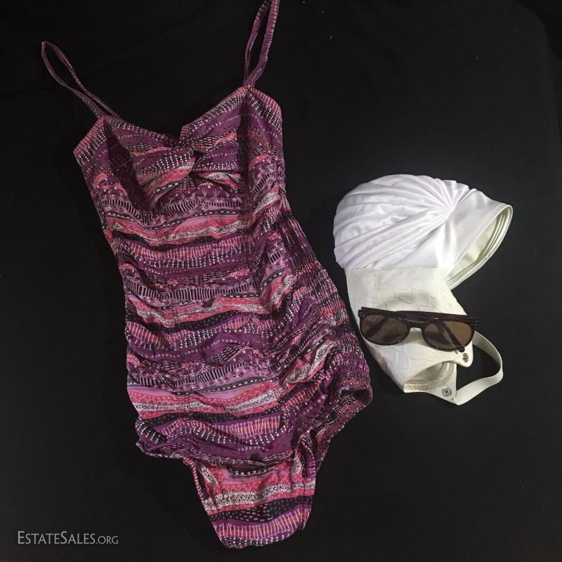 Vintage purple swimsuit in size 14/16. Two white swim caps. Liz Claiborne sunglasses.