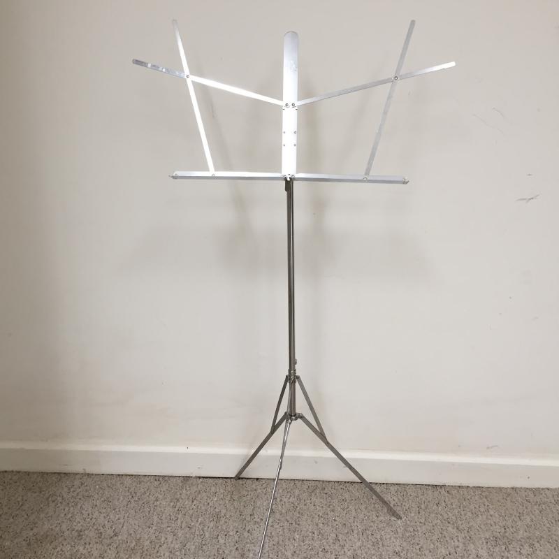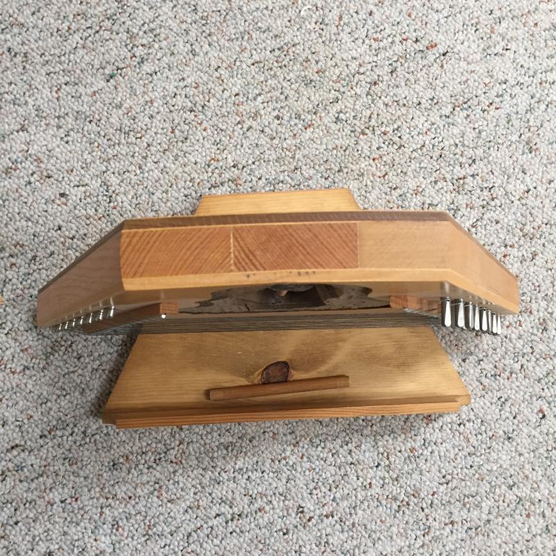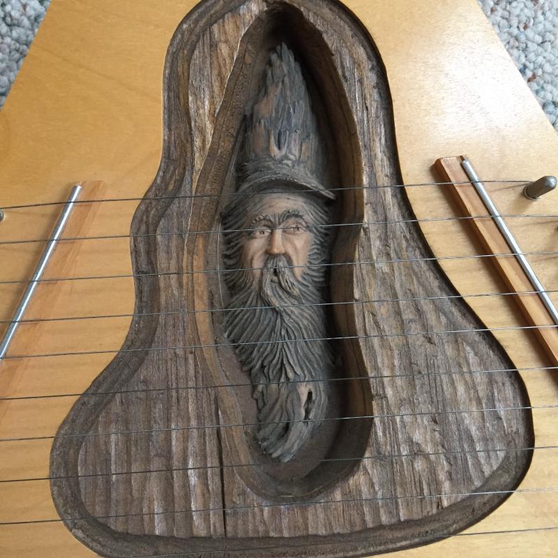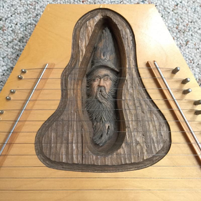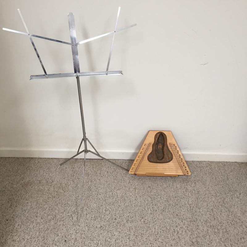 Zither with unique inset design and collapsible music stand. Zither Measures 15.5” at Bottom 5.5” At Top. 10.75” Tall. You will be the hit of the party with your Zither.