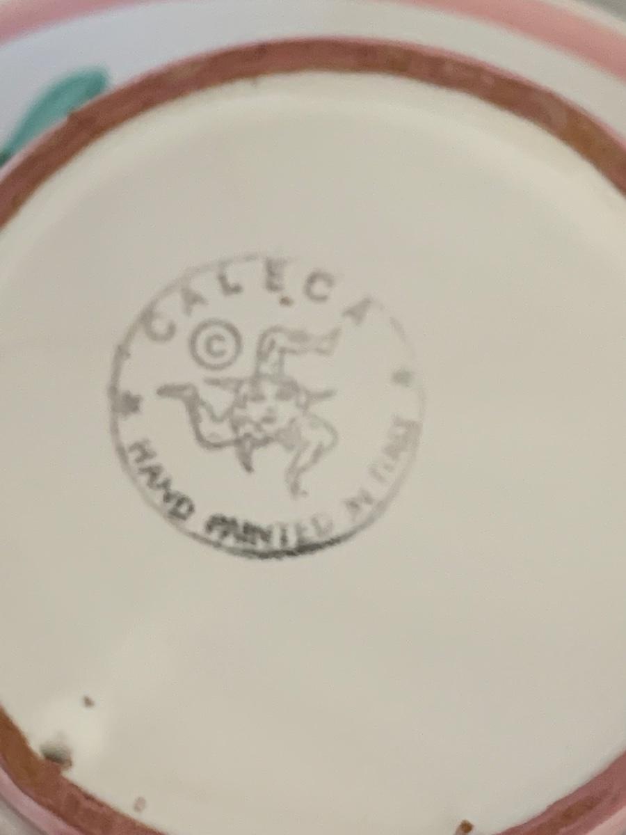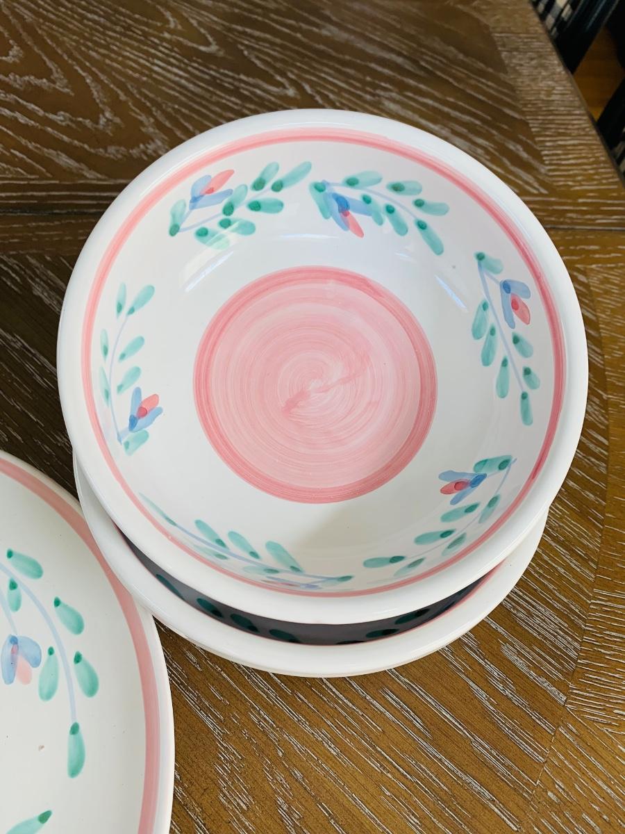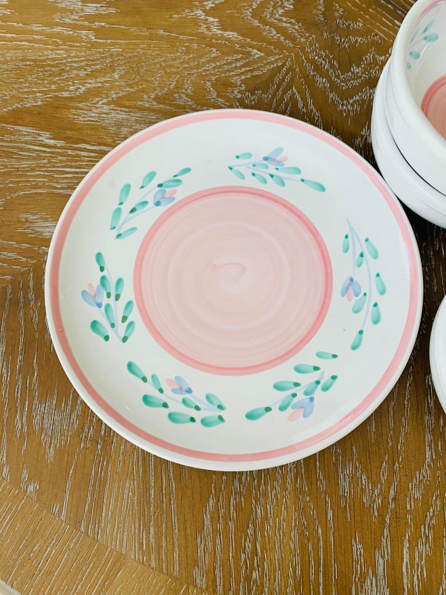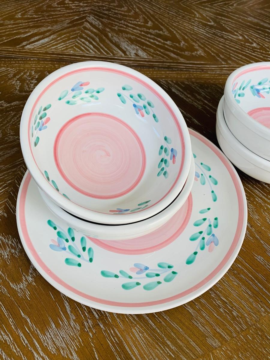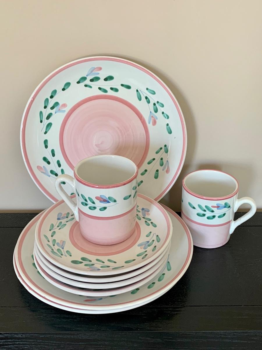 Caleca Italian Pottery Bowl Pink White Green: 4 dinner plates & salad plates & 2 mugs.