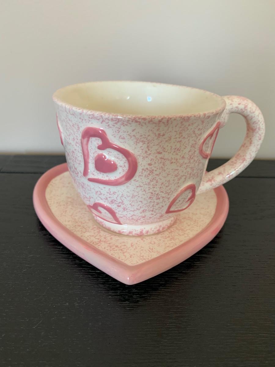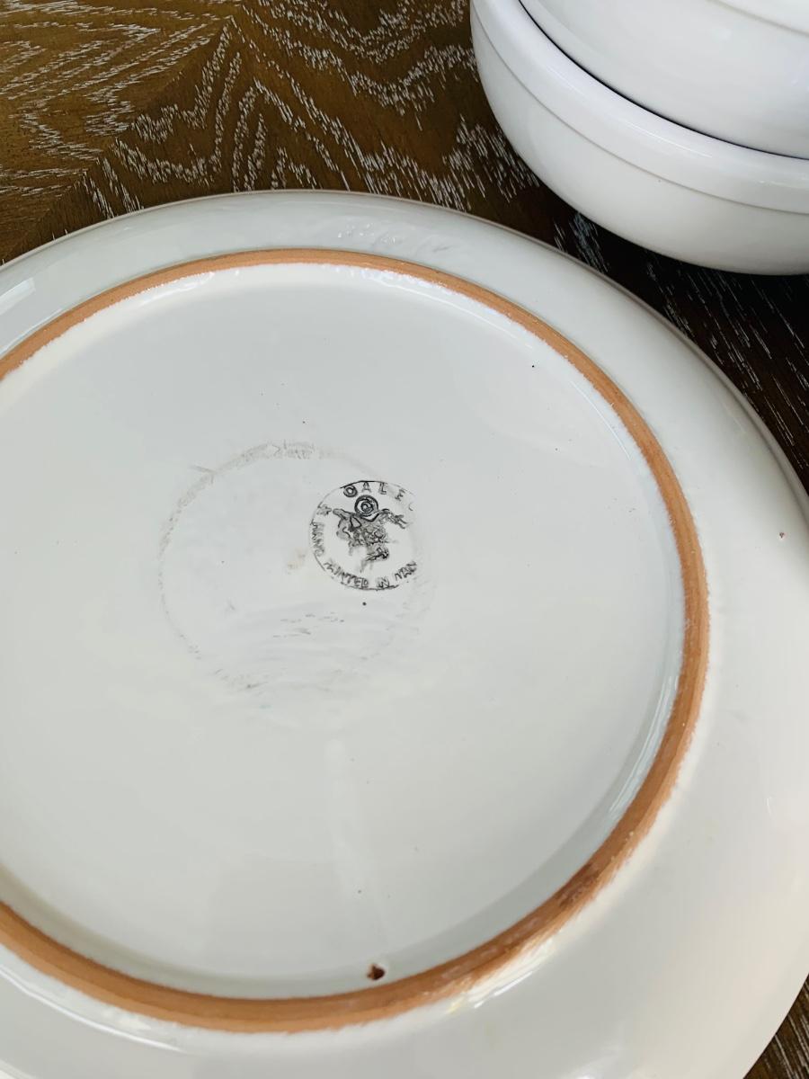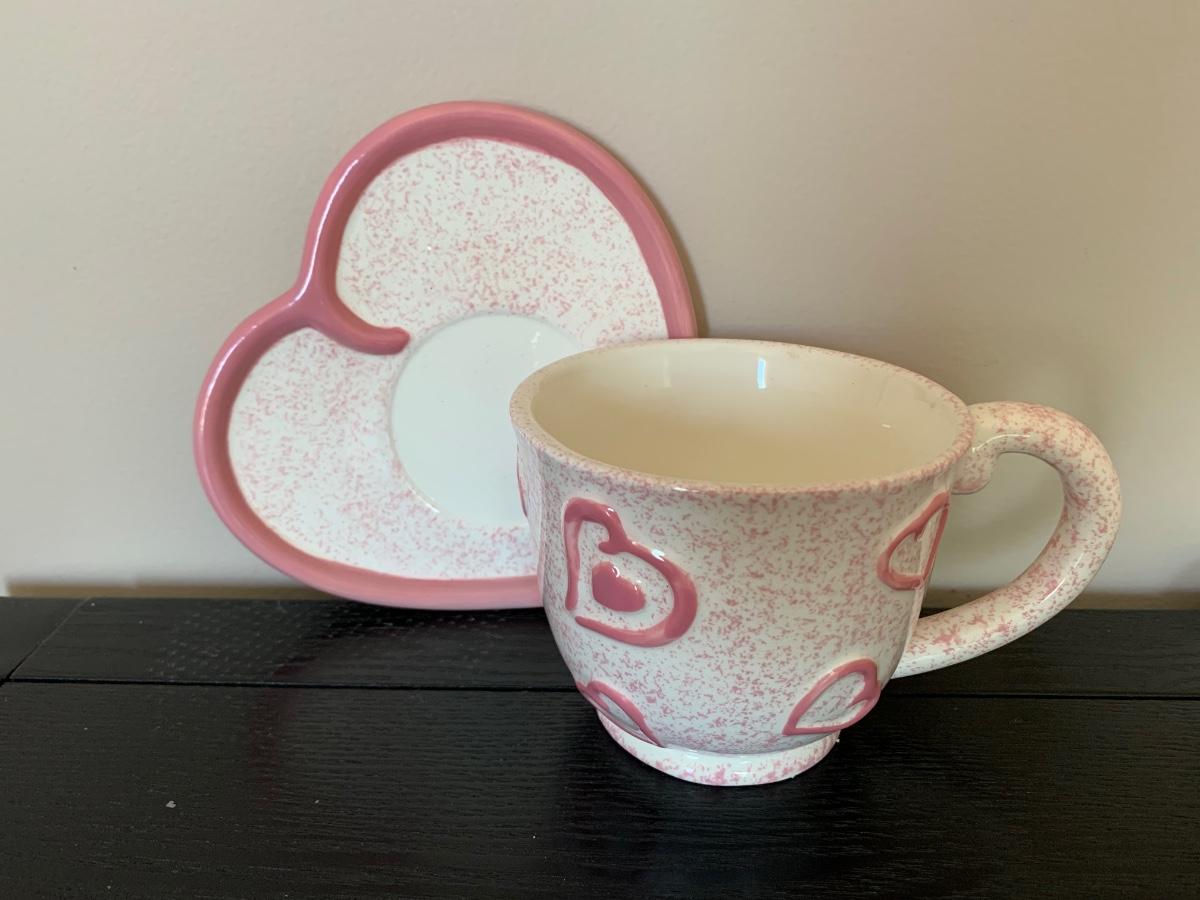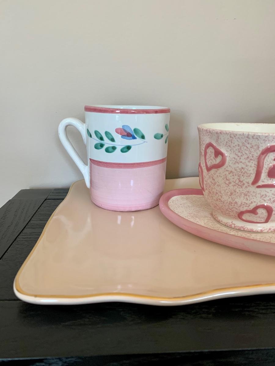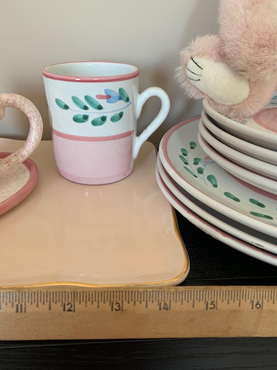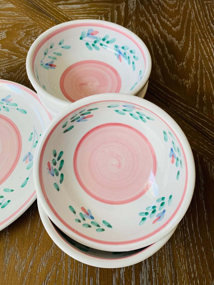 Caleca Italian Pottery Bowl Pink White Green: 4 dinner plates & salad plates & 2 mugs.