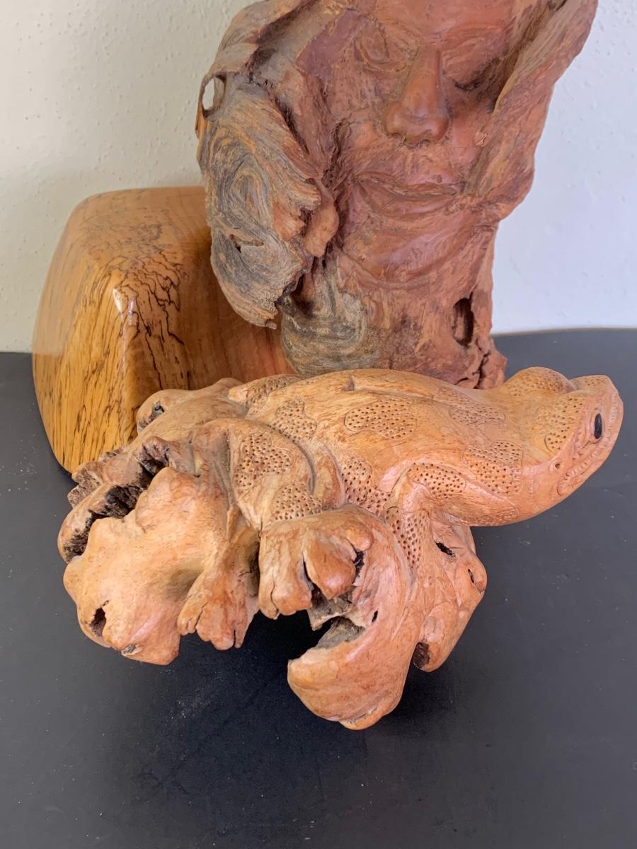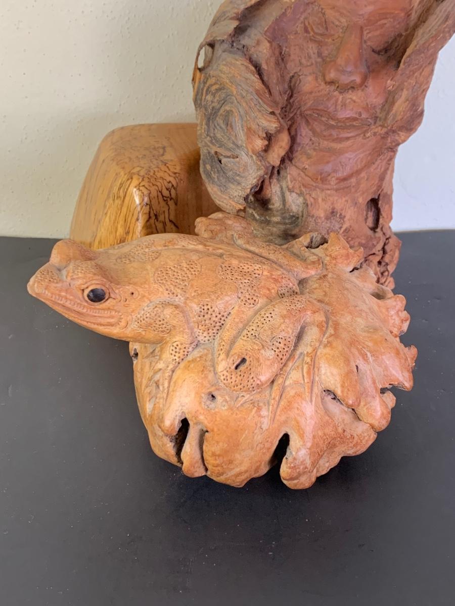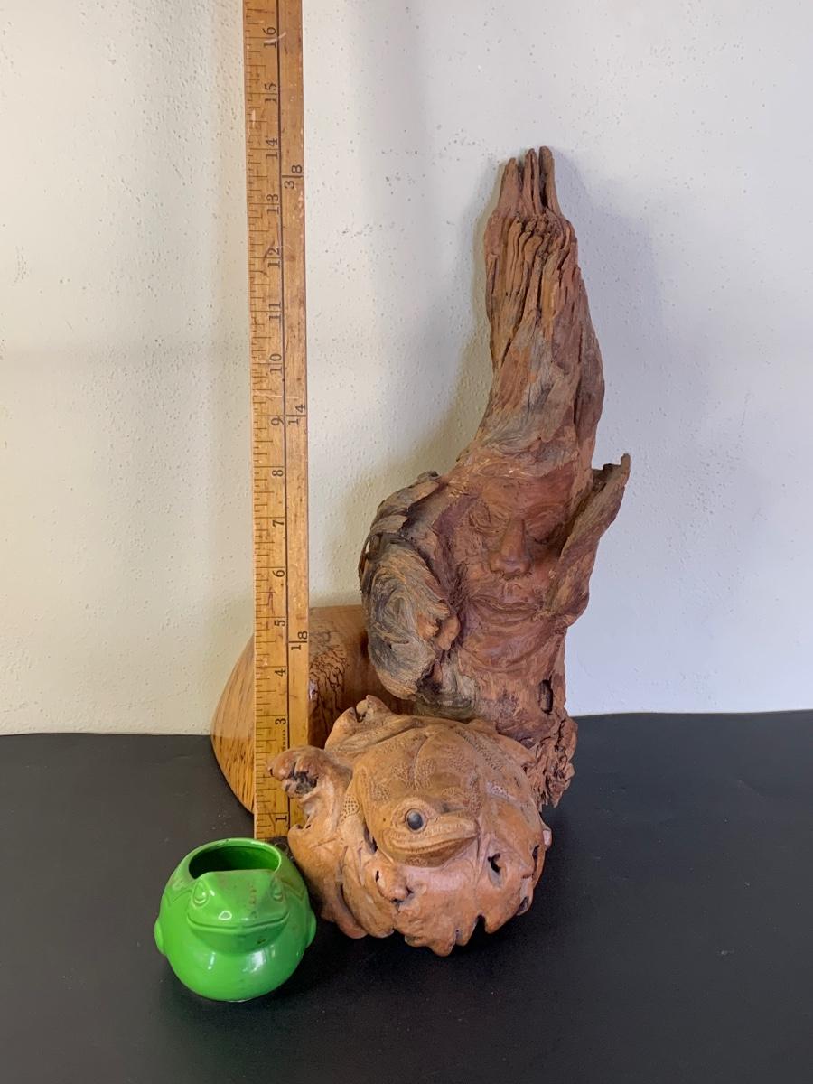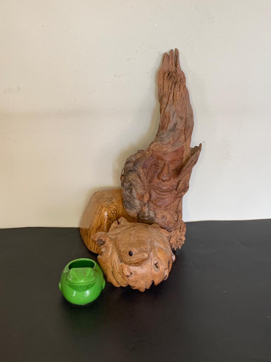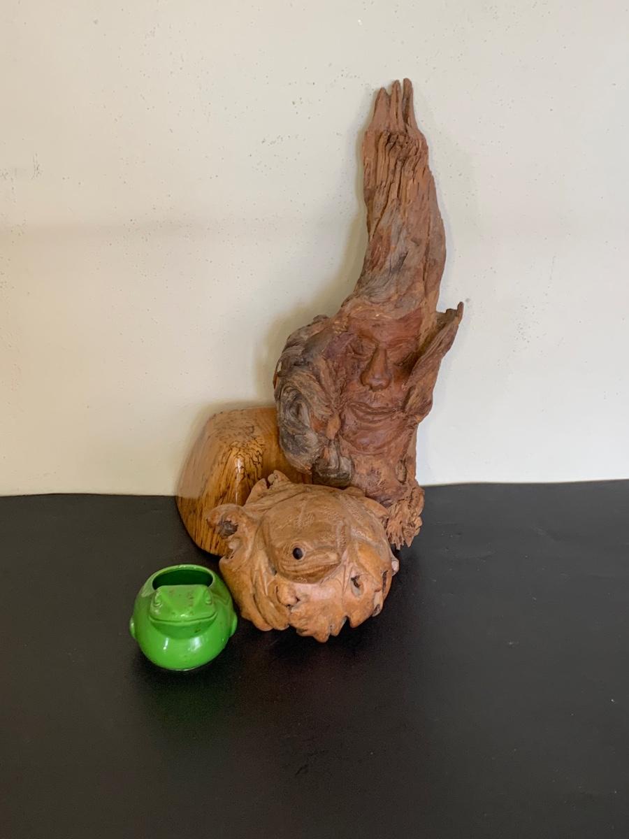 Lot 176R: Carved Tree Face, Carved Frog, Polished Wood Block