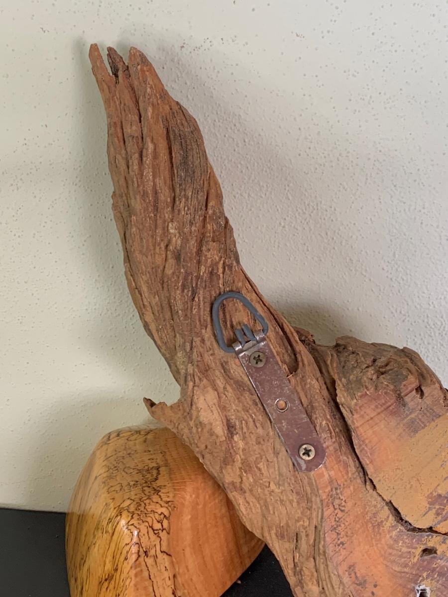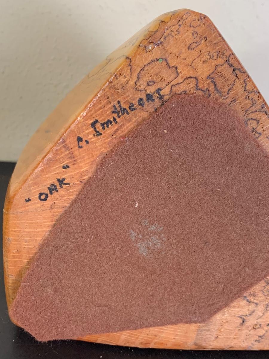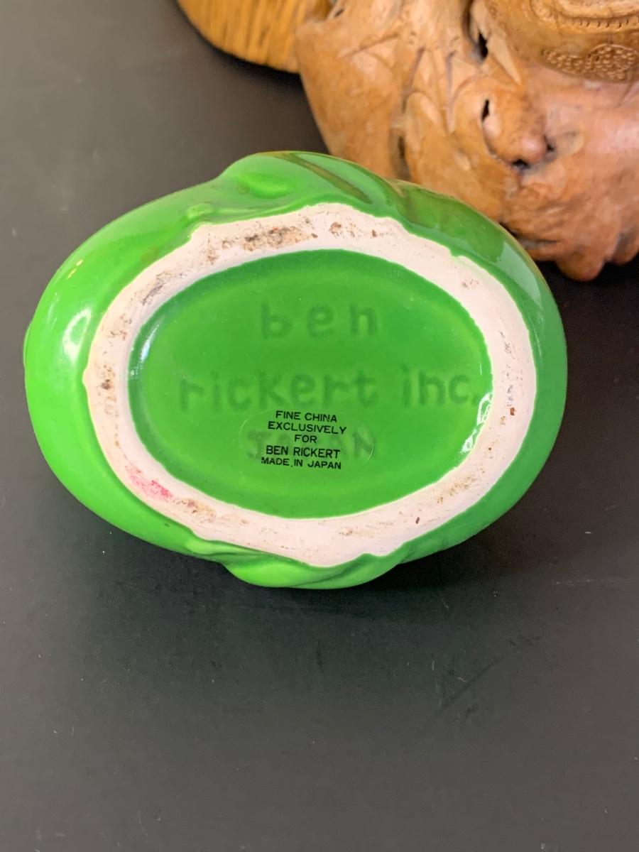 Includes two carvings and an unusually shaped polished wood block. also includes a small green Ben Rickert Inc ceramic frog.