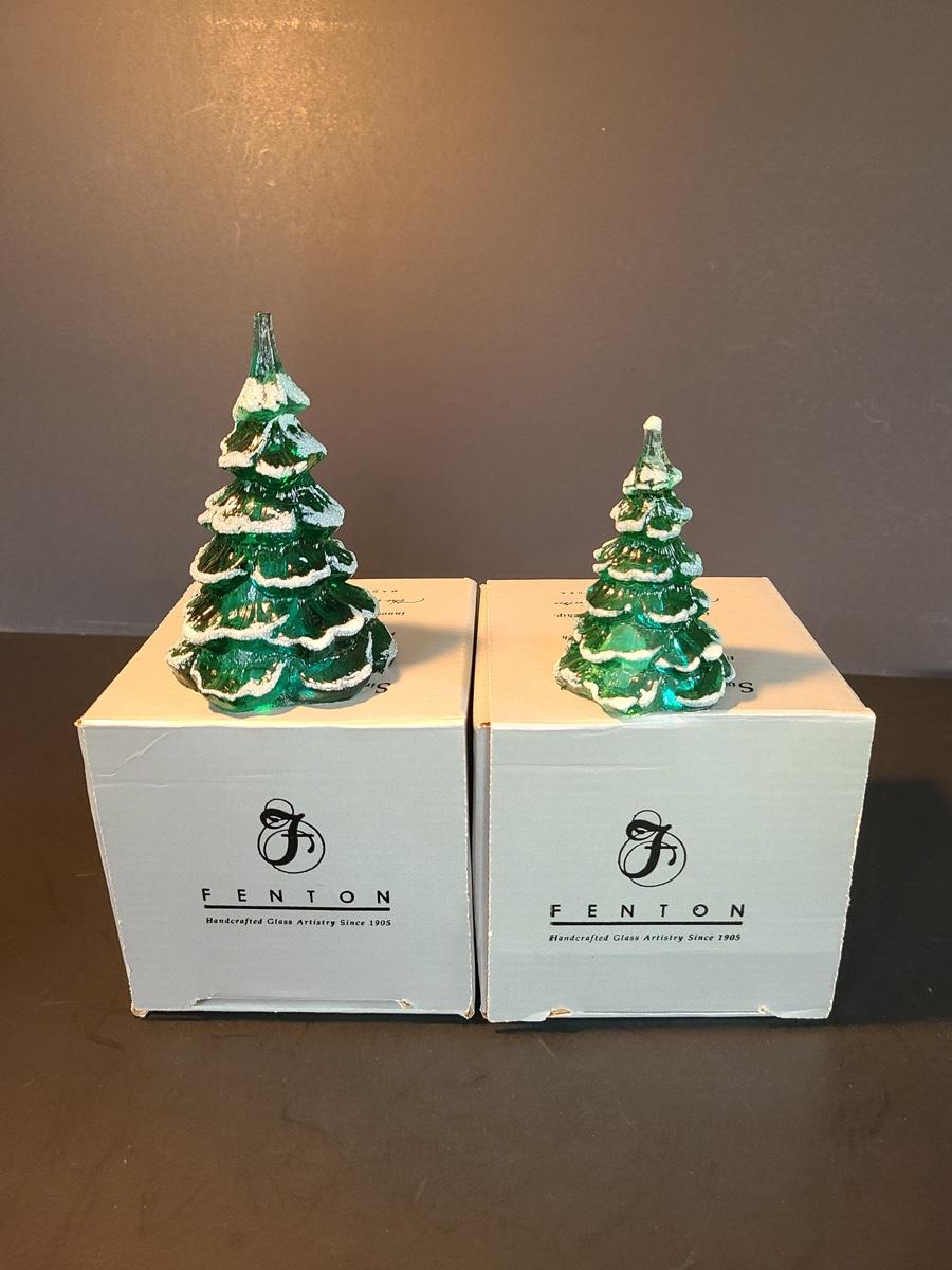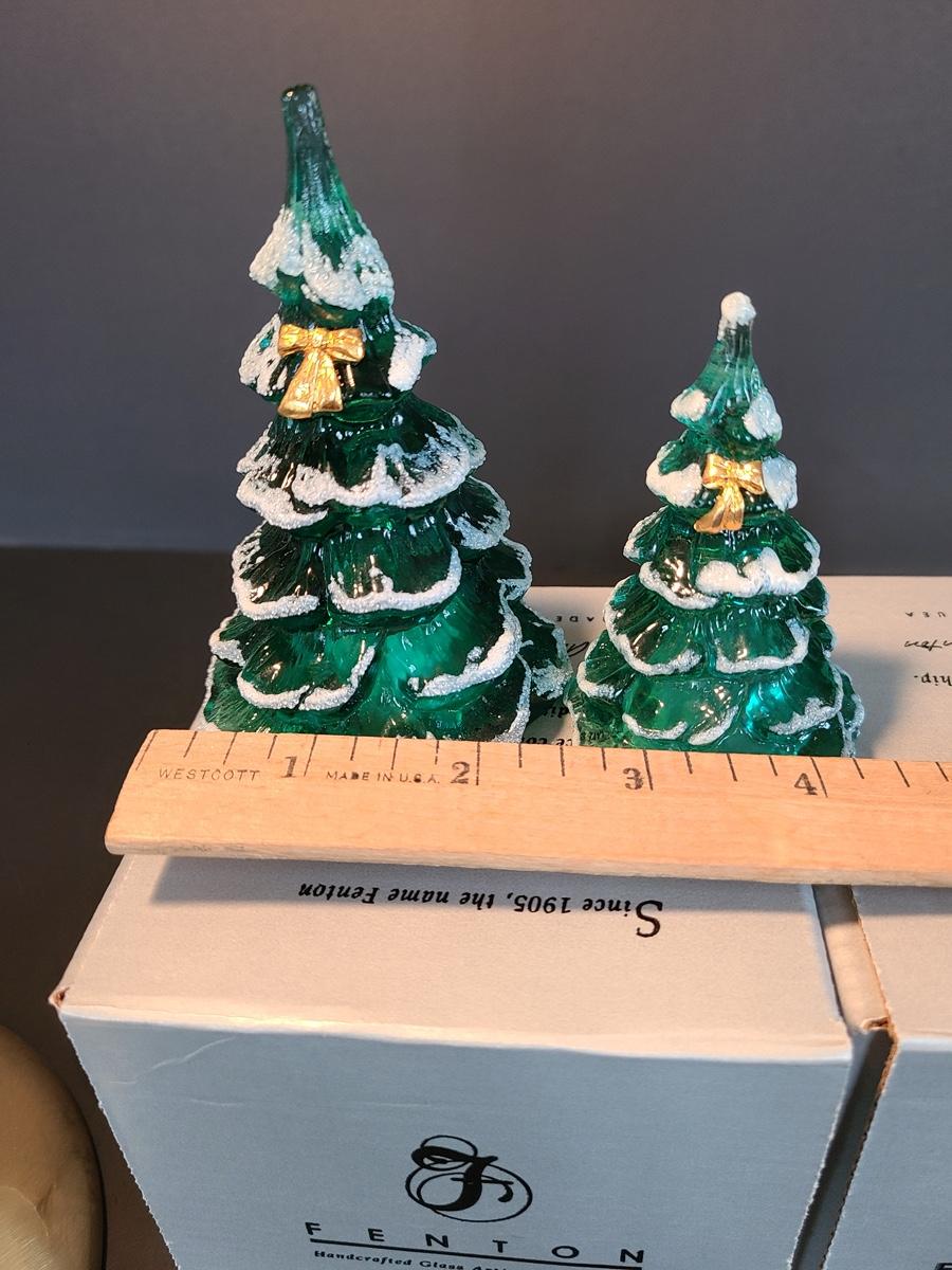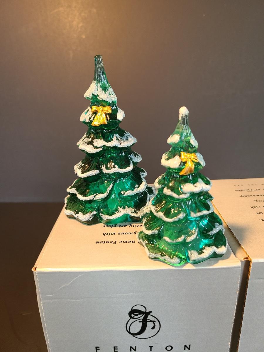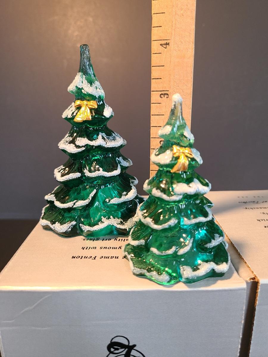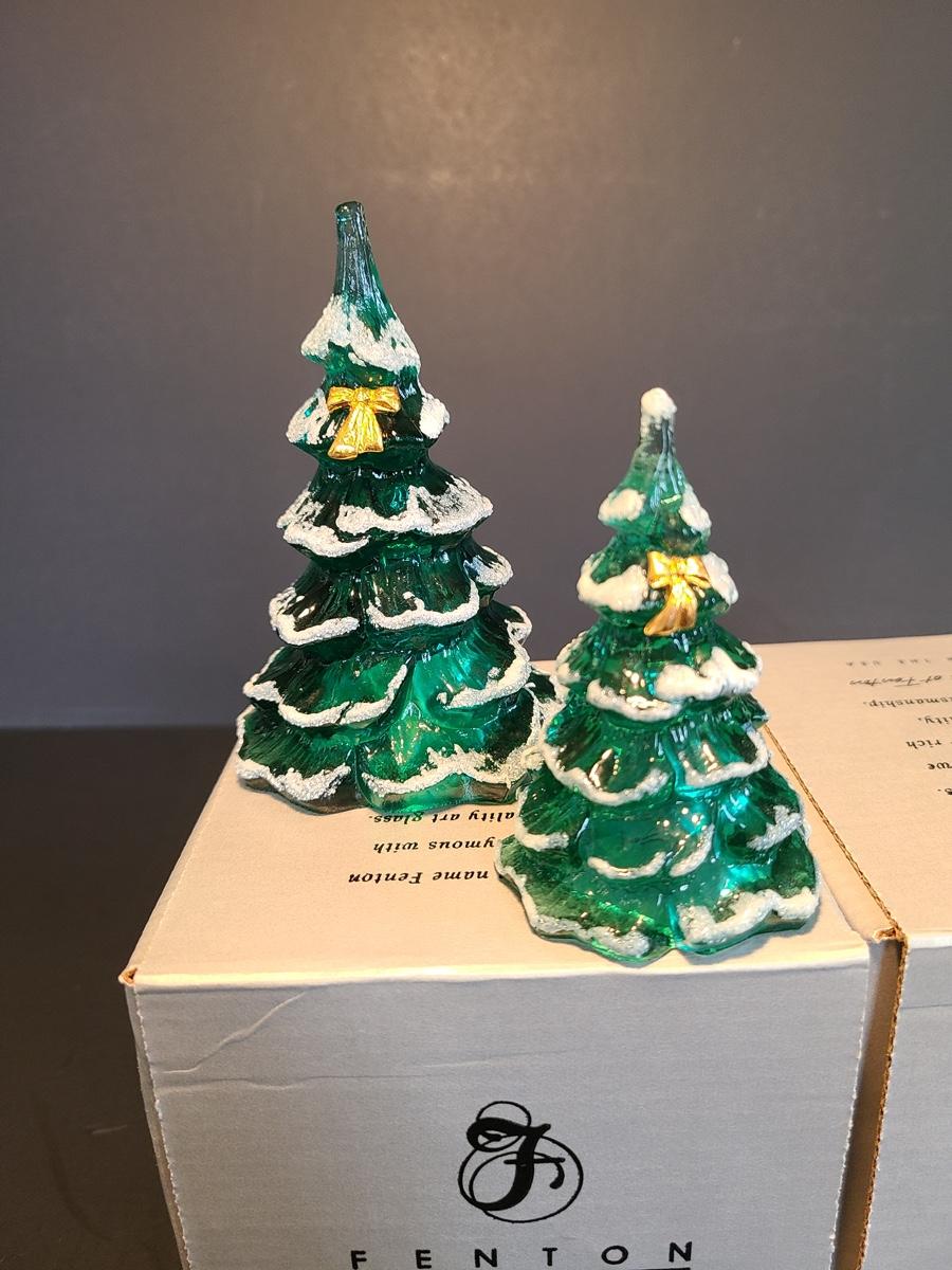 Lot 177: Fenton Emerald Green Trees Med & Small with Gold Bows. (HTF)