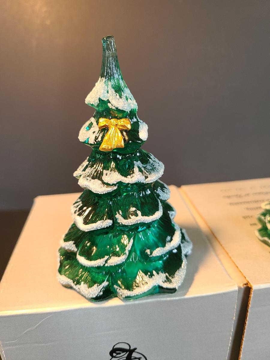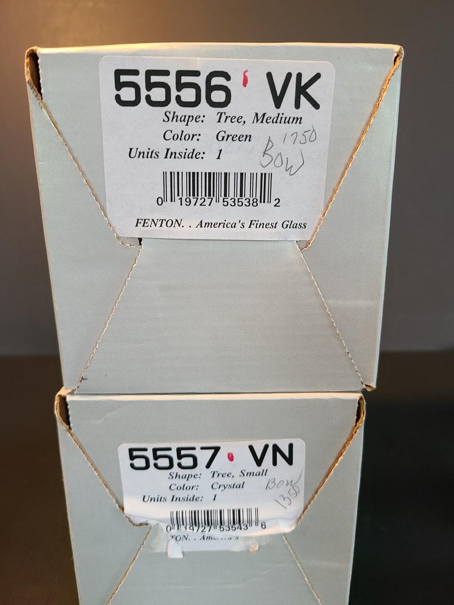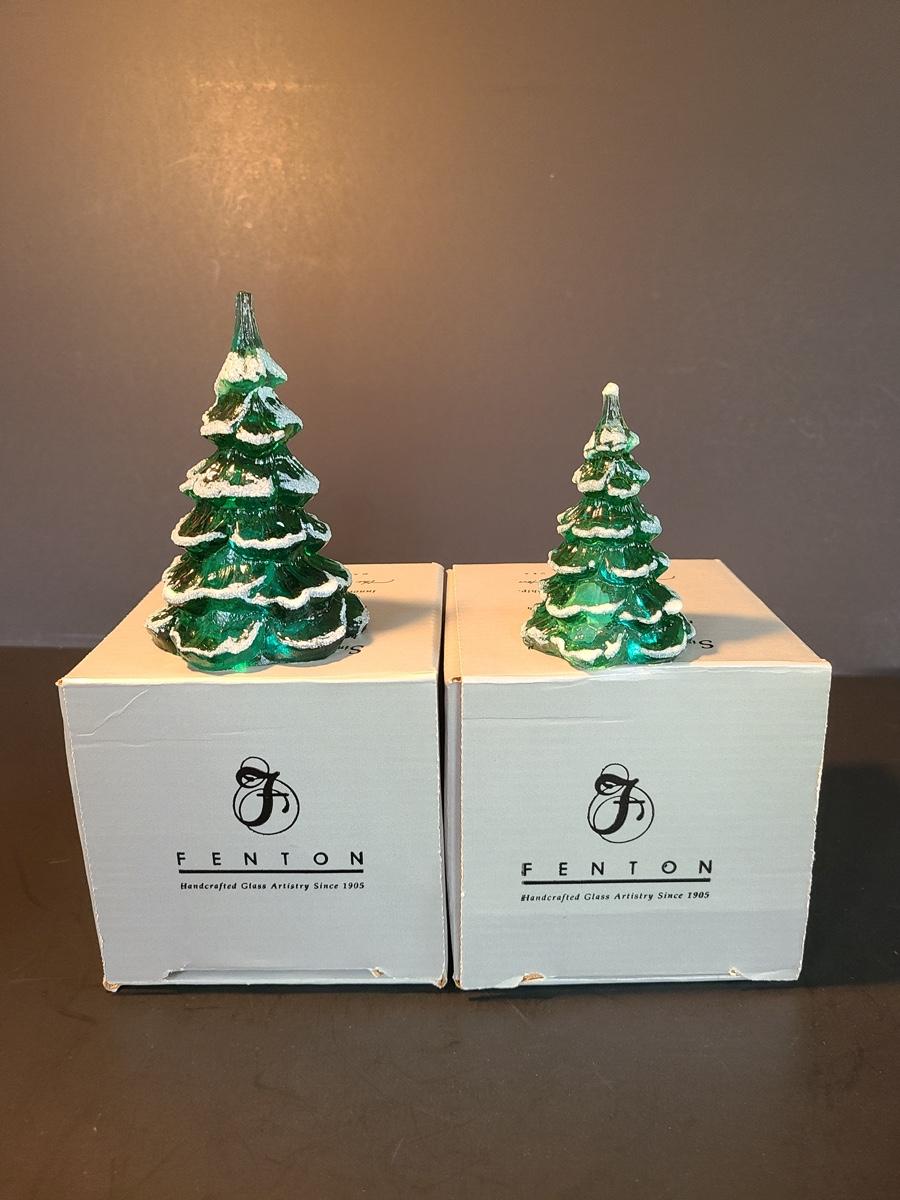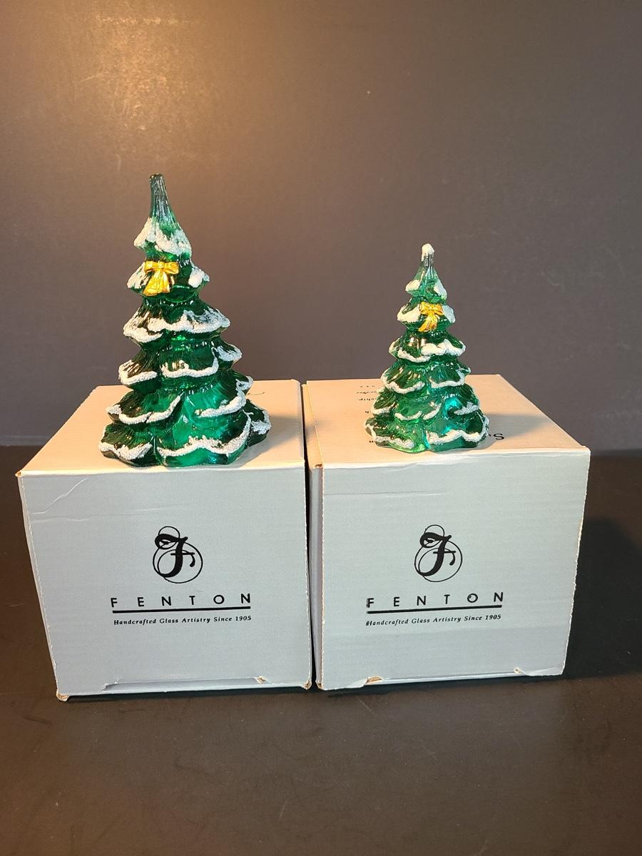 Lot 177: Fenton Emerald Green Trees Med & Small with Gold Bows. (HTF)