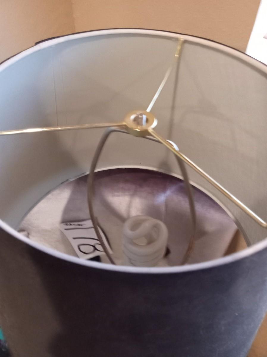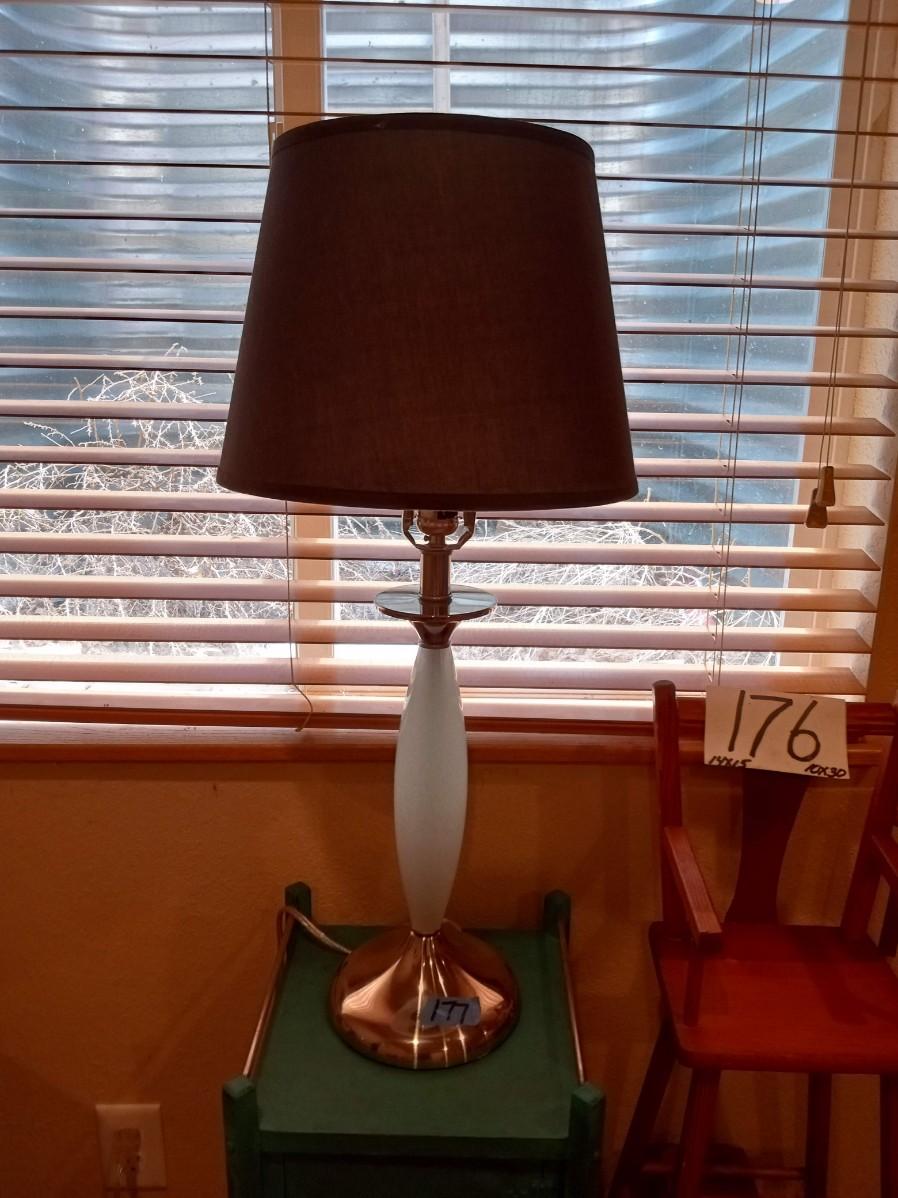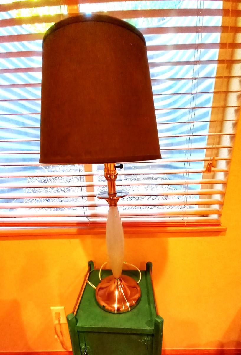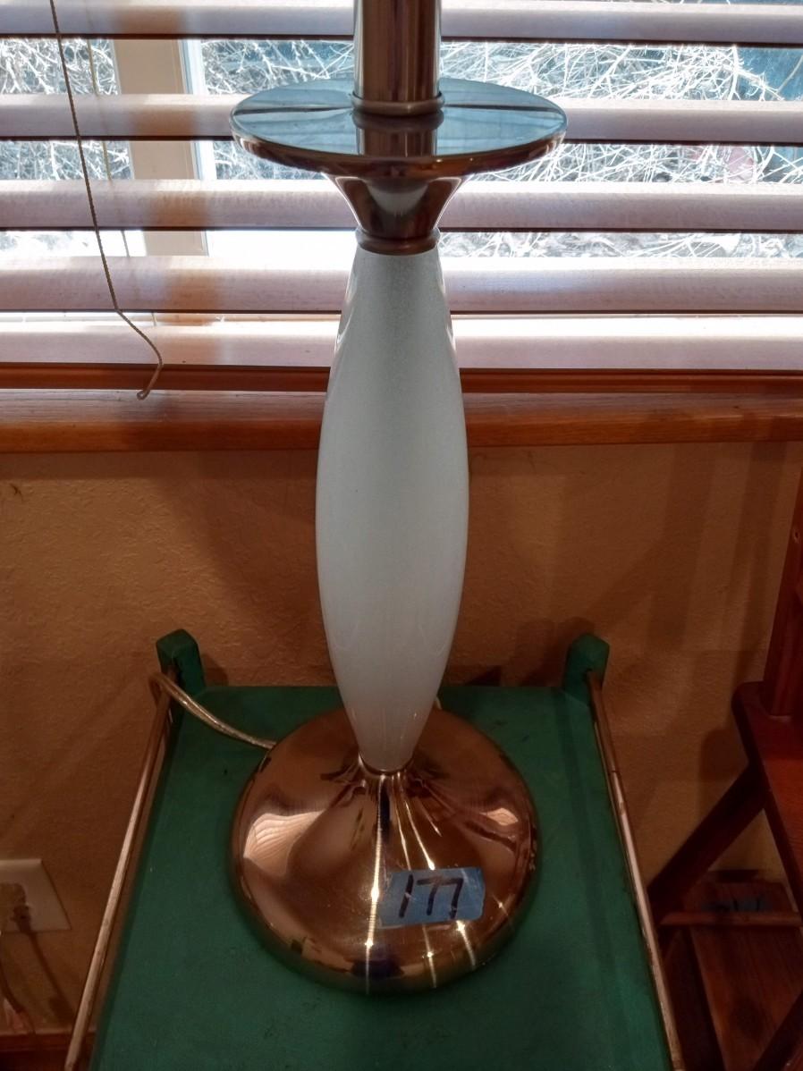 THE LAMP HAS A LIGHT GREEN GLASS BASE AND MEASURES 28" TALL, IT IS MISSING ITS FENIAL