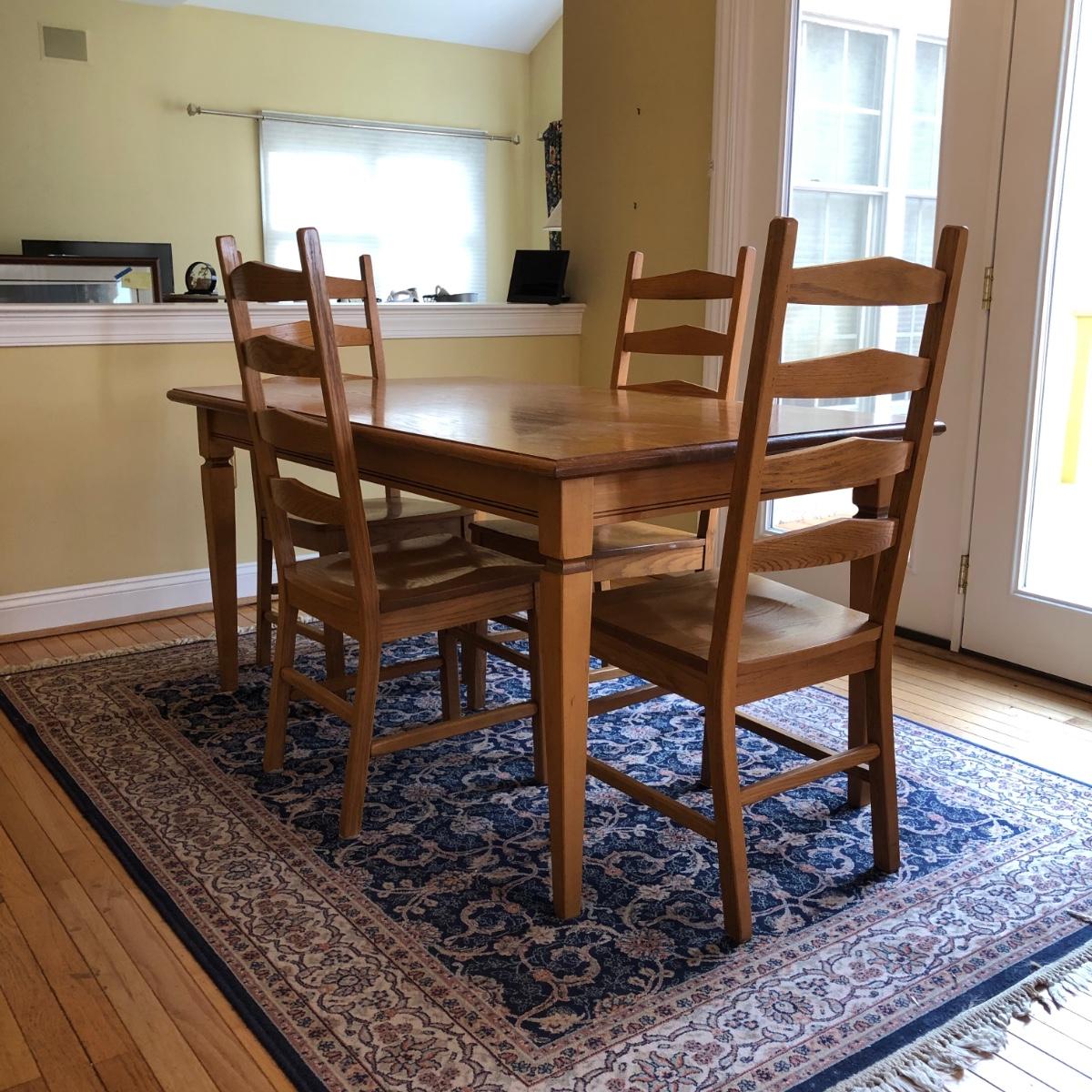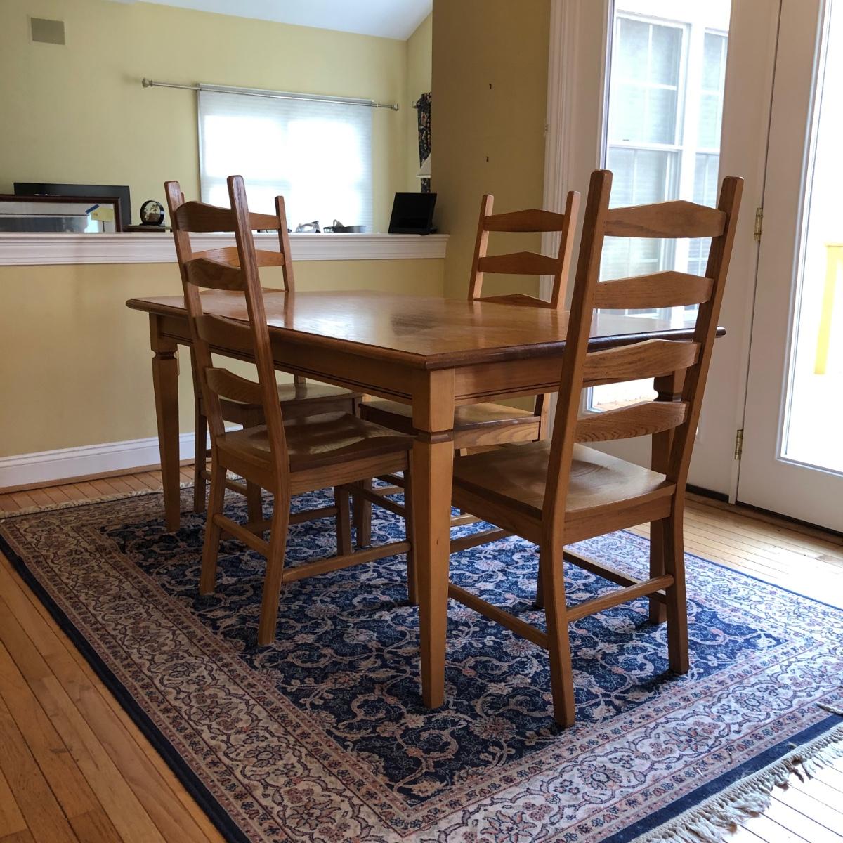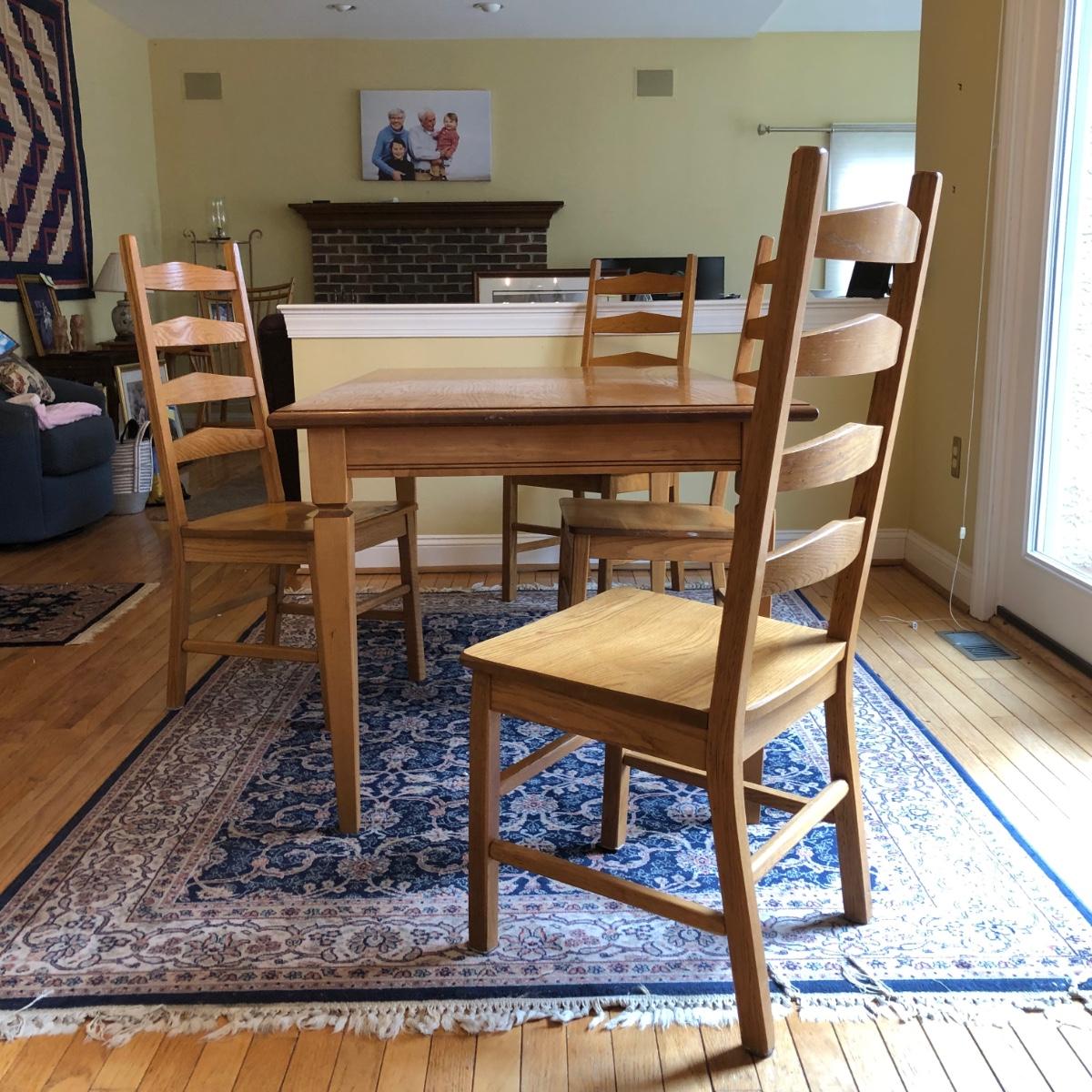 Oak table measures 59W x 35D x 30H. Chairs measure 16W x 17D x 43H. Four chairs included.