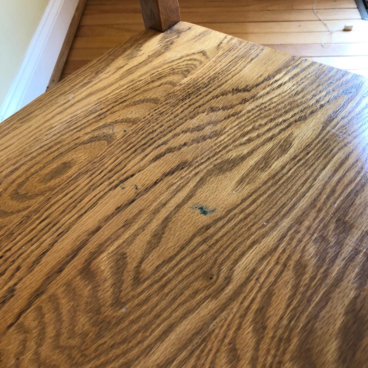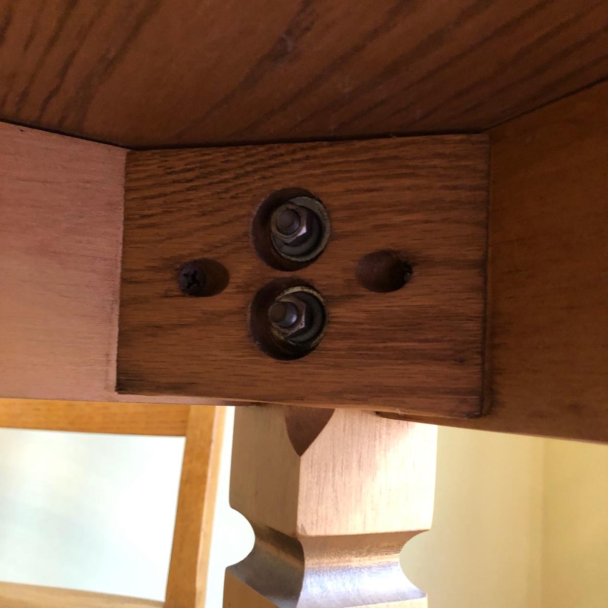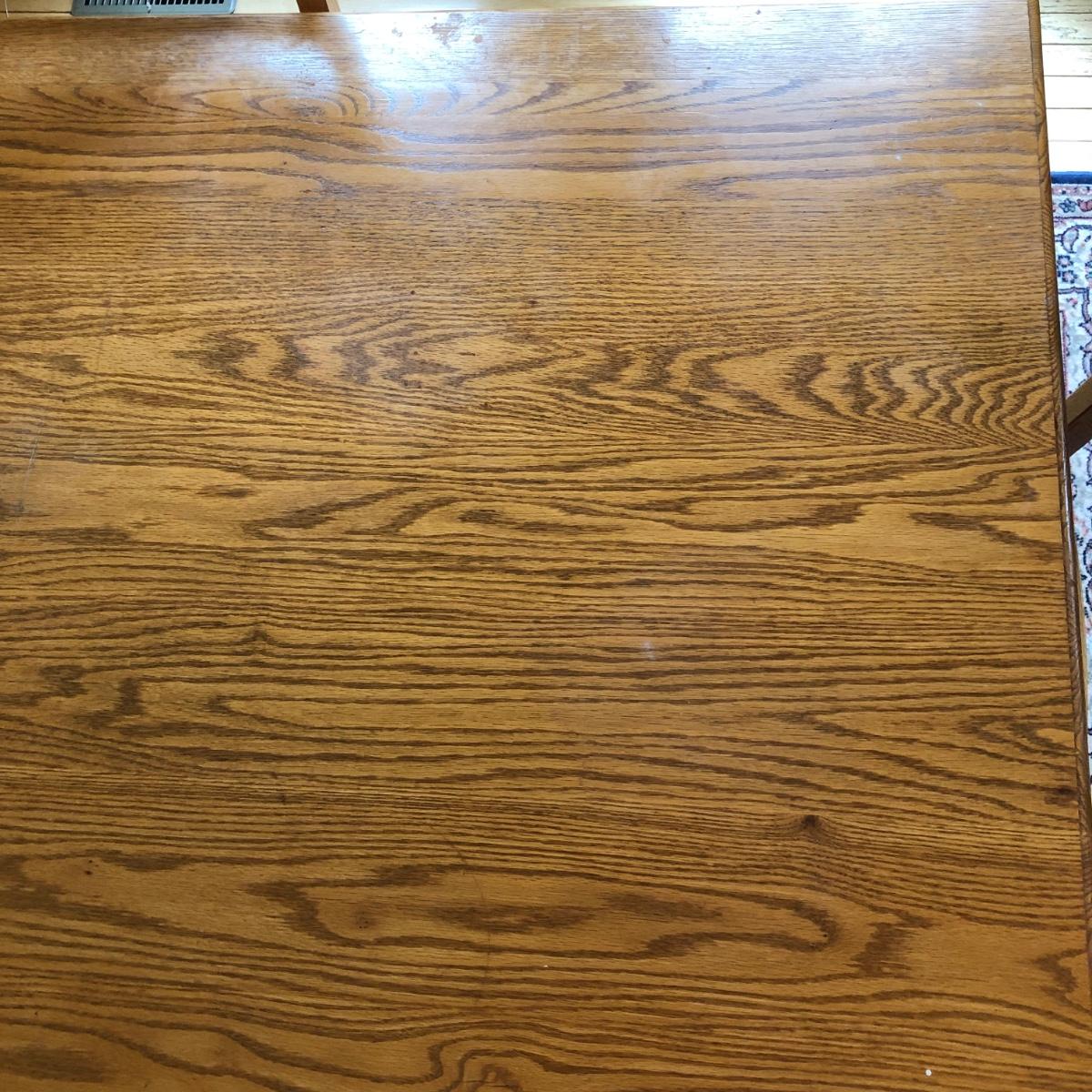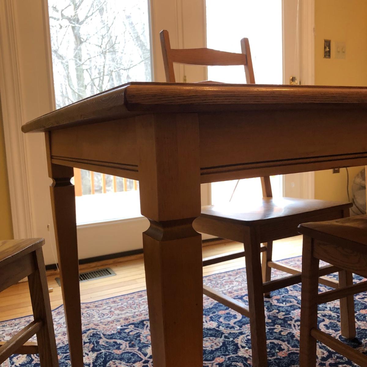 Oak table measures 59W x 35D x 30H. Chairs measure 16W x 17D x 43H. Four chairs included.