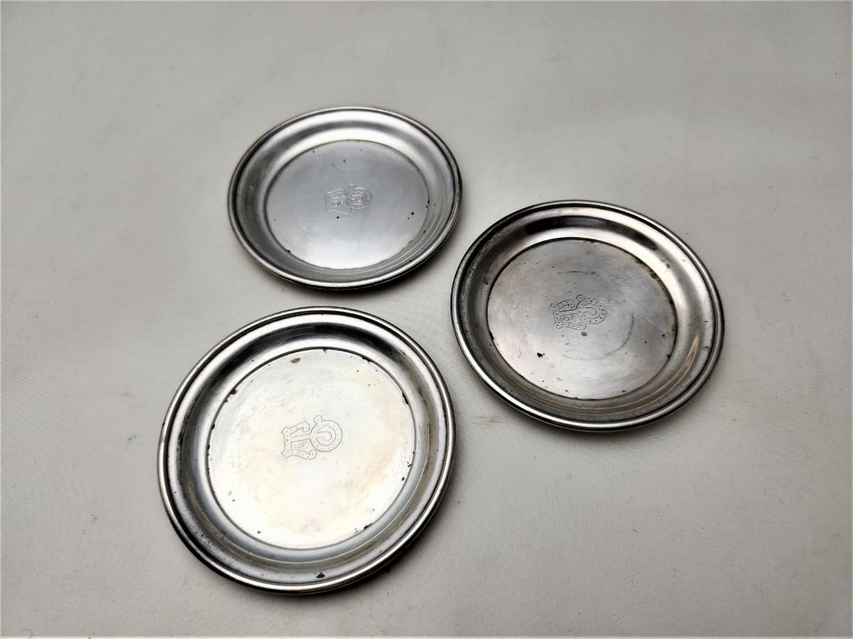 Three undated E of O (Elves of Oberon) sterling silver (S. Kirk and Son - ADLER) dishes - use as coaster, nut dish, ashtray. Each measures 3 inches across. These aren't flimsy - they have a little weight to them. Vintage condition. The opening bid is probably about the scrap price.