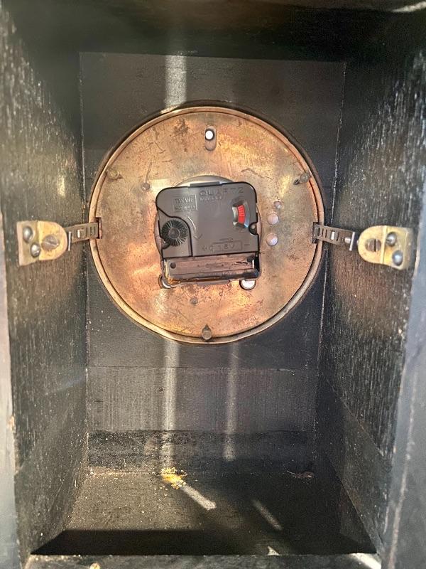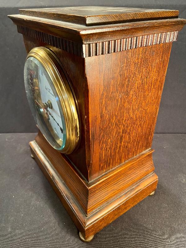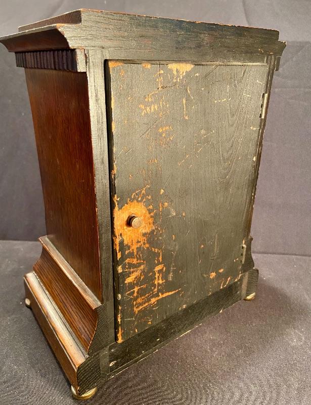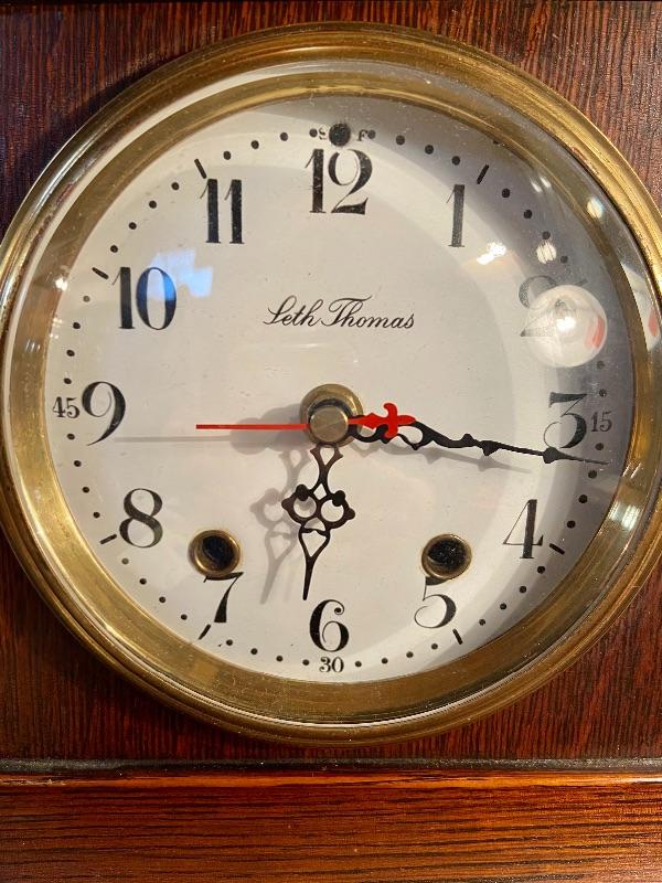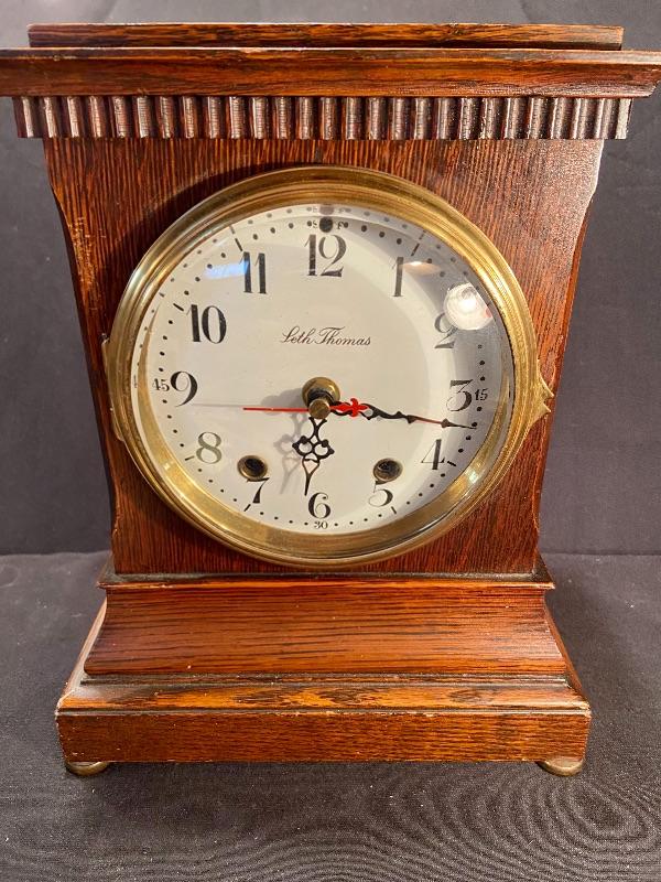 Seth Thomas clock with antique wood case with a modern battery case to function the clock. No key needed. See pictures for sizing. MHW Please see all pictures for content of the lot, condition of the lot, and measurements if taken. Pictures are the best representation of the items listed and items are untested unless indicated in description. Thank you for looking and have fun bidding!