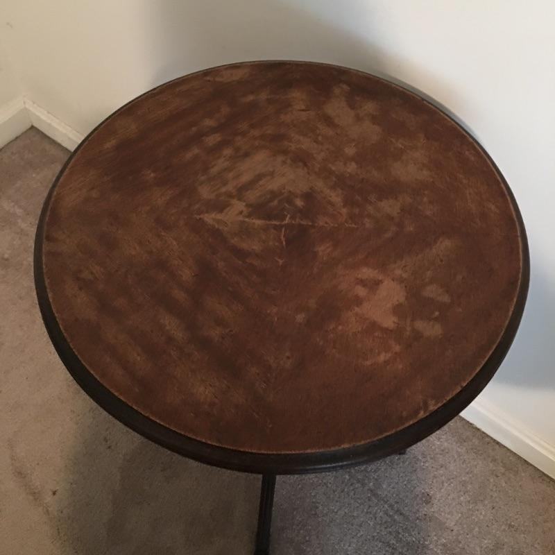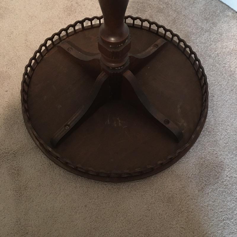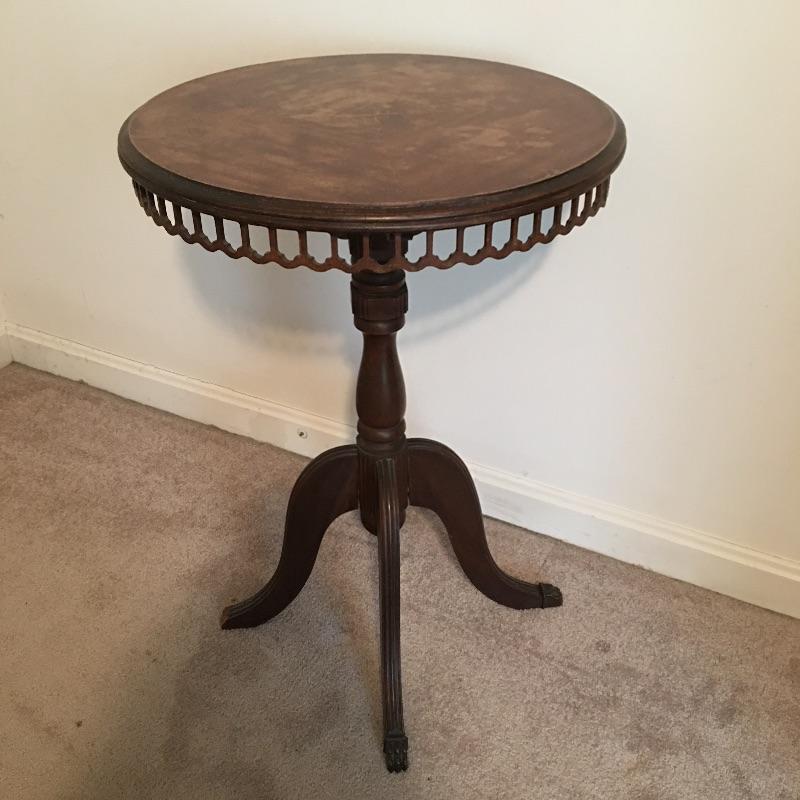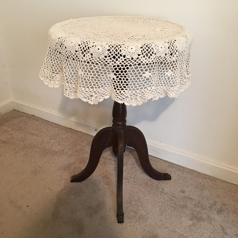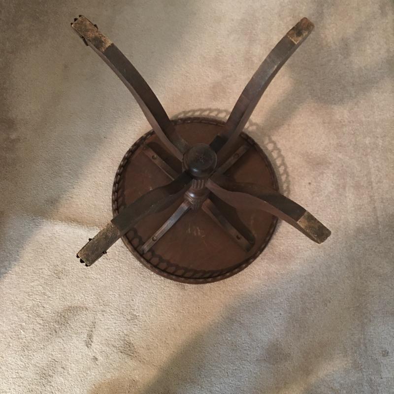 Wow! What a treasure find here! One small antique side table with a curved wooden trim under top and four legs. Table has been well loved and is missing two of the metal feet and the finish on top is worn, see pictures. A beautiful piece to use as is or refinish. Doily included. Table measures 18”D x 26” tall.